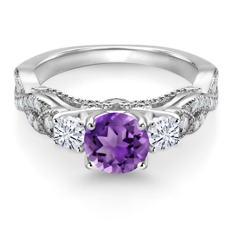 Gem Stone King 925 Sterling Silver Purple Amethyst and White Moissanite Engagement Ring For Women (1.47 Ct, Gemstone February Birthstone, Round 6MM and 3MM, Size 5)