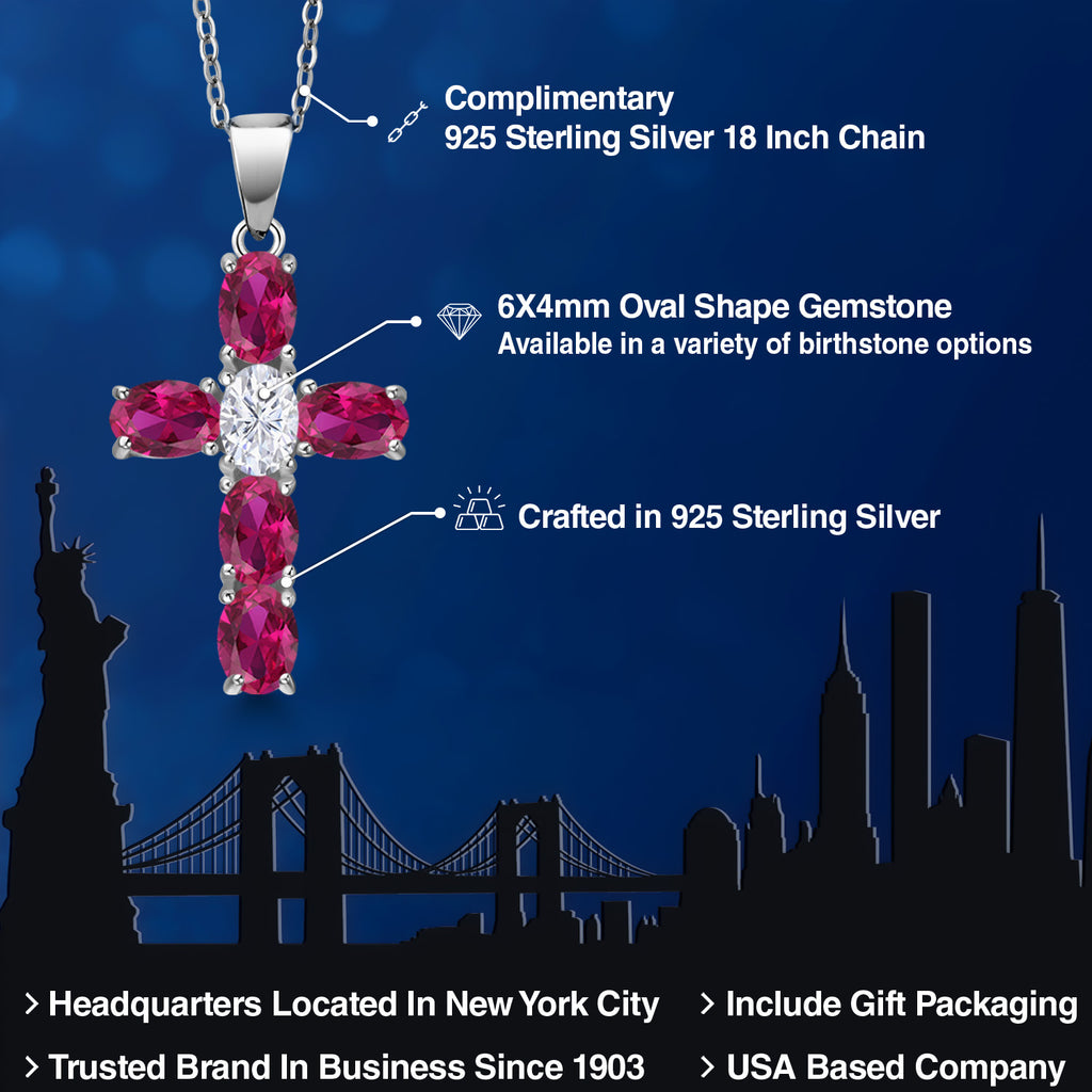 925 Sterling Silver Red Created Ruby and White Moissanite Cross Pendant Necklace for Women | 3.00 Cttw | Gemstone July Birthstone | Oval 6X4MM | With 18 Inch Chain