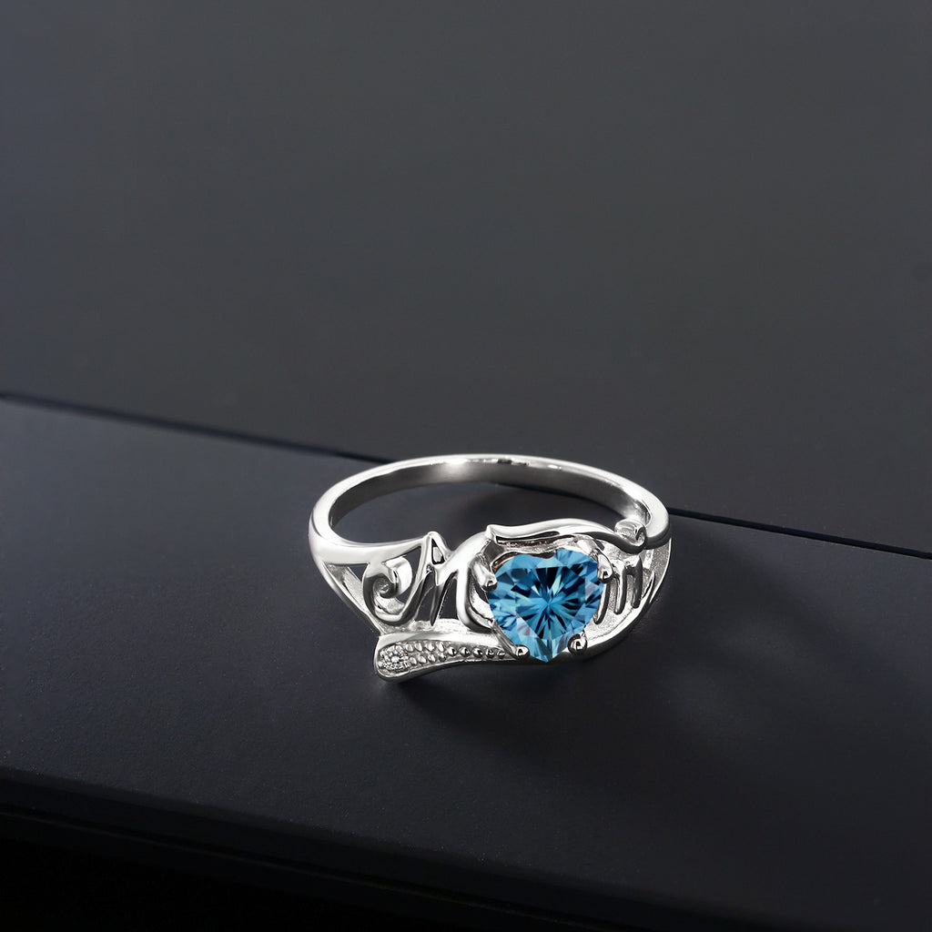 MEASUREMENTS: 6x6mm Heart Shape Coated Persian Blue Moissanite, 1x1mm Round White Diamond. Total Carat Weight is 0.81 cttw