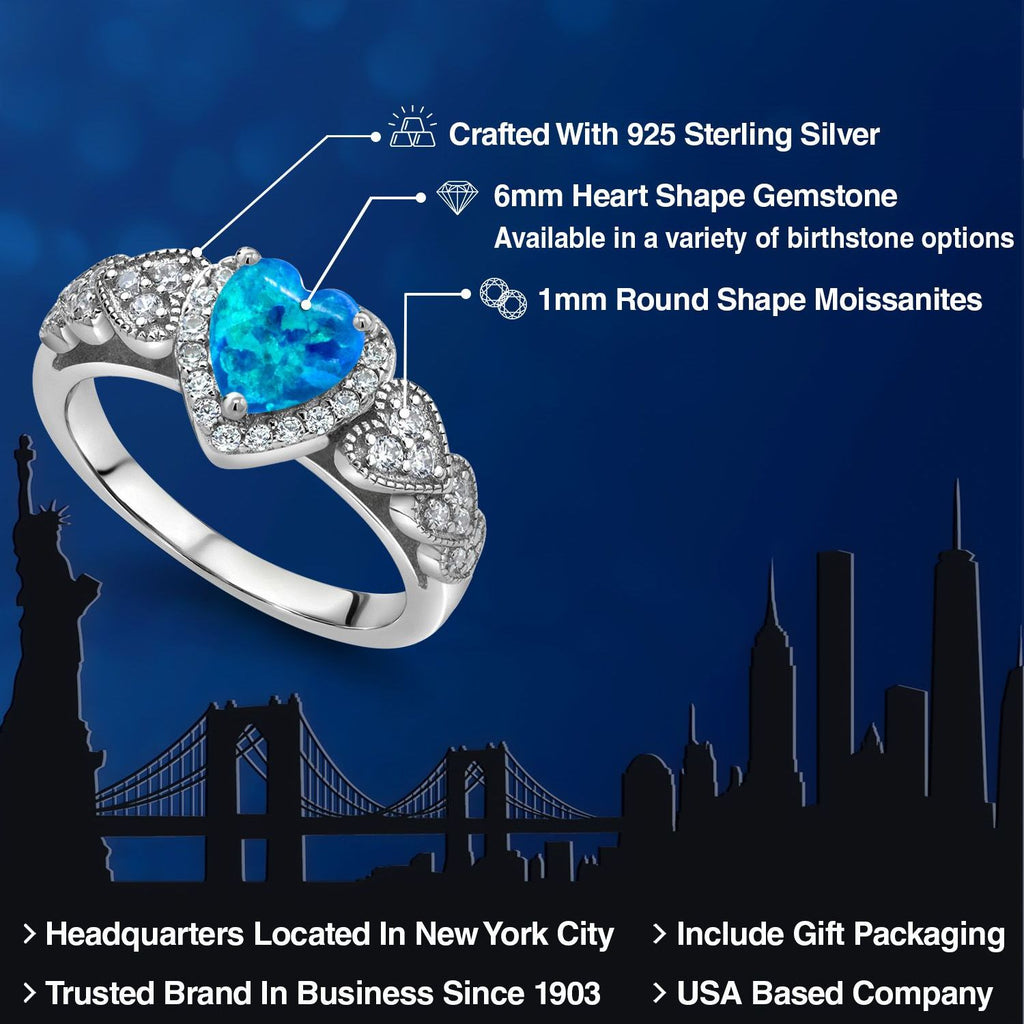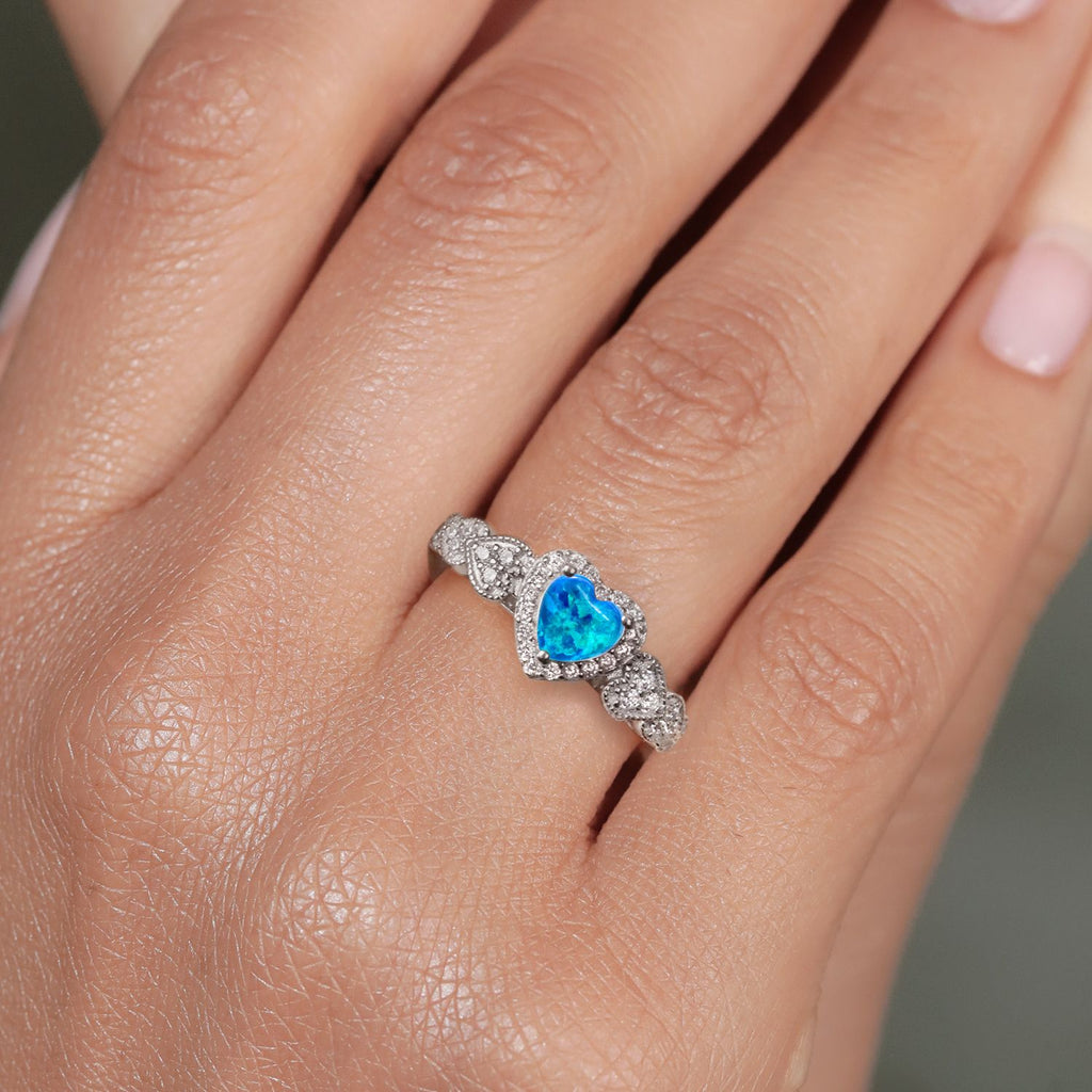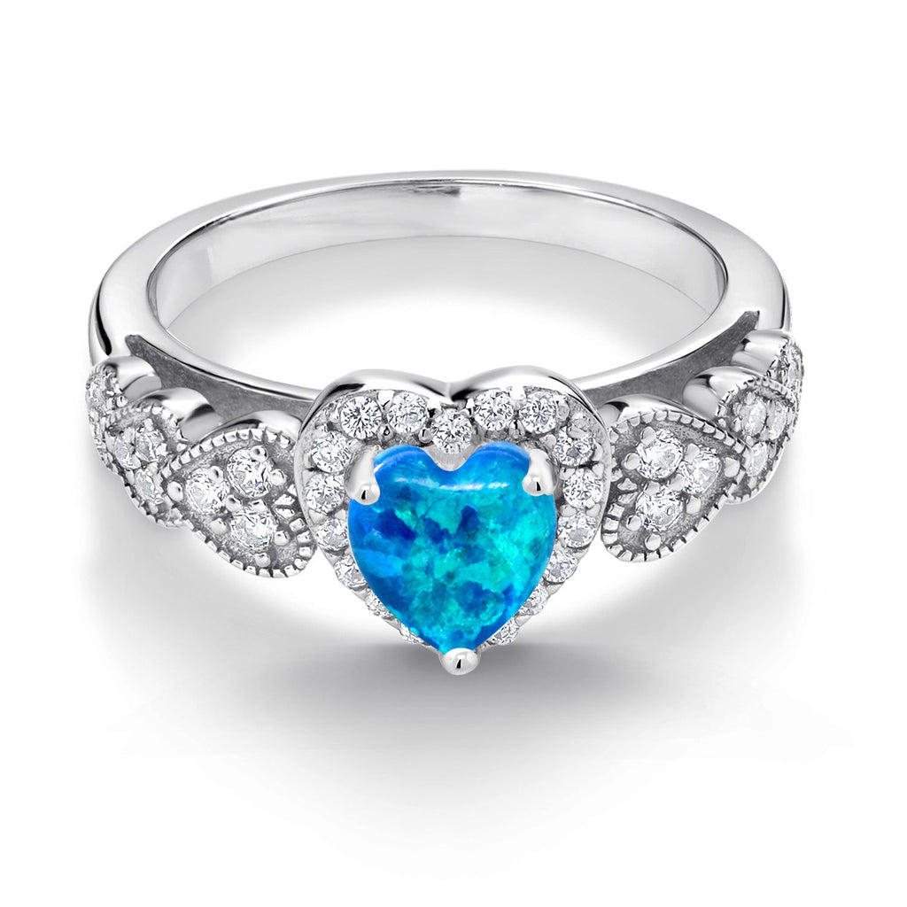 MEASUREMENTS: 6x6mm Heart Shape Blue Opal, 1x1mm Round Near Colorless (GH) Moissanite. Total Carat Weight is 0.93 cttw