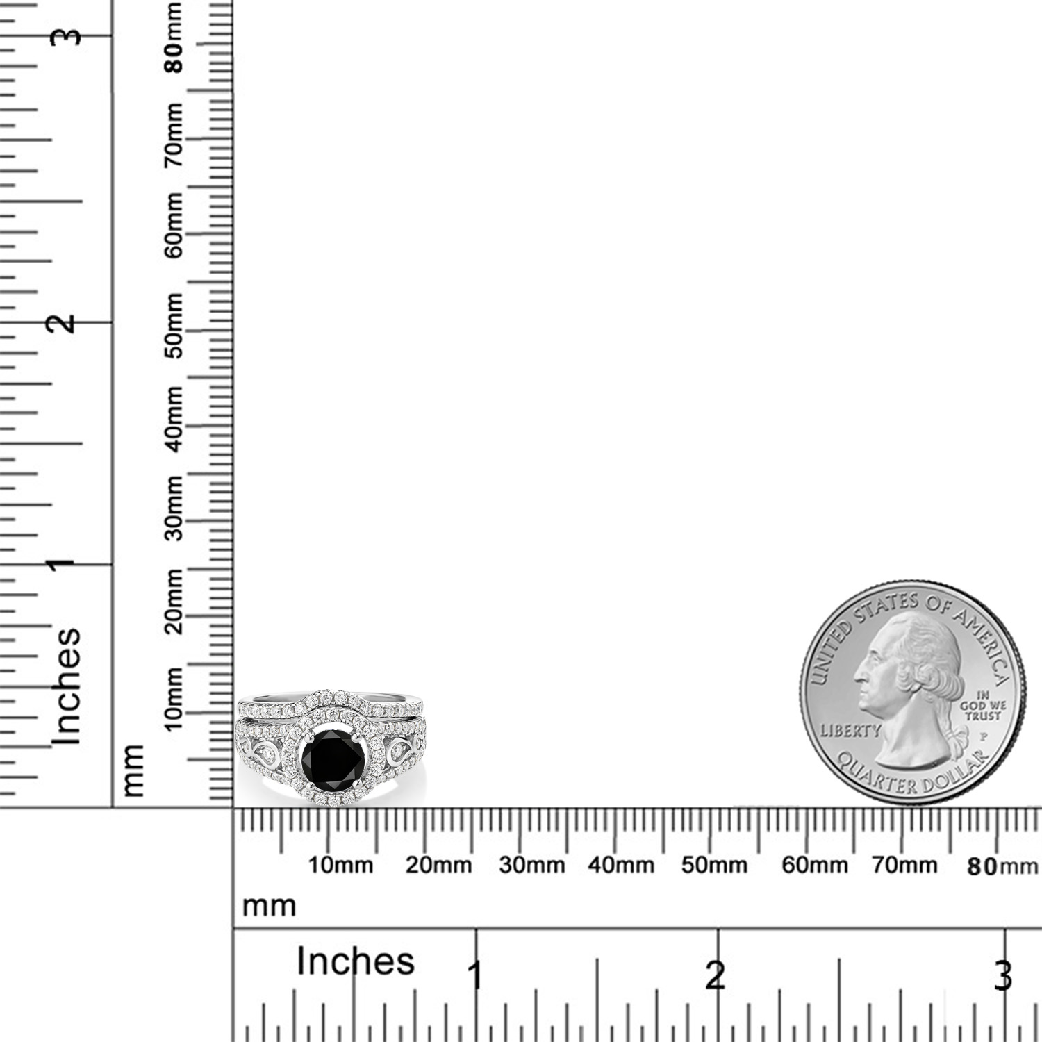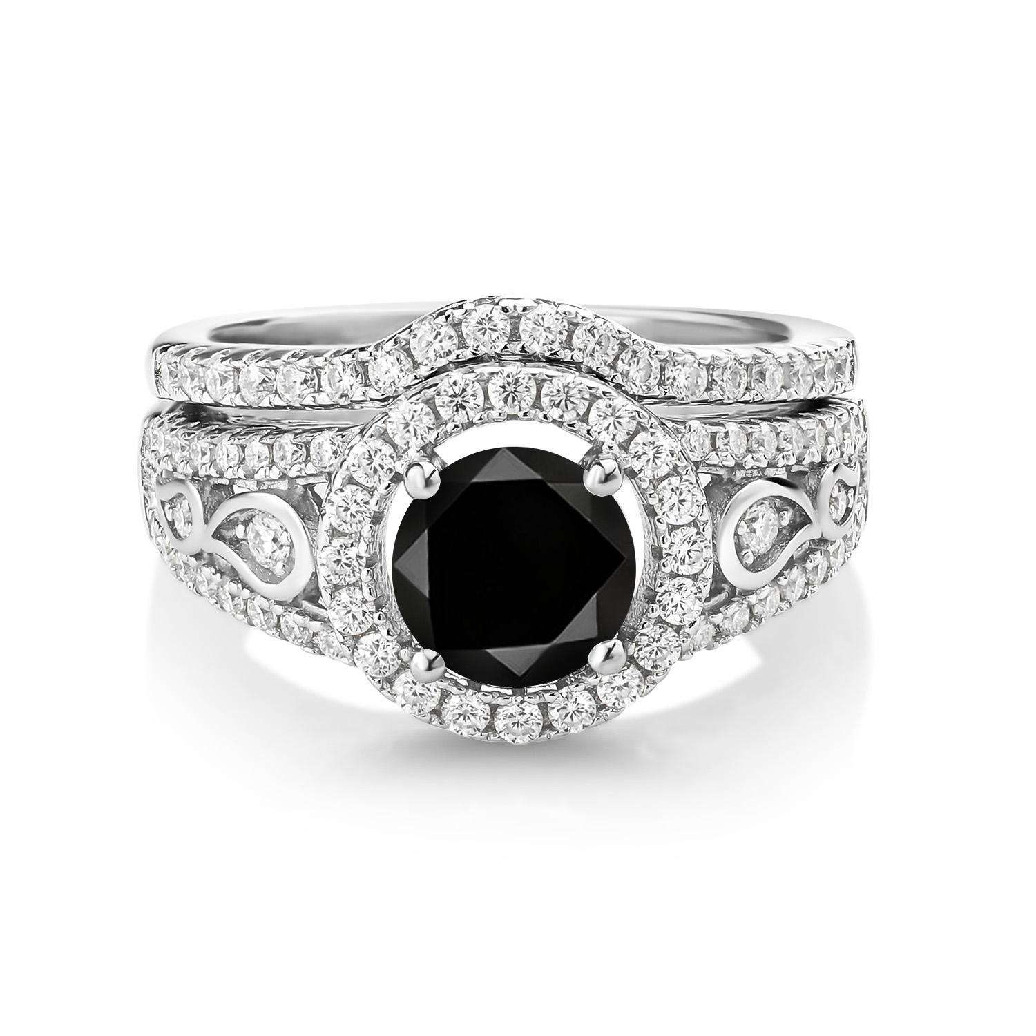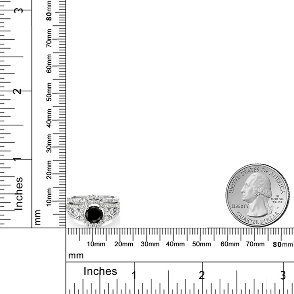 MEASUREMENTS: 6.5x6.5mm Round Irradiated Black Diamond, 1.3x1.3mm Round Near Colorless (GH) Moissanite. Total Carat Weight is 1.84 cttw
