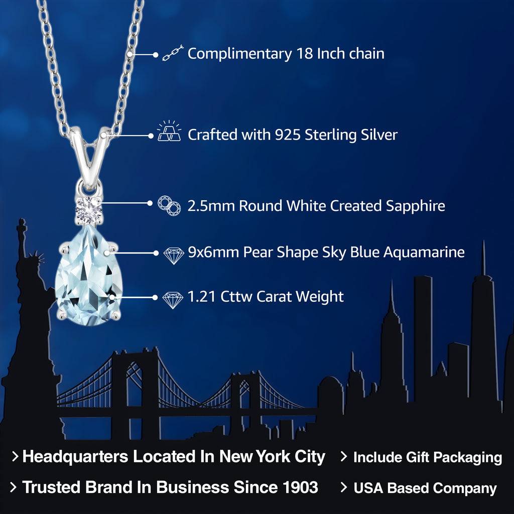 925 Sterling Silver Sky Blue Aquamarine and White Created Sapphire Pendant Necklace For Women (1.21 Cttw, Gemstone March Birthstone, Pear Shape 9X6MM, with 18 inch Chain)