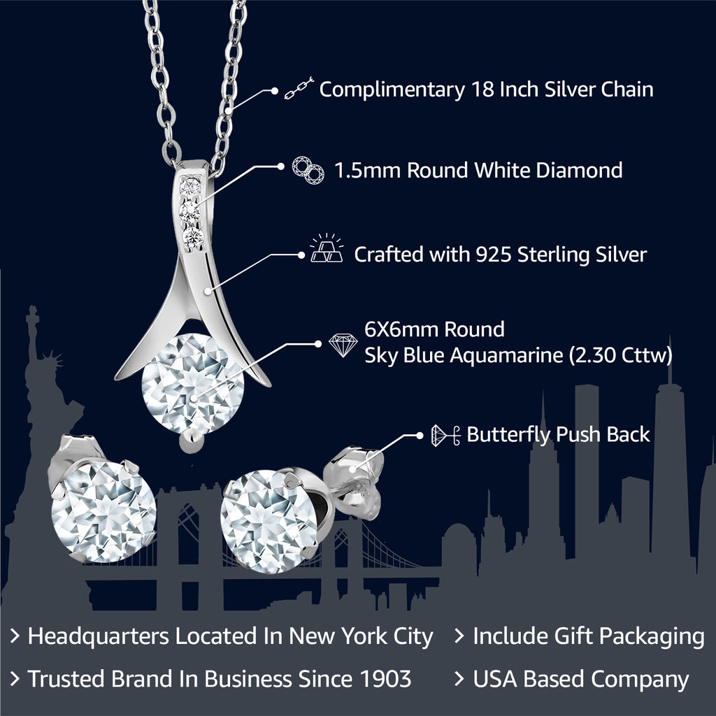 EXQUISITE SKY BLUE AQUAMARINE: This pendant and earrings set features exquisite sky blue aquamarine gemstones that add a touch of elegance and sophistication. The round cut enhances the natural beauty of the aquamarines, allowing them to sparkle and shine. Total Carat Weight is 2.3 cttw.