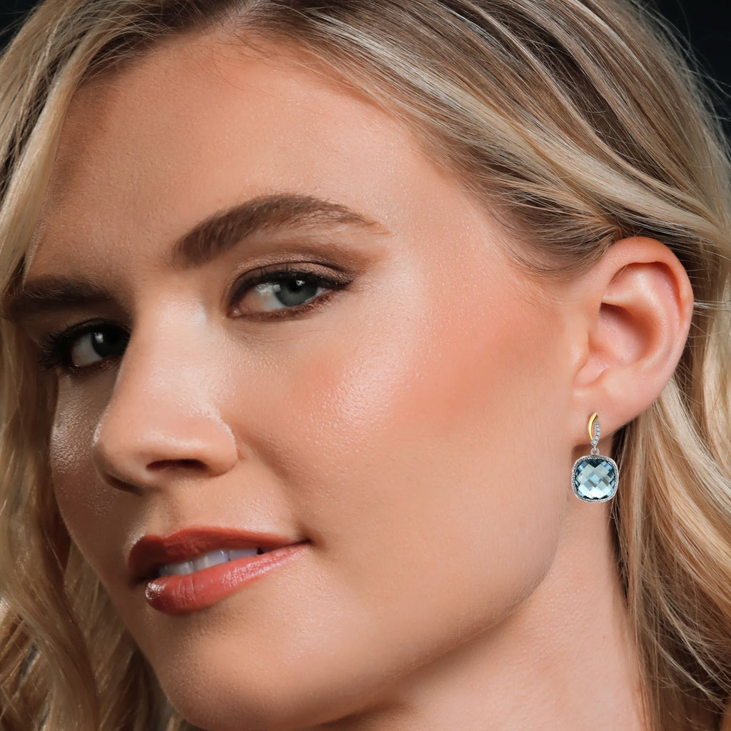925 Sterling Silver Sky Blue Simulated Aquamarine and White Lab Grown Diamond Earrings for Women | 12.07 Cttw | Gemstone March Birthstone | Cushion 12MM