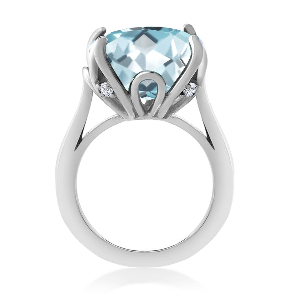 - MEASUREMENTS: 14x14mm Cushion Sky Blue Simulated Aquamarine, 1.8x1.8mm Round Near Colorless (GH) Moissanite. Total Carat Weight is 10.9 cttw