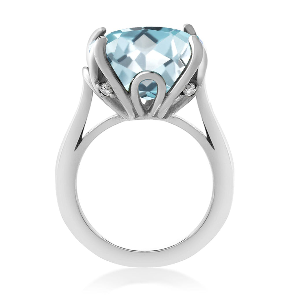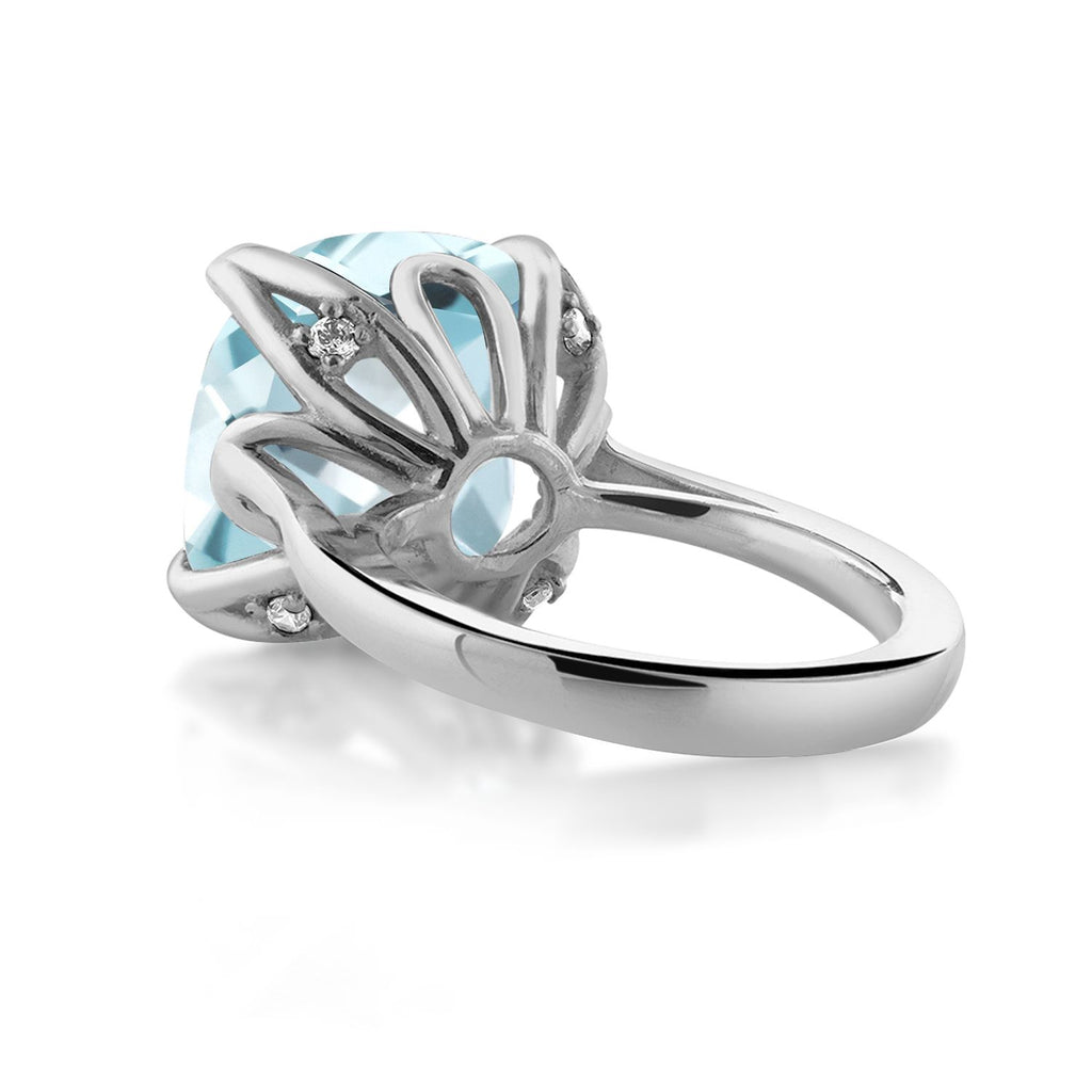 - MEASUREMENTS: 14x14mm Cushion Sky Blue Simulated Aquamarine, 1.8x1.8mm Round White Zirconia. Total Carat Weight is 10.98 cttw