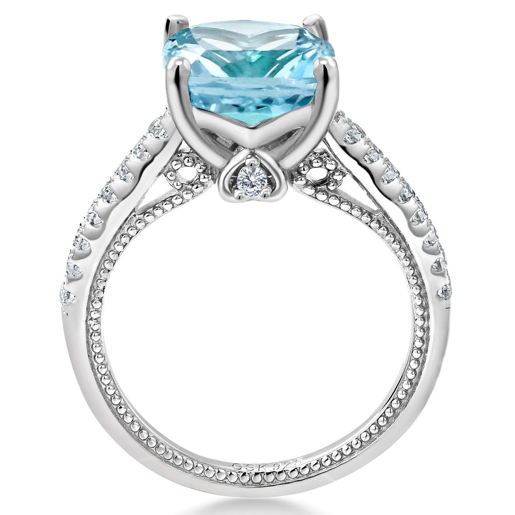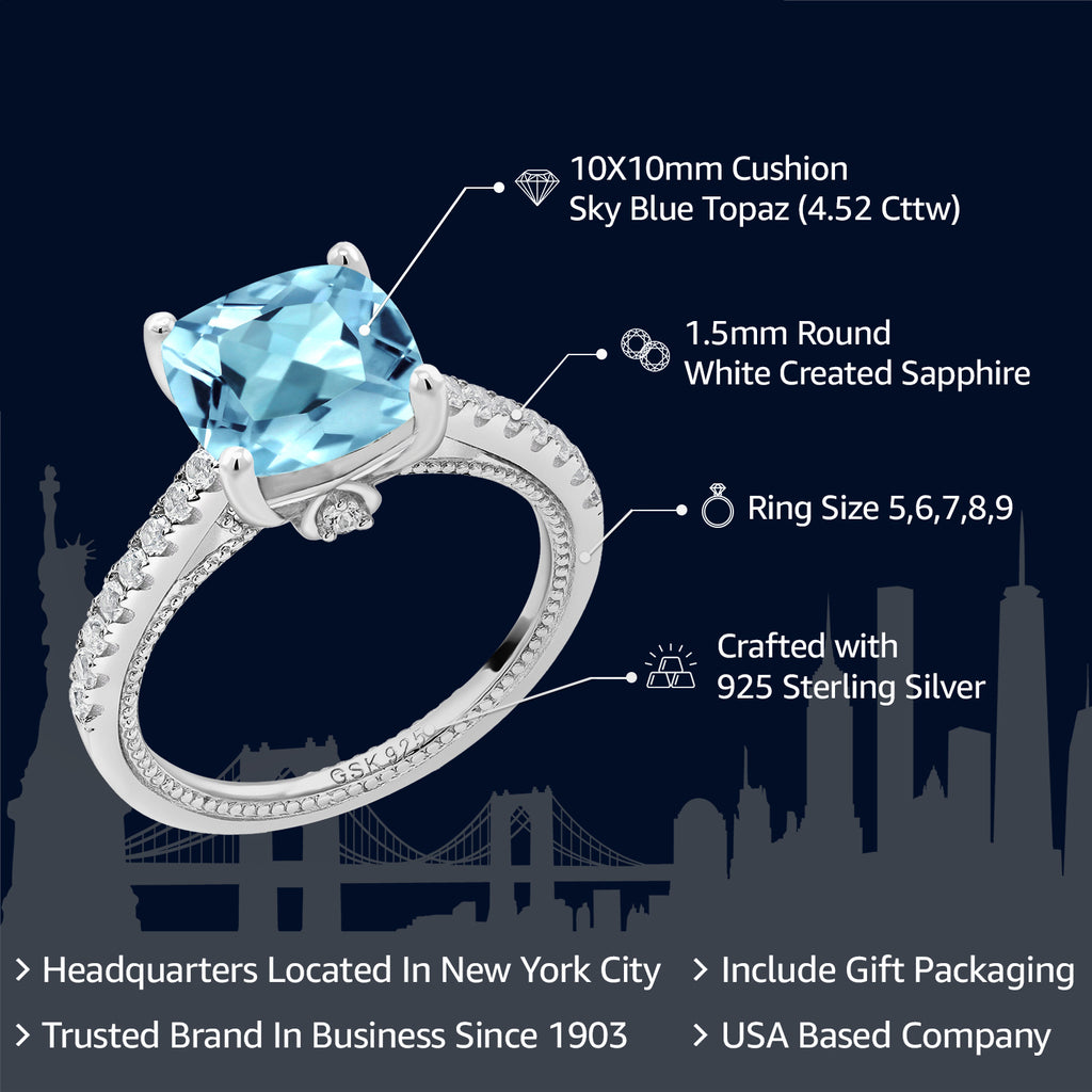4.52 Cttw Sky Blue Topaz and White Created Sapphire Engagement Ring For Women | 925 Sterling Silver | Cushion 10MM | Wedding Engagement Anniversary Promise Ring For Women