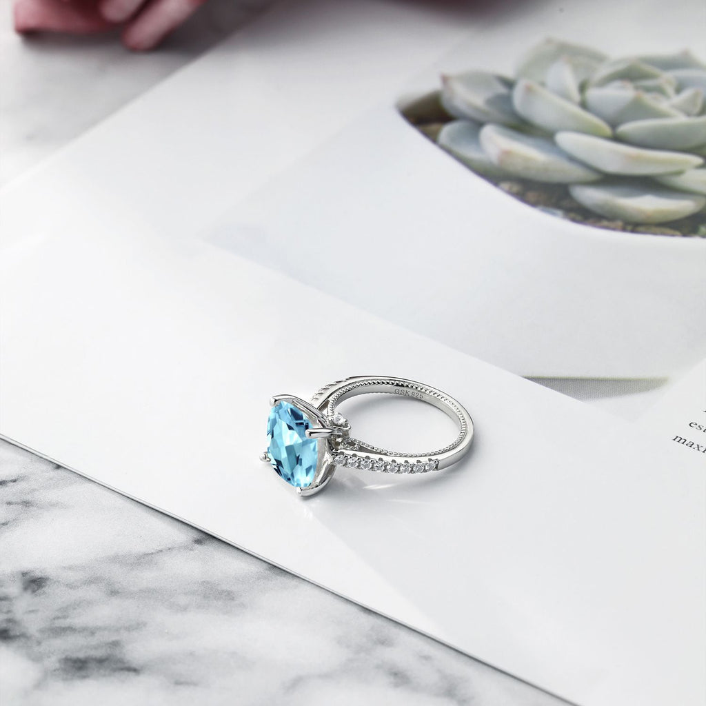 CAPTIVATING SKY BLUE TOPAZ CENTER STONE: Adorn your fingers with a stunning cushion-cut 10MM sky blue topaz center stone. The mesmerizing blue hue adds a touch of tranquility and sophistication to this elegant ring.
