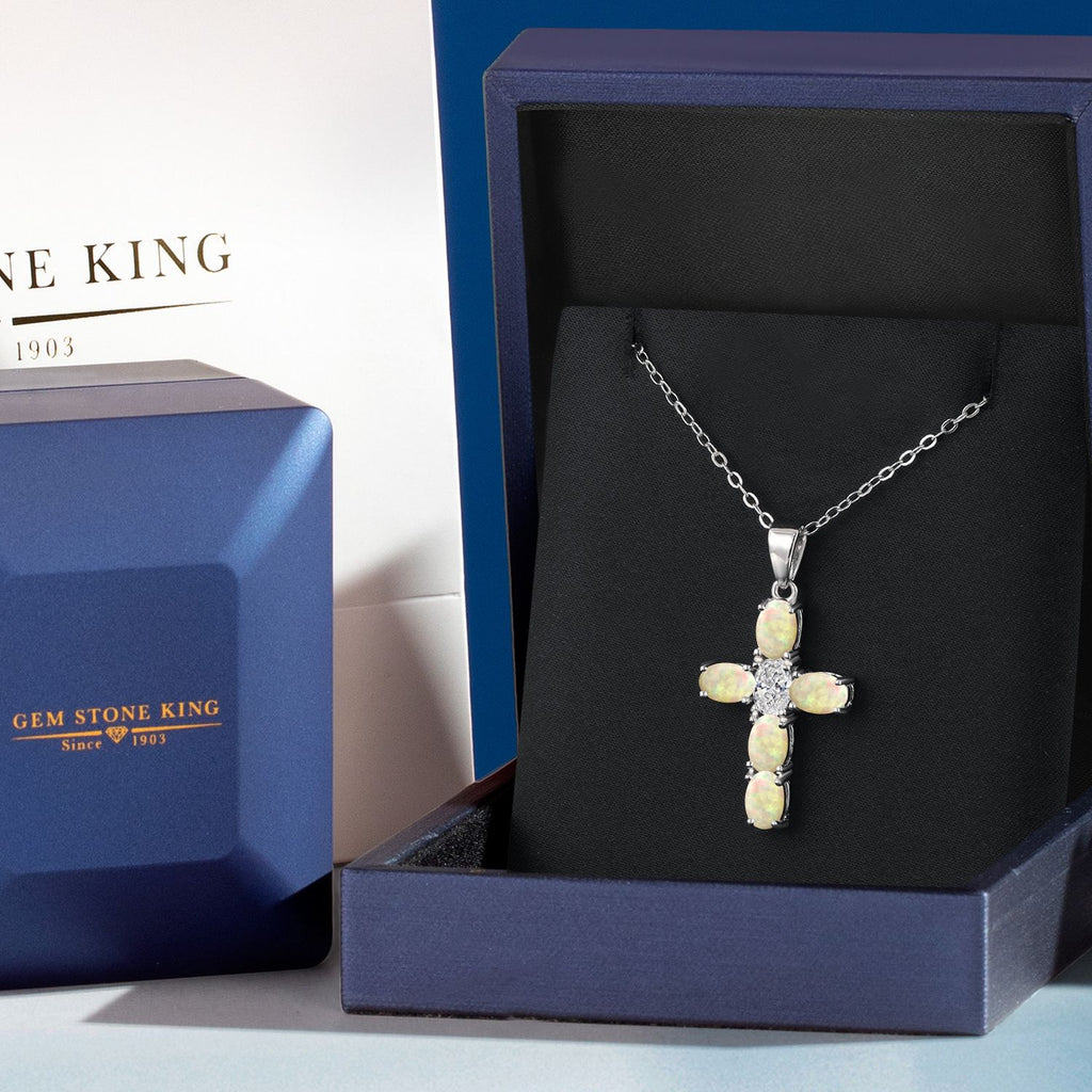 925 Sterling Silver White Ethiopian Opal and Lab Grown Diamond Cross Pendant Necklace for Women | 2.00 Cttw | Gemstone October Birthstone | Oval Cabochon 6X4MM | With 18 Inch Chain