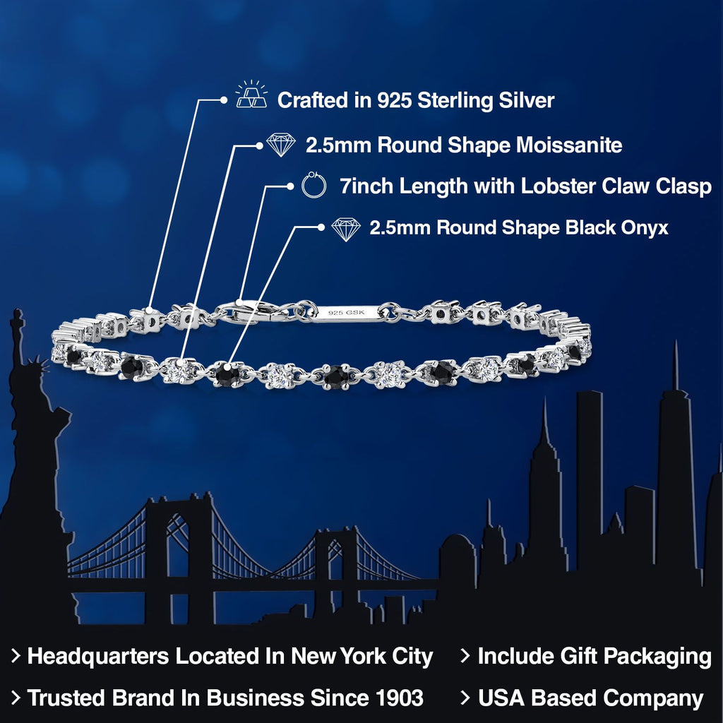ELEGANT BLACK ONYX AND MOISSANITE BRACELET: This stunning 7-inch tennis bracelet features a sophisticated combination of round black onyx and white moissanite gemstones, totaling 1.76 Cttw. Each 2.5MM gemstone is precisely set in high-quality 925 sterling silver or with an 18k gold plated finish, creating a classic and timeless accessory that adds a touch of elegance to any outfit.