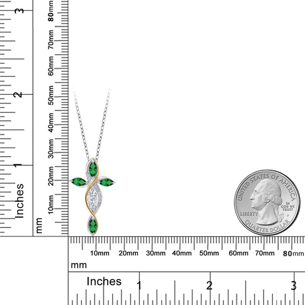 Cross Necklace For Women In 925 Silver and 10K Yellow Gold with White Moissanite and Green Nano Emerald | 1.32 Cttw | Jesus Christian Religious Crucifix | Marquise 8X4MM | 18 Inch Chain