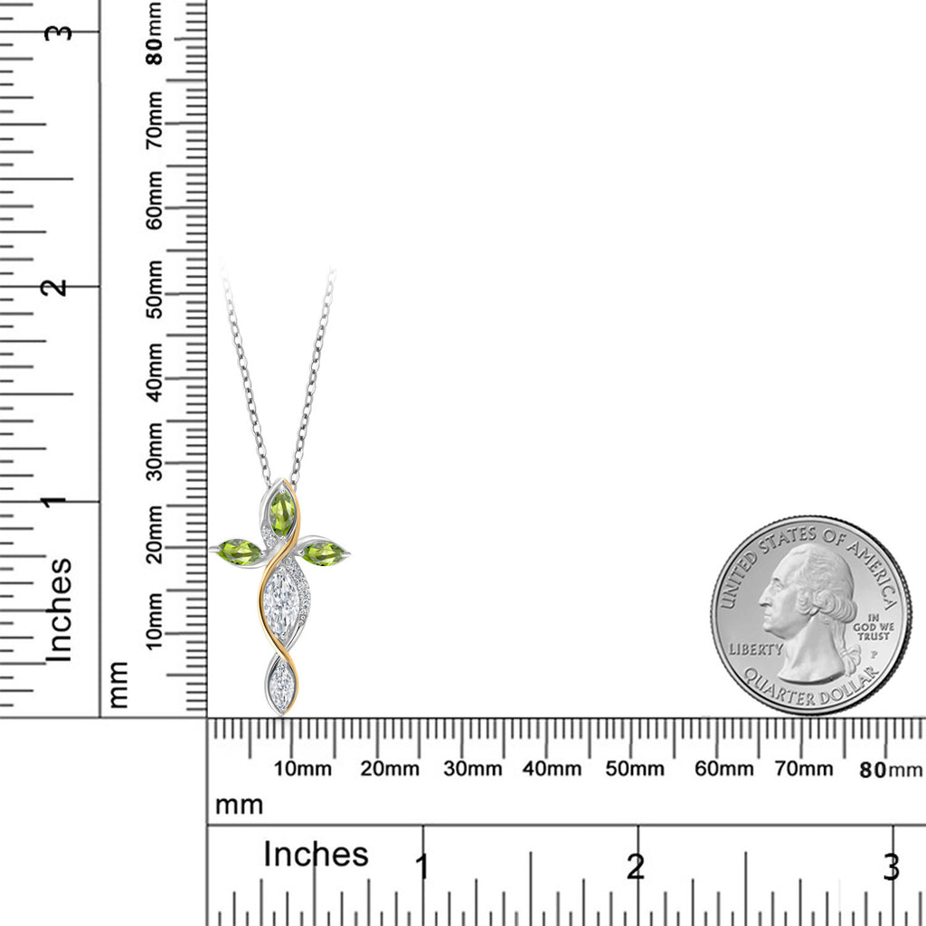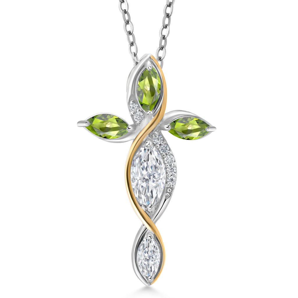 Cross Necklace For Women In 925 Silver and 10K Yellow Gold with White Moissanite and Green Peridot | 1.37 Cttw | Jesus Christian Religious Crucifix | Marquise 8X4MM | With 18 Inch Chain