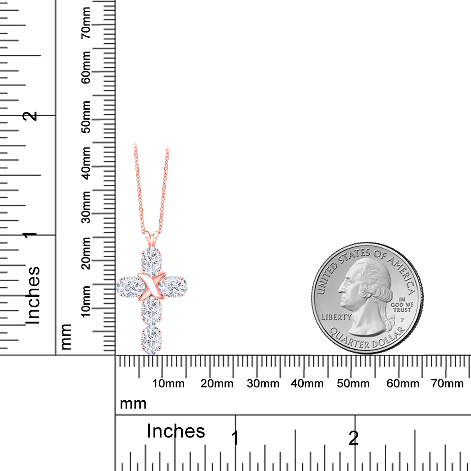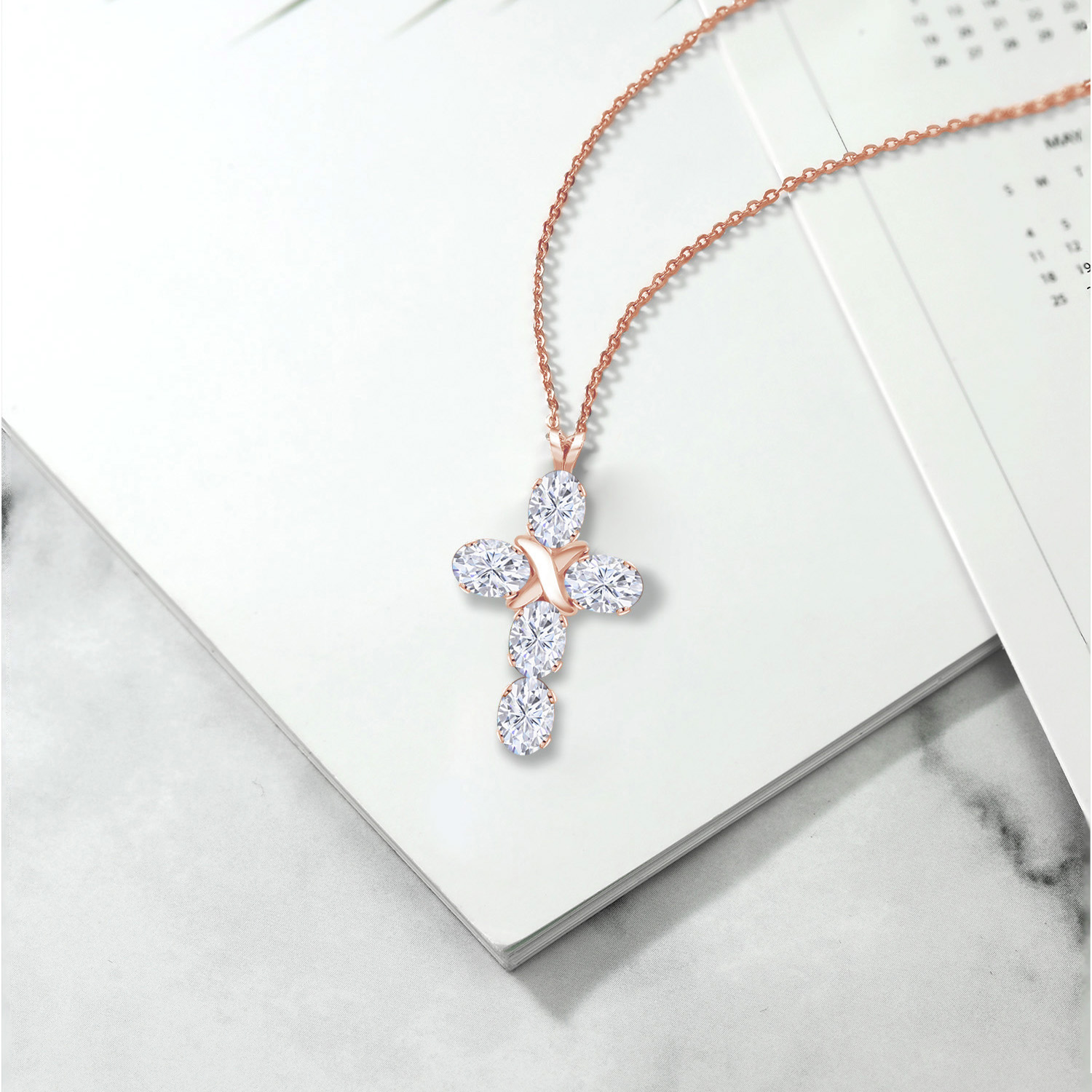 Gem Stone King Cross Pendant Necklace for Women | 18K Rose Gold Plated Silver | 6X4MM Gemstone Birthstone | Jesus Christian Religious Crucifix Jewelry | 18 Inch Chain | White Moissanite-April