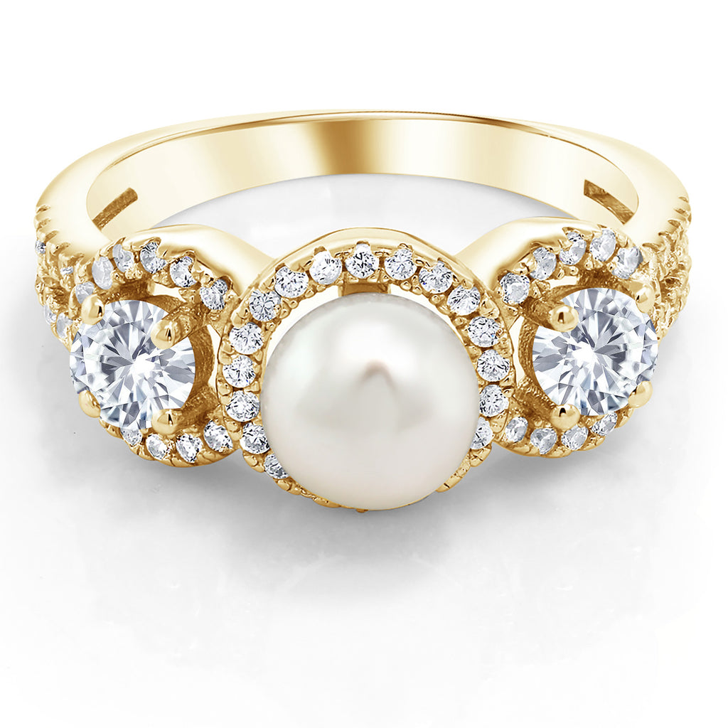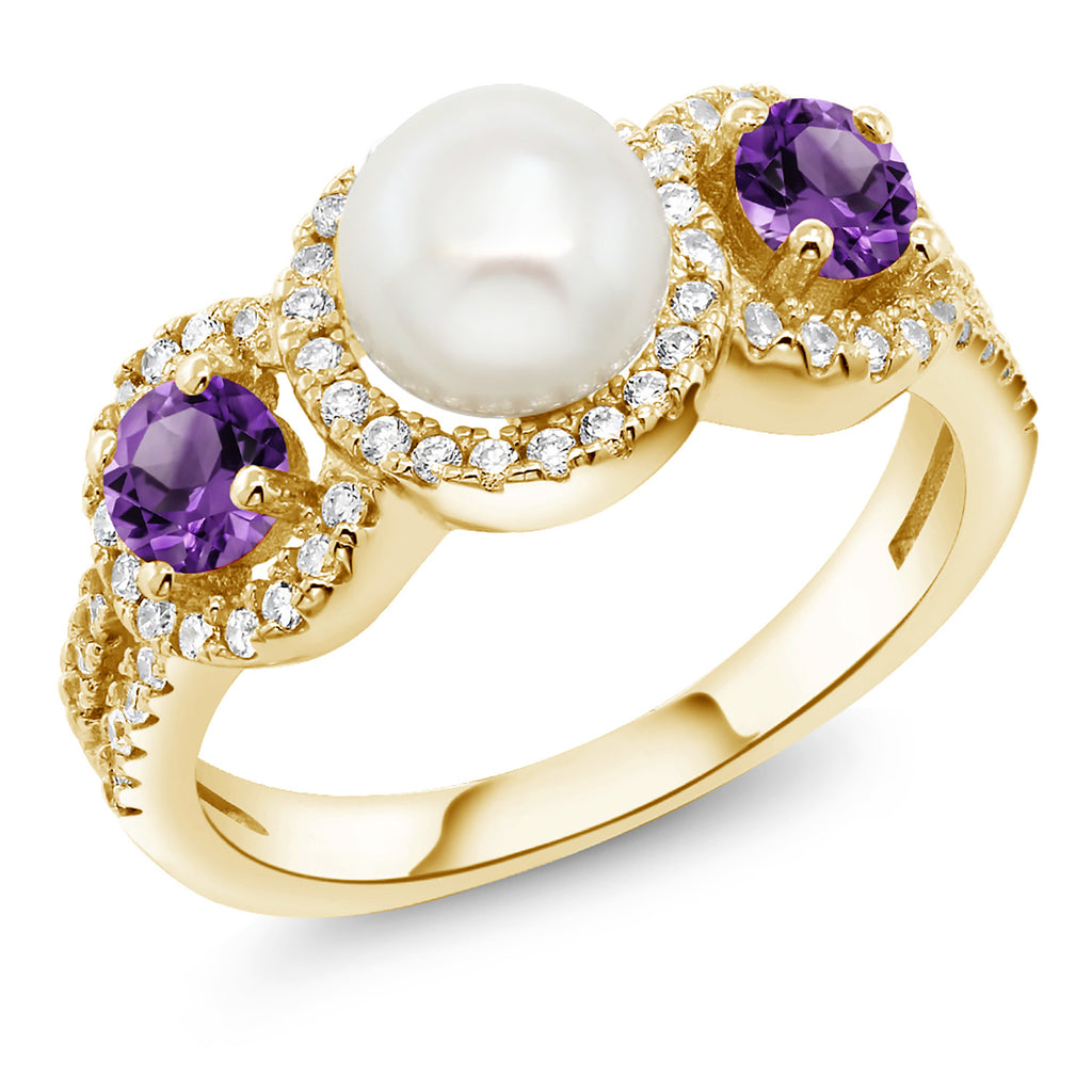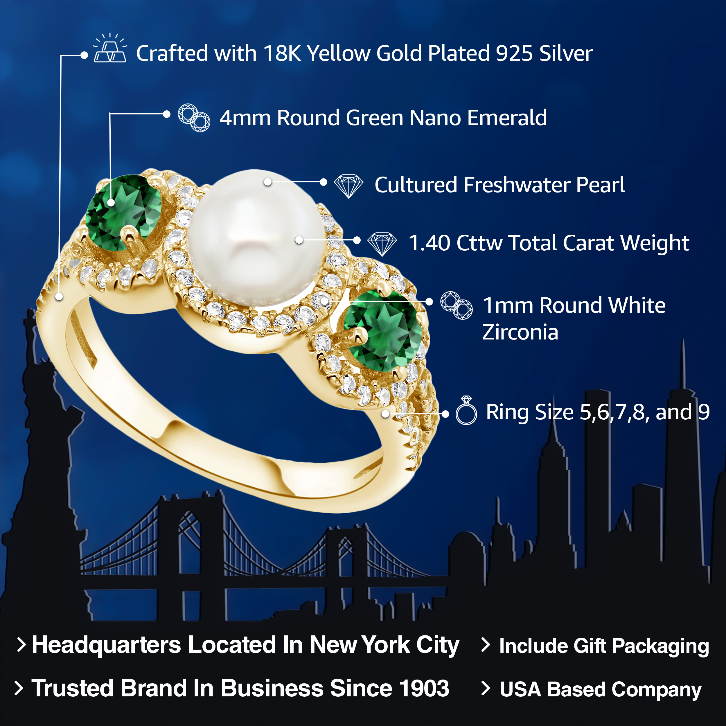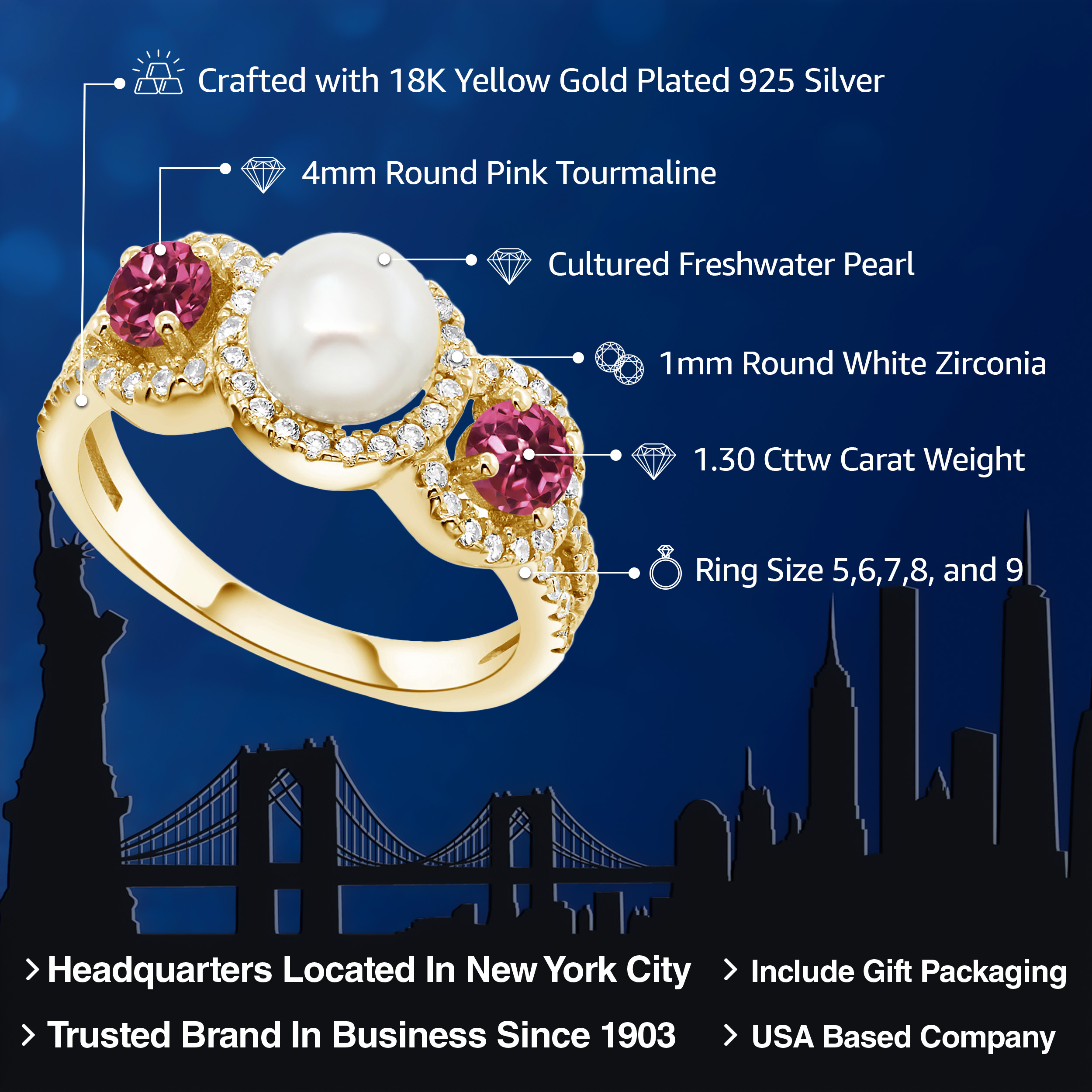 Cultured Freshwater Pearl and Gemstone Birthstone Ring for Women | 18K Yellow Gold Plated Silver | Round 4MM | Wedding Engagement Anniversary Promise Ring | Available In Size 5-9