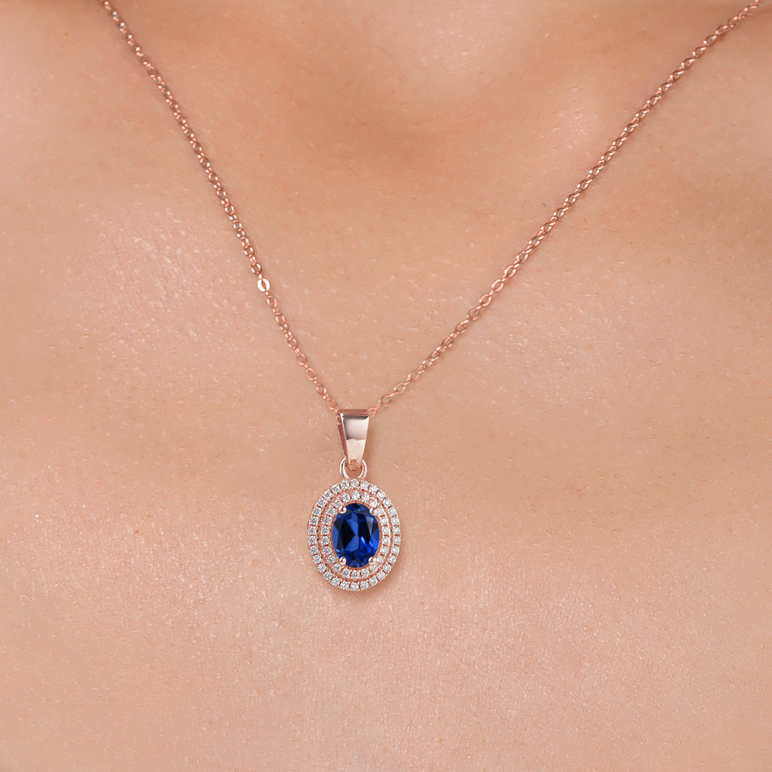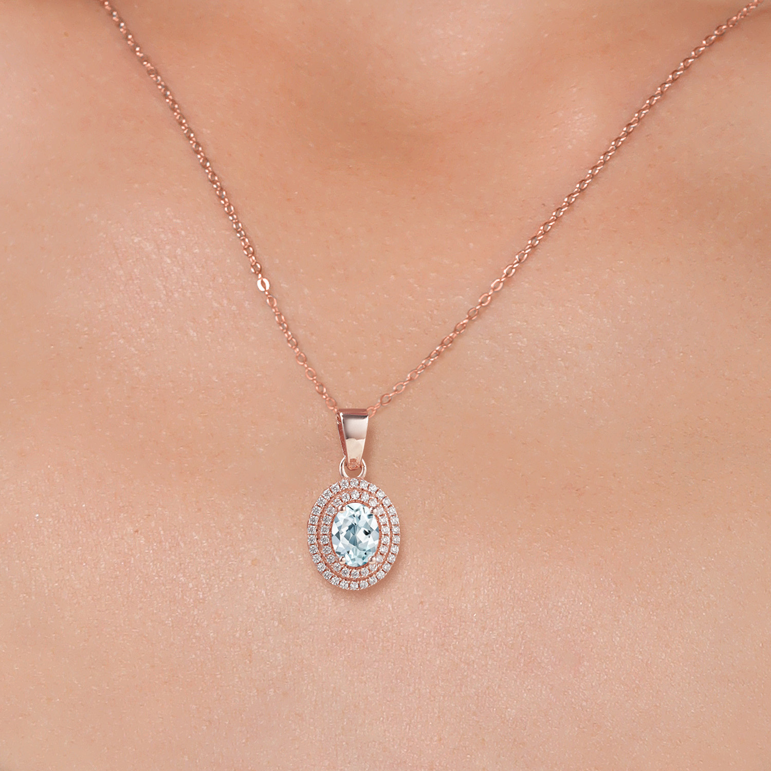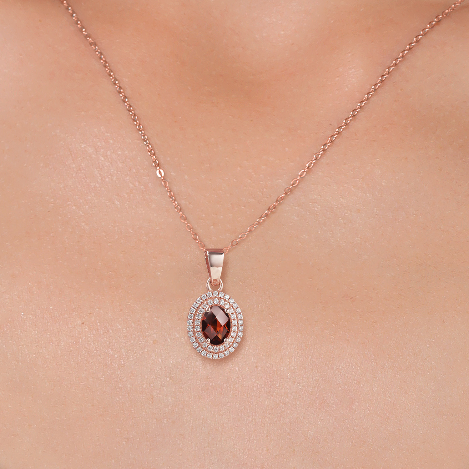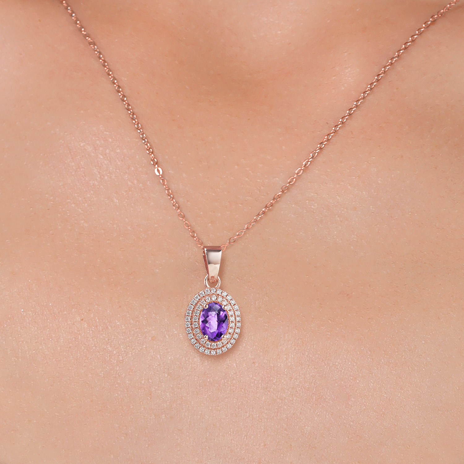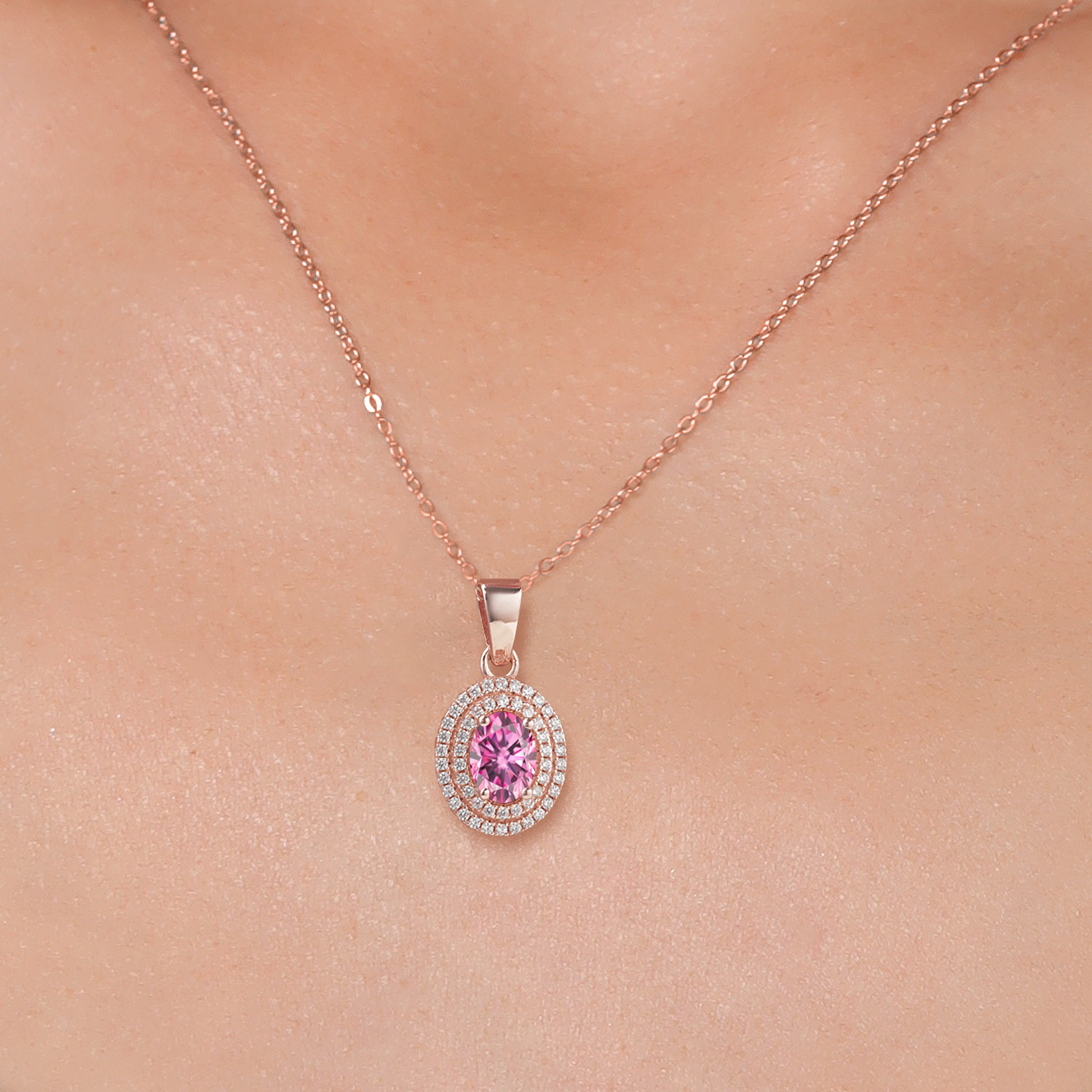 Double Halo Pendant Necklace For Women in 18K Rose Gold Plated Silver | 7X5MM Oval Gemstone Birhtstone with Accent Stones | 18-Inch Chain | Fine Jewelry Gifts for Her Mom Women Wife