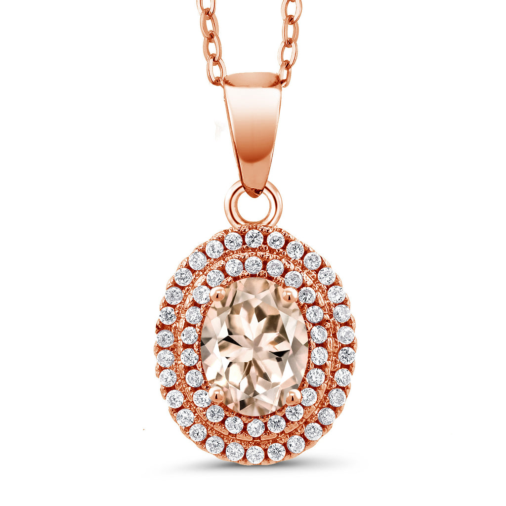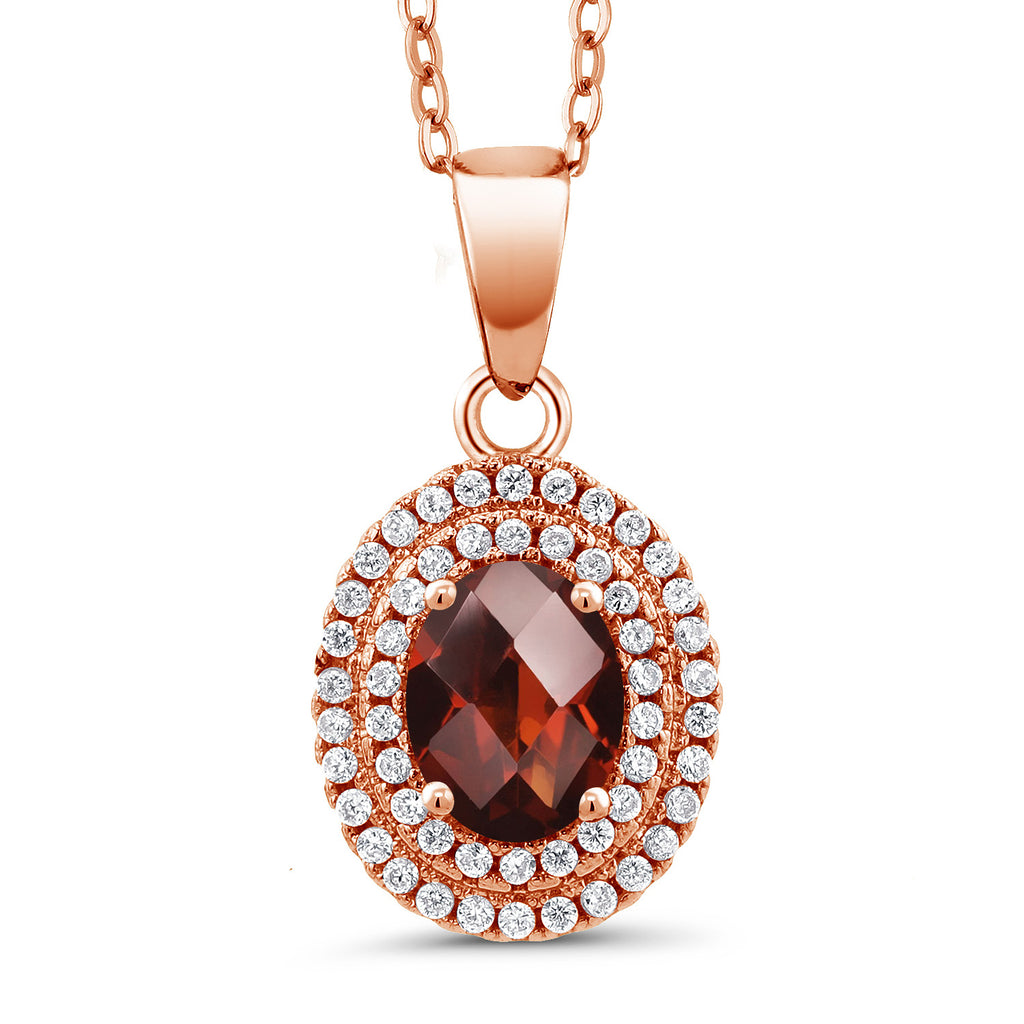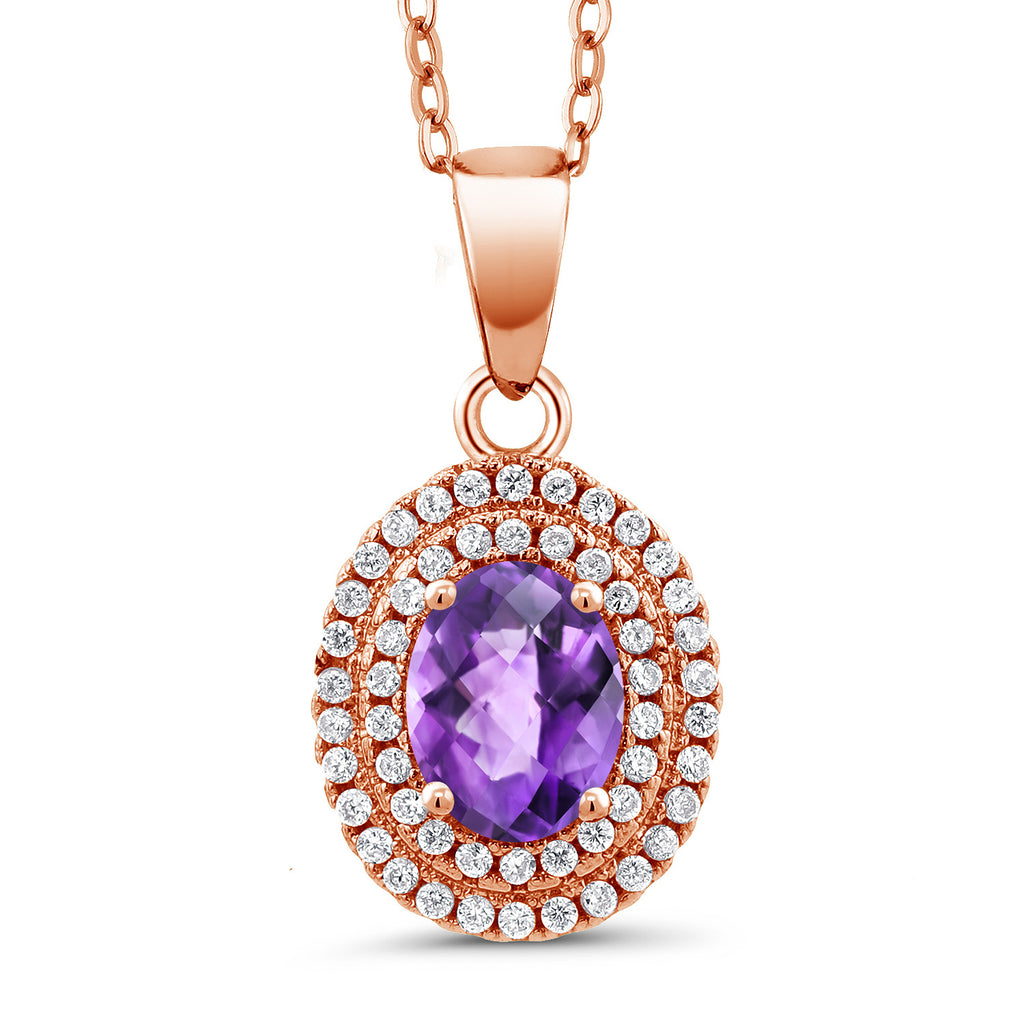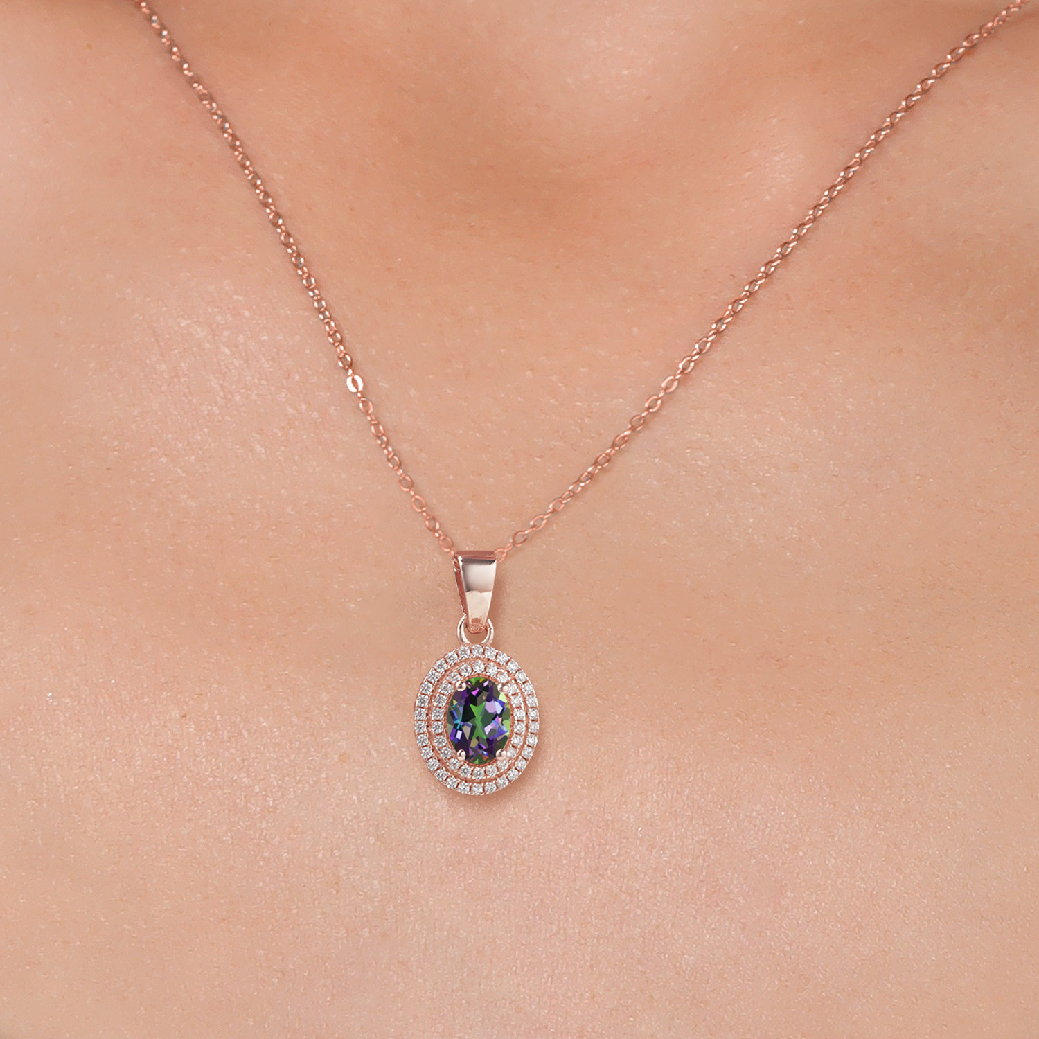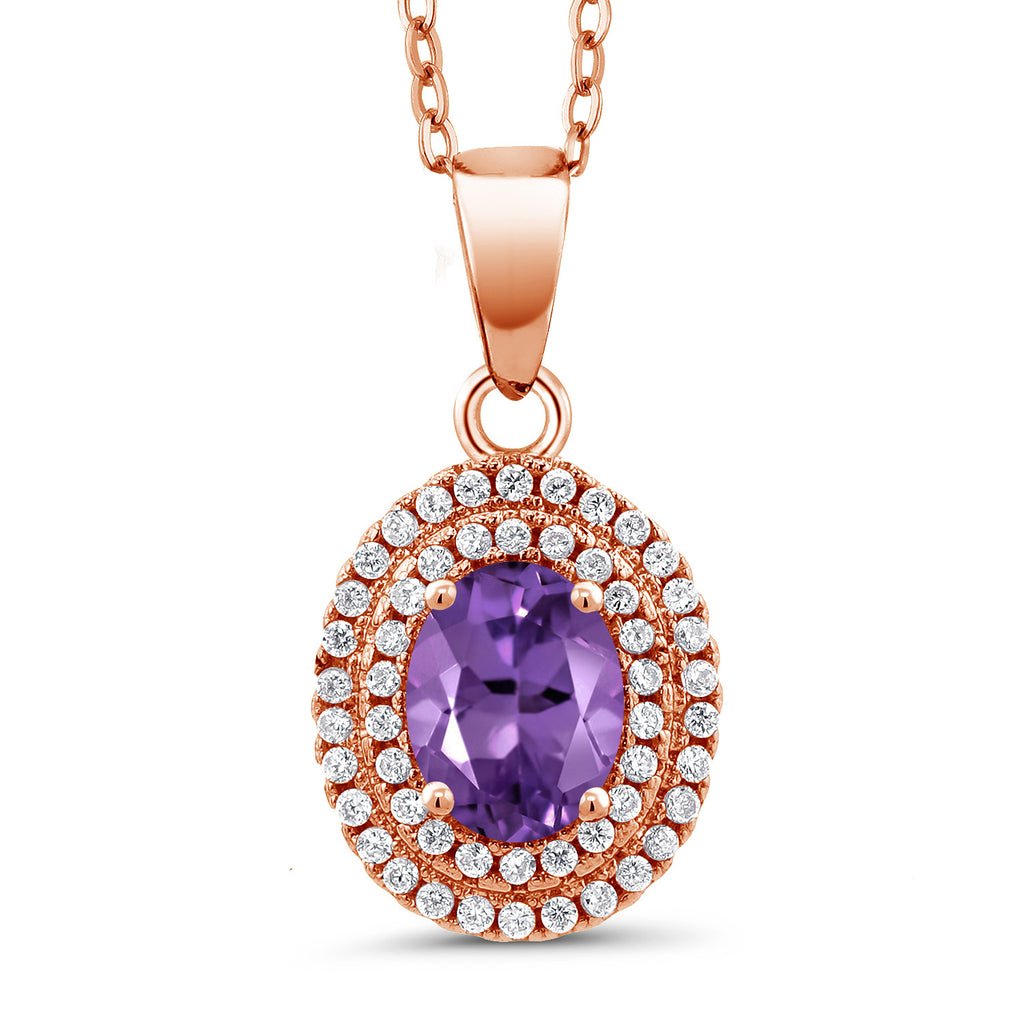 Double Halo Pendant Necklace For Women in 18K Rose Gold Plated Silver | 7X5MM Oval Gemstone Birhtstone with Accent Stones | 18-Inch Chain | Fine Jewelry Gifts for Her Mom Women Wife