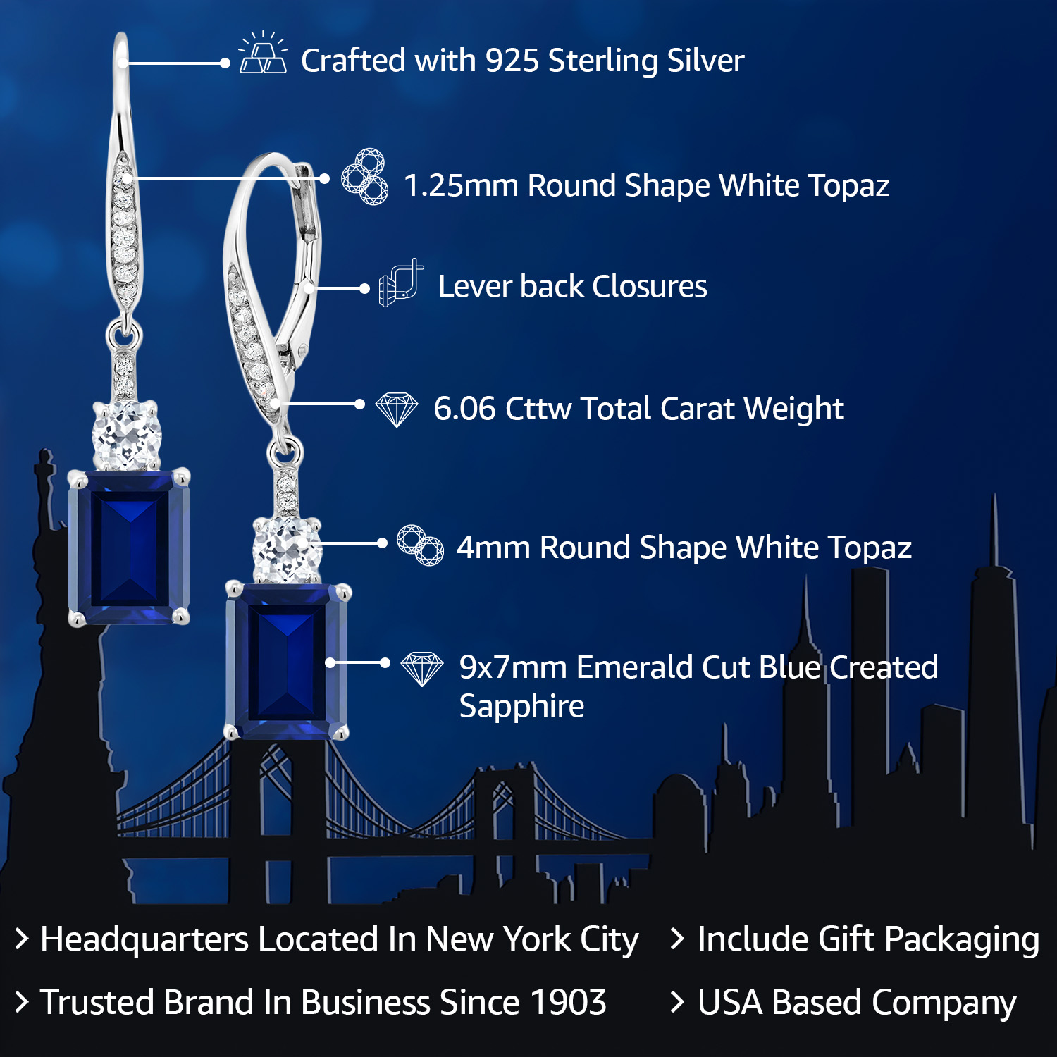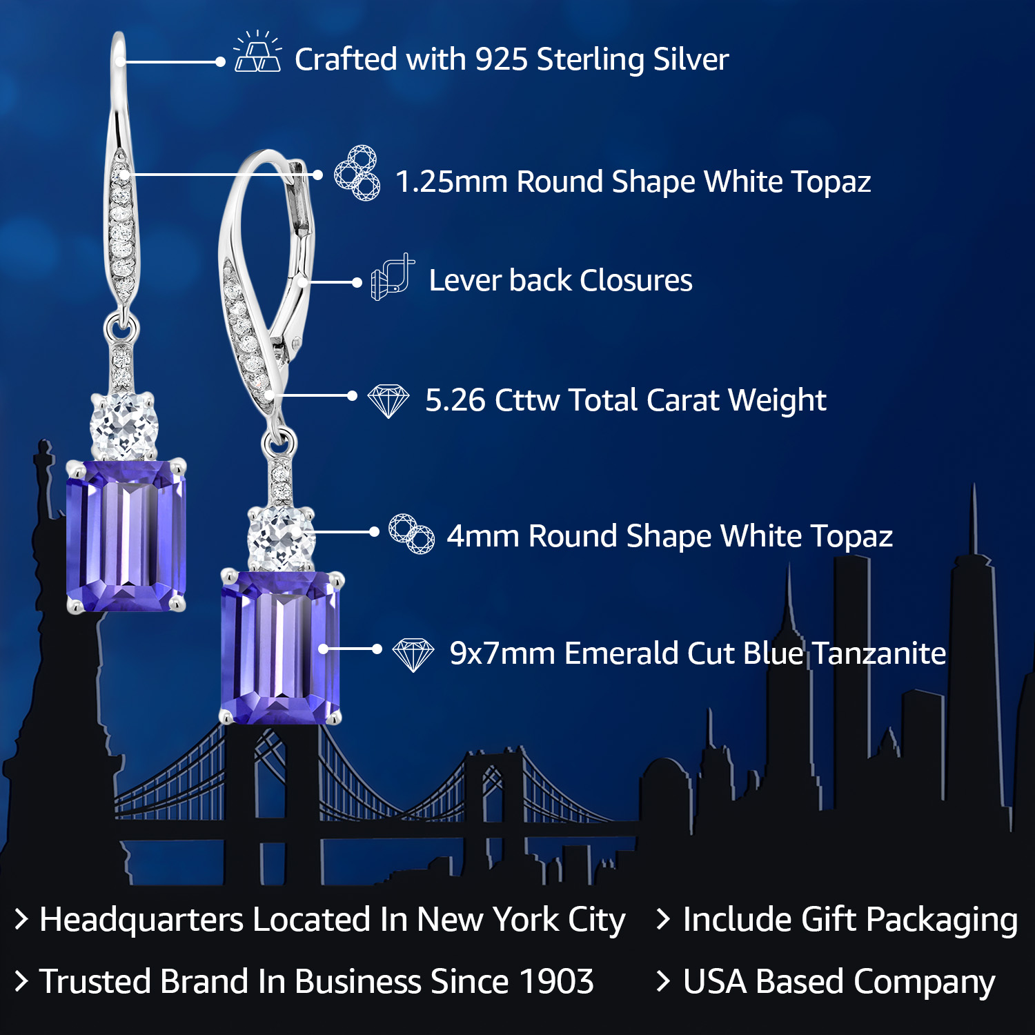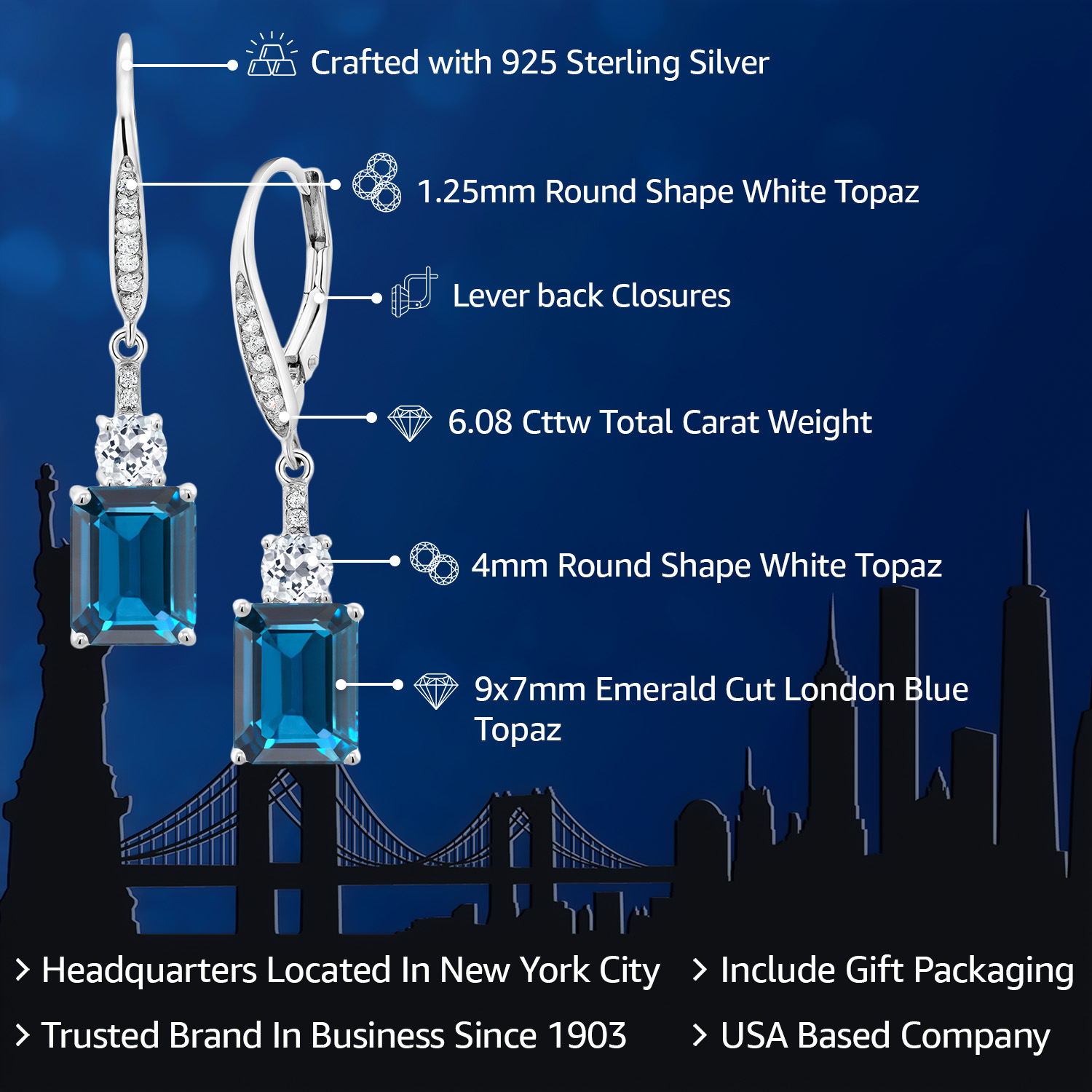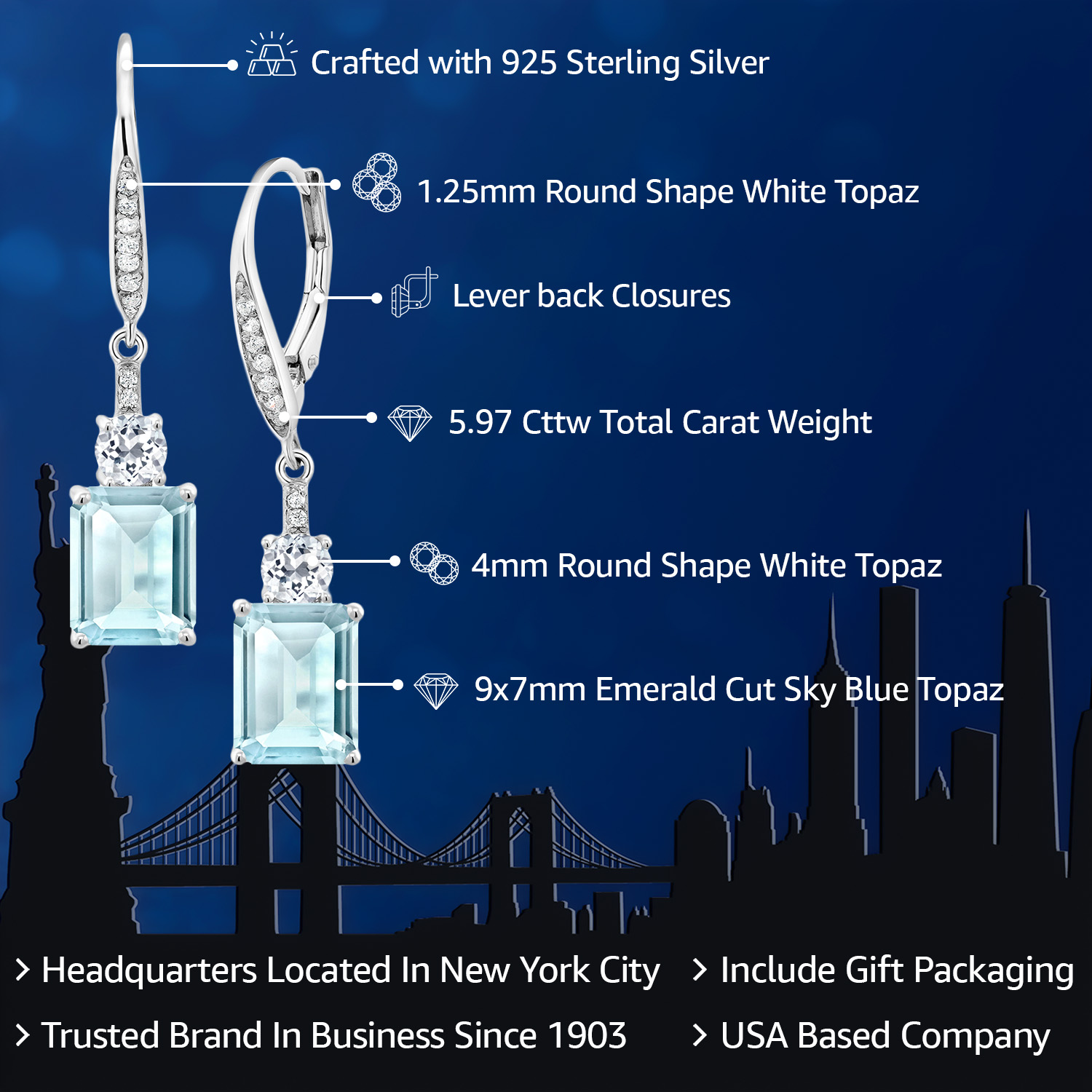 WHITE TOPAZ ACCENTS & CRAFTSMANSHIP: Each earring is adorned with dazzling white topaz accents, enhancing the grandeur of the main gemstone. The meticulous craftsmanship reflects an unwavering commitment to detail and quality, creating a harmonious blend of sparkle and elegance. The secure drop dangle style is both chic and versatile, promising a comfortable fit and a graceful sway that captures light beautifully, elevating any outfit with a touch of glamour.