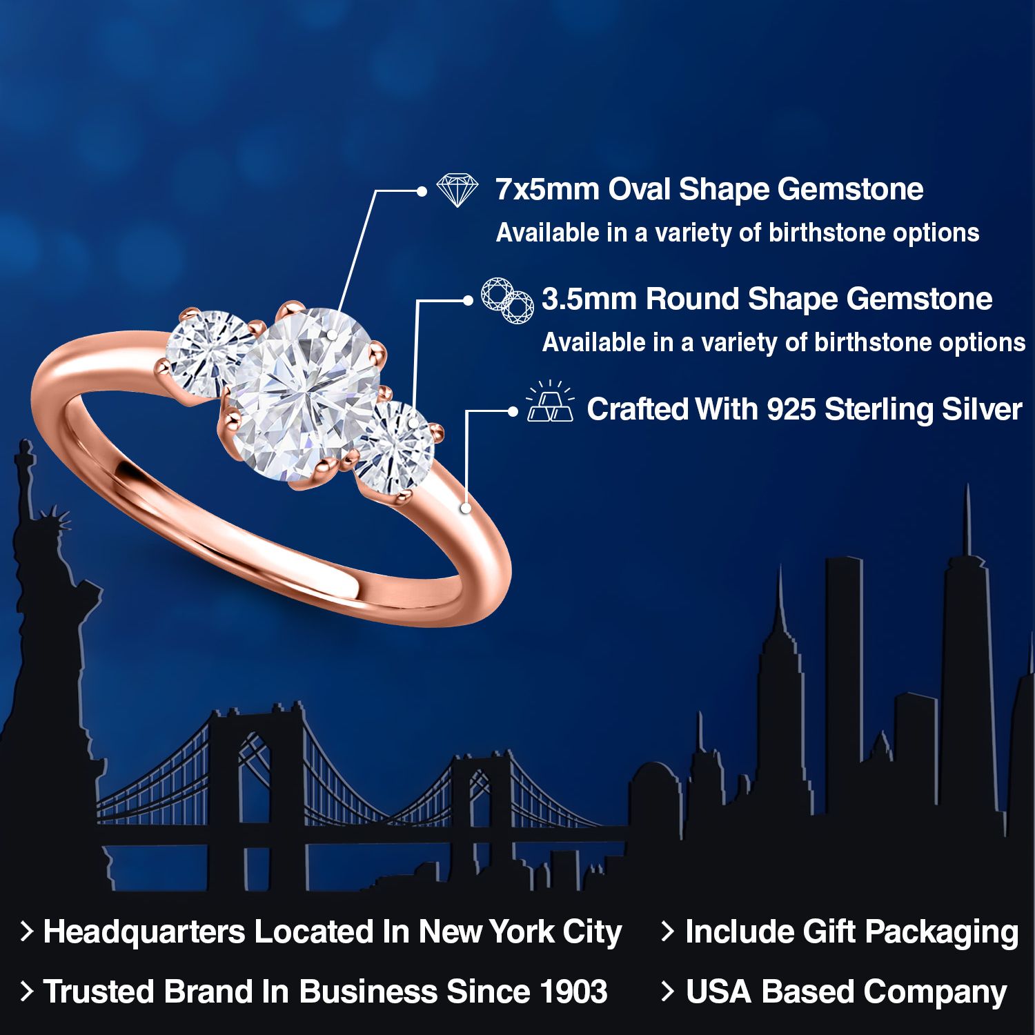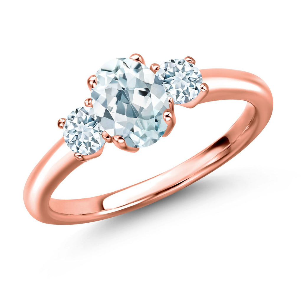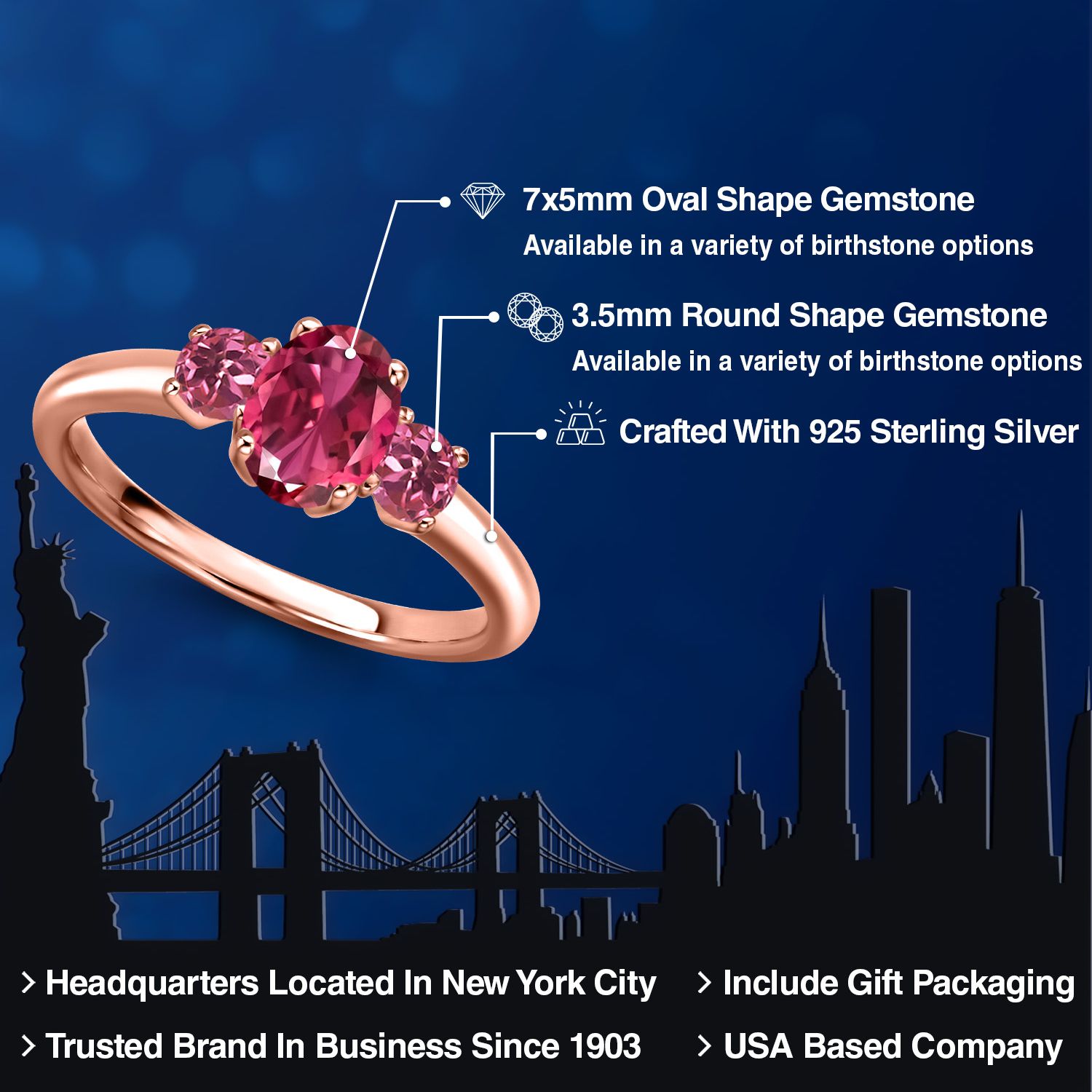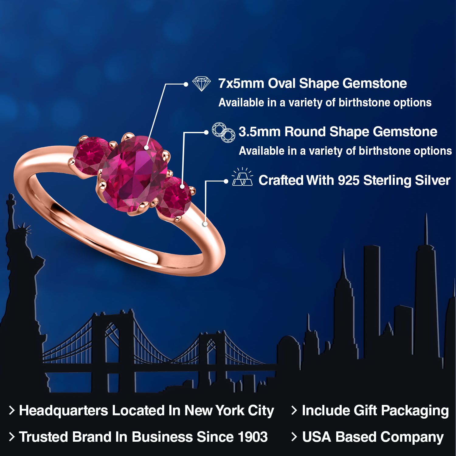 Gemstone Birthstone 3-Stone Engagement Ring for Women in 18K Rose Gold Plated Silver | Oval 7X5MM and Round 3MM | Wedding Anniversary Promise Ring | Sizes 5, 6, 7, 8, 9