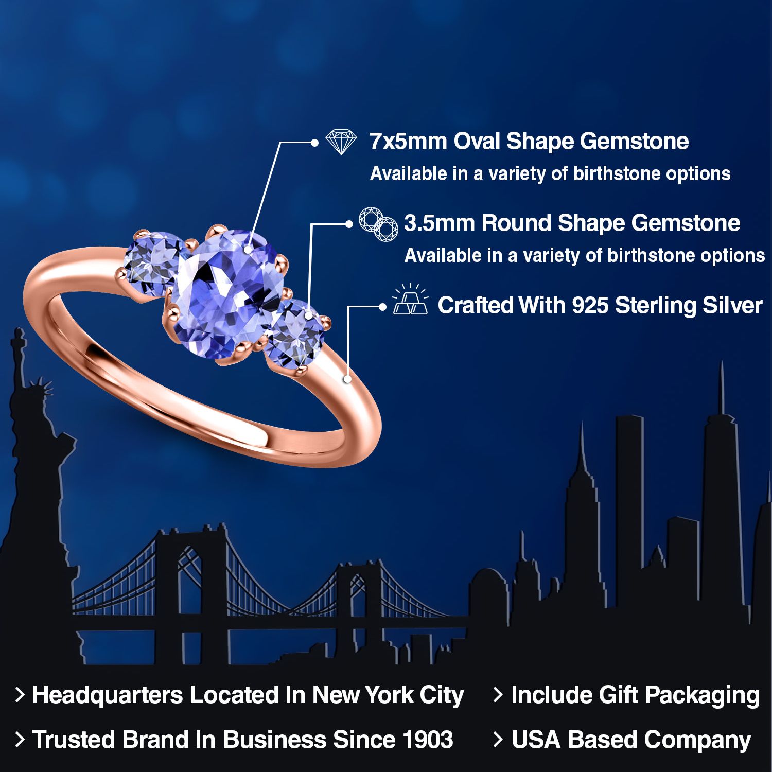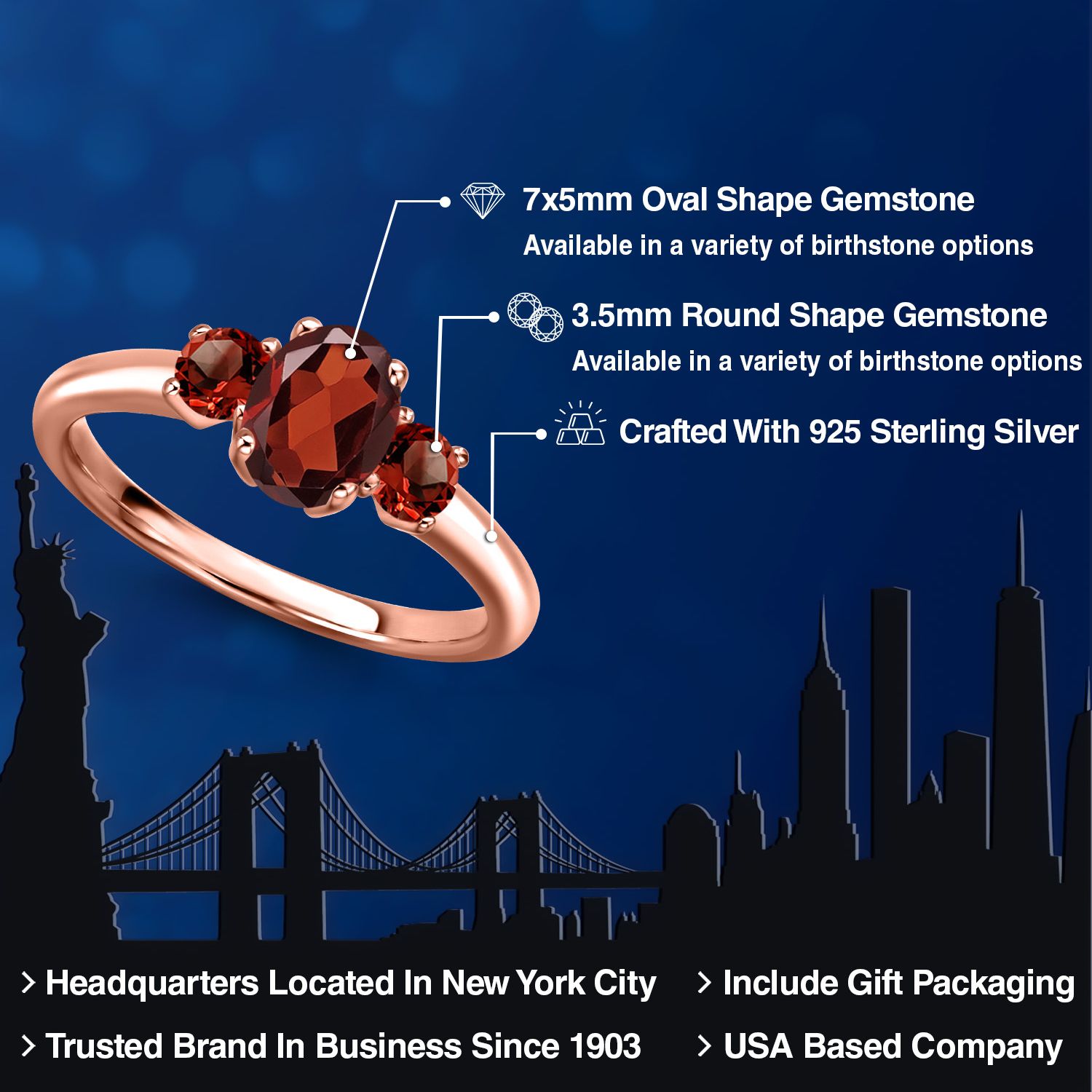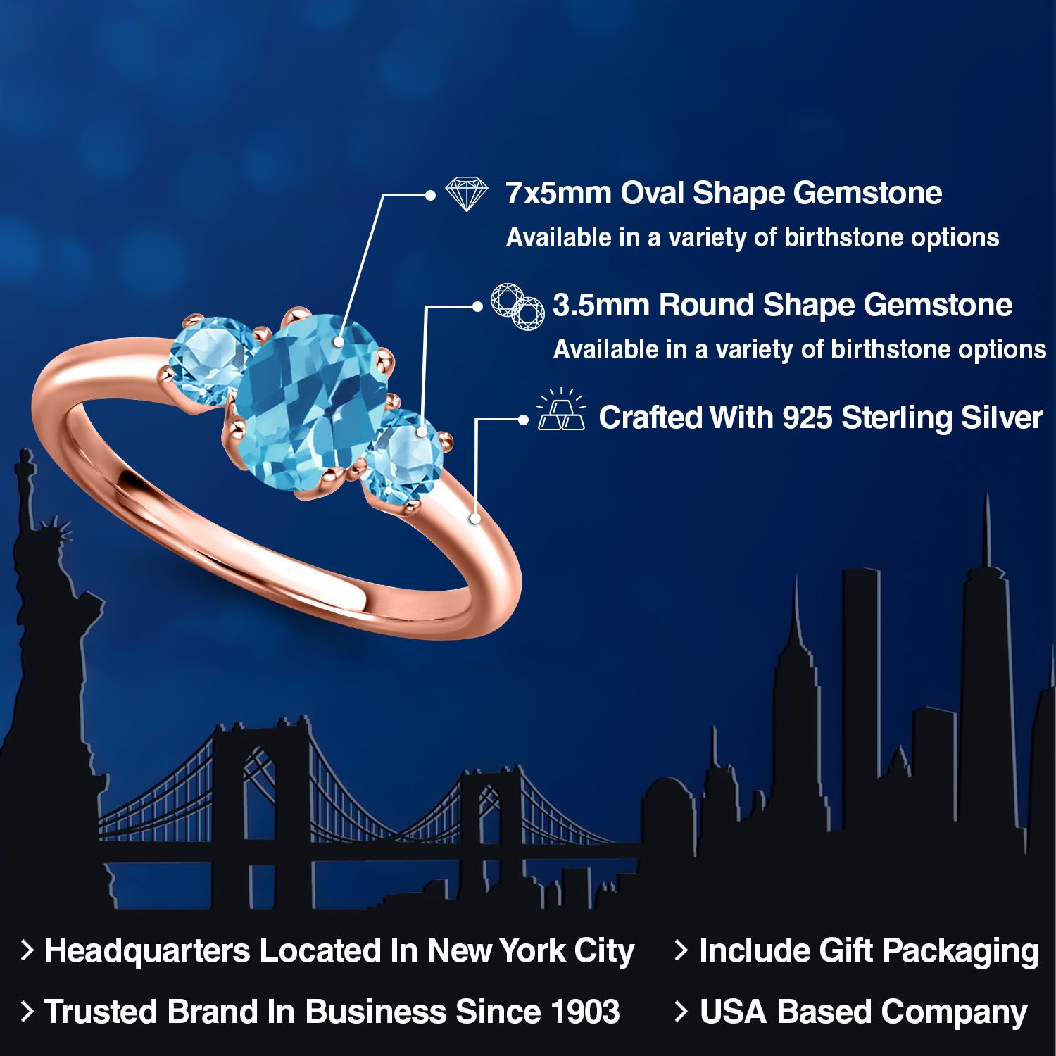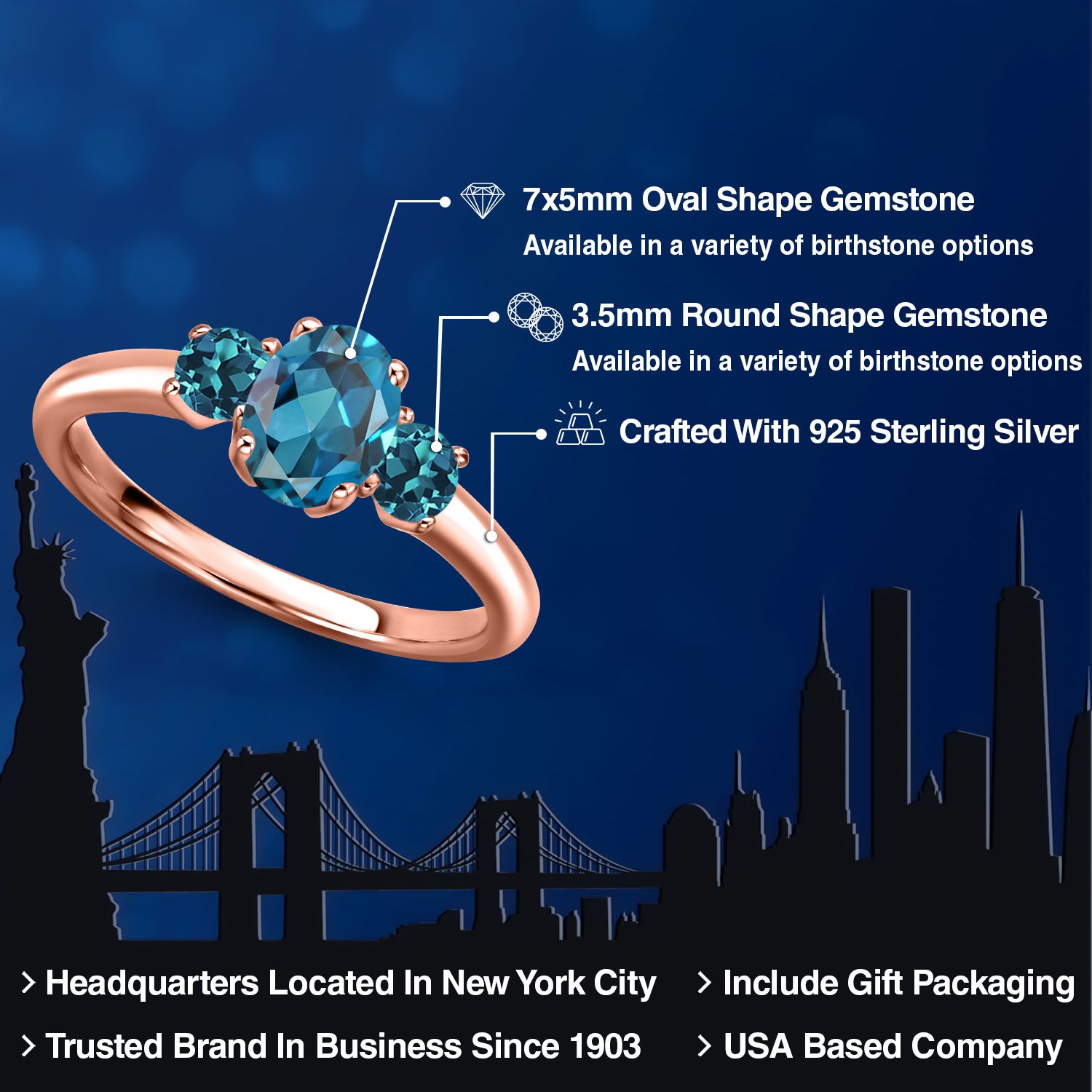 Gemstone Birthstone 3-Stone Engagement Ring for Women in 18K Rose Gold Plated Silver | Oval 7X5MM and Round 3MM | Wedding Anniversary Promise Ring | Sizes 5, 6, 7, 8, 9