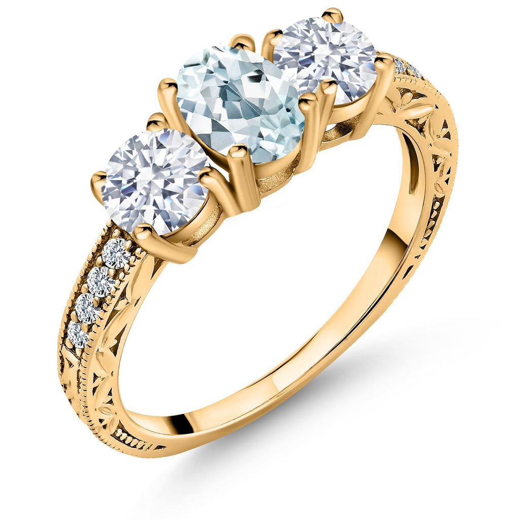 18K Yellow Gold Plated Silver Gemstone Birthstone 3-Stone Engagement Ring for Women | Oval 7X5MM and Round 5MM | Filigree and Milgrain Detail | Three Stone Wedding Anniversary Promise Ring | Size 5-9
