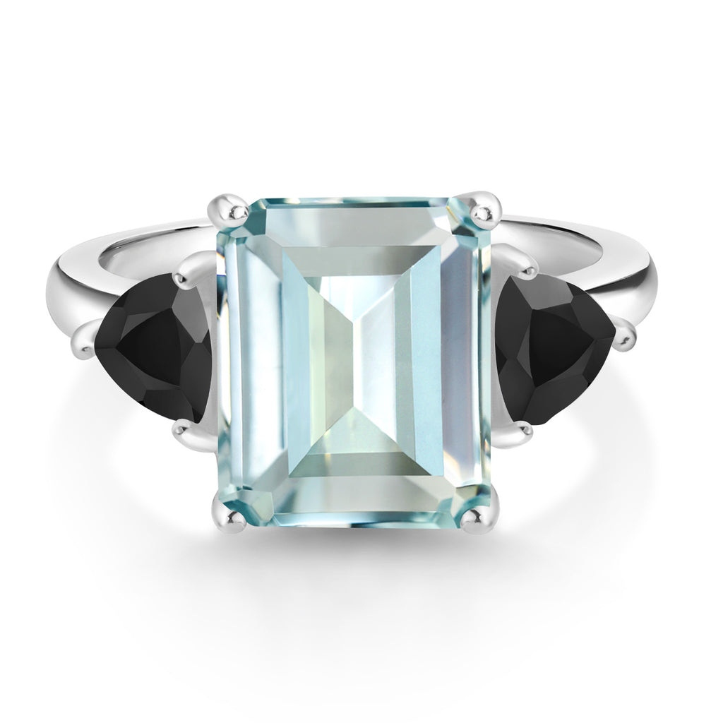 Gemstone Birthstone and Black Onyx 3-Stone Ring For Women In 925 Sterling Silver | Emerald Cut 12X10MM | Trillion 5X5MM | Wedding Anniversary Promise Ring | Sizes 5, 6, 7, 8, 9