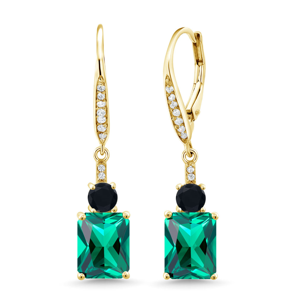 Gemstone Birthstone and Black Onyx Dangle Earrings for Women | 18K Yellow Gold Plated Silver | Emerald Cut 9X7MM with 4MM Round Accent | Elegant Drop Design | Gift for Her Wife Mom