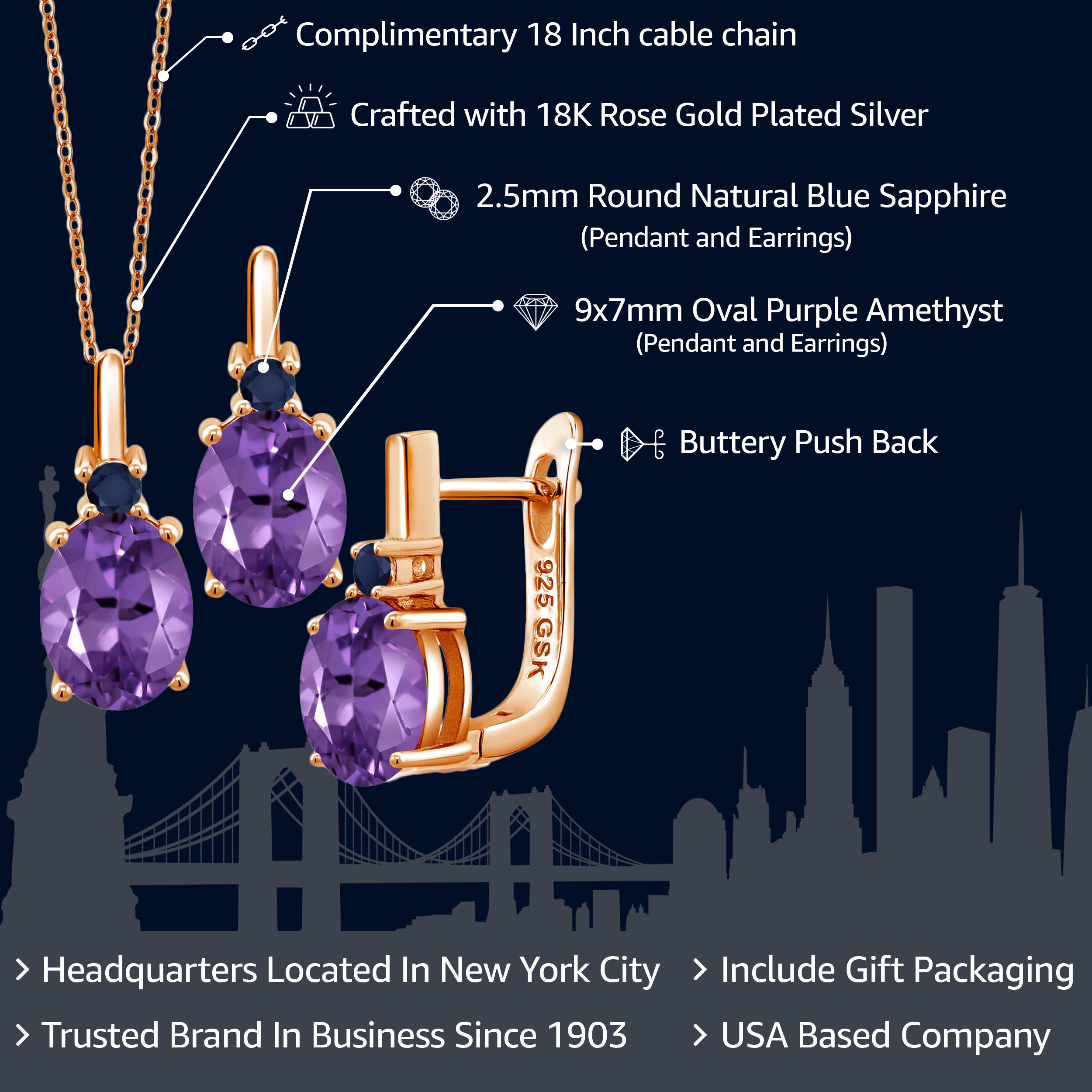 LUXURIOUS 18K ROSE GOLD PLATING: Crafted in high-quality 18K rose gold plated silver, this jewelry set exudes timeless elegance and warmth. The luxurious metal not only enhances the natural beauty of the gemstones but also offers hypoallergenic benefits, ensuring a comfortable wear. The rich rose hue complements various skin tones, adding a touch of romance and sophistication to any ensemble, whether for a special occasion or everyday elegance.