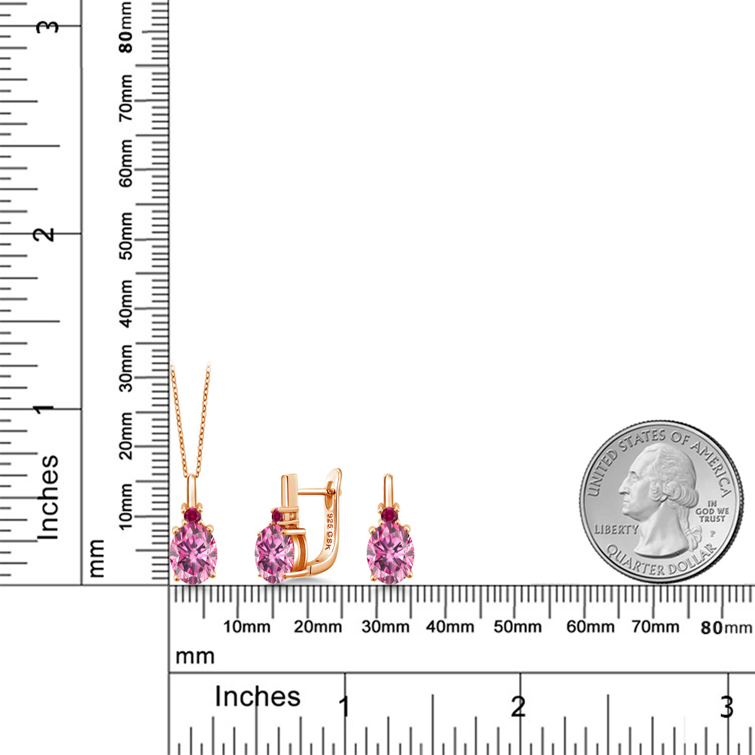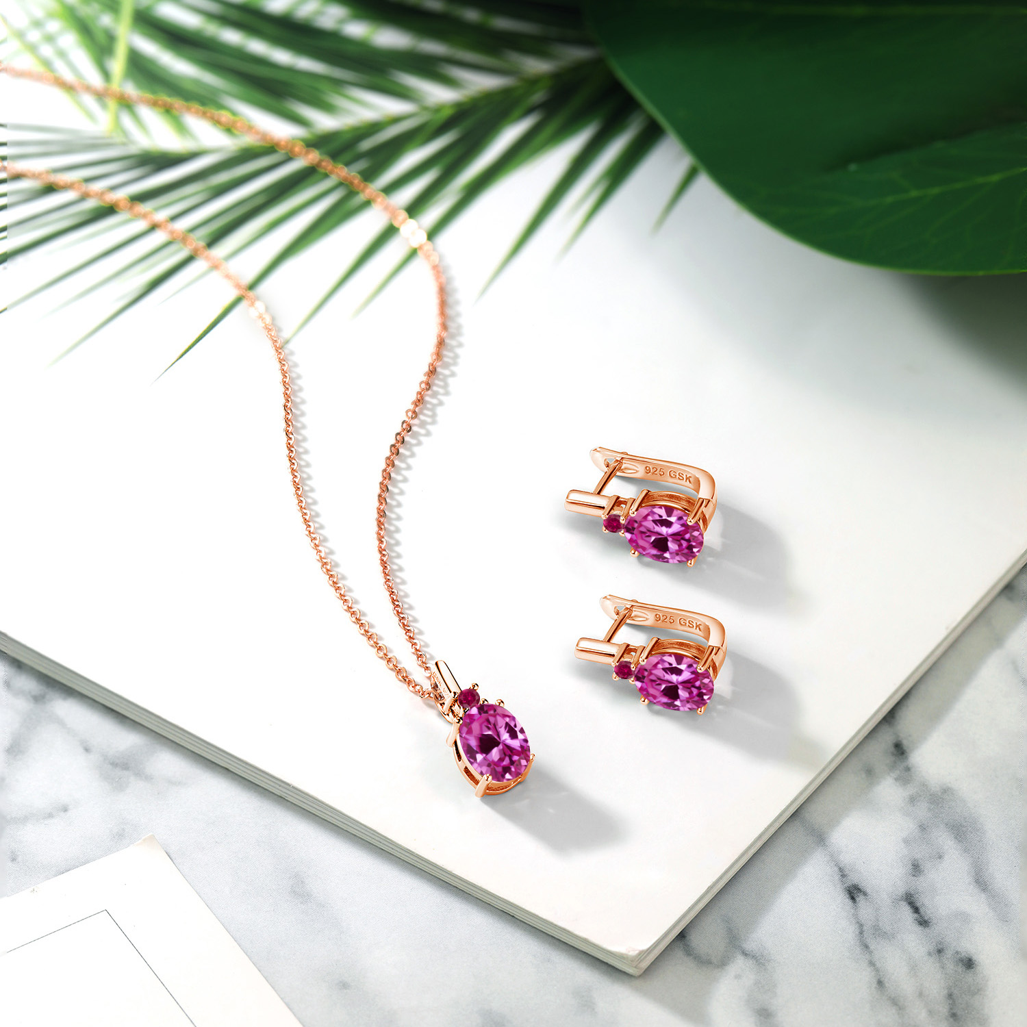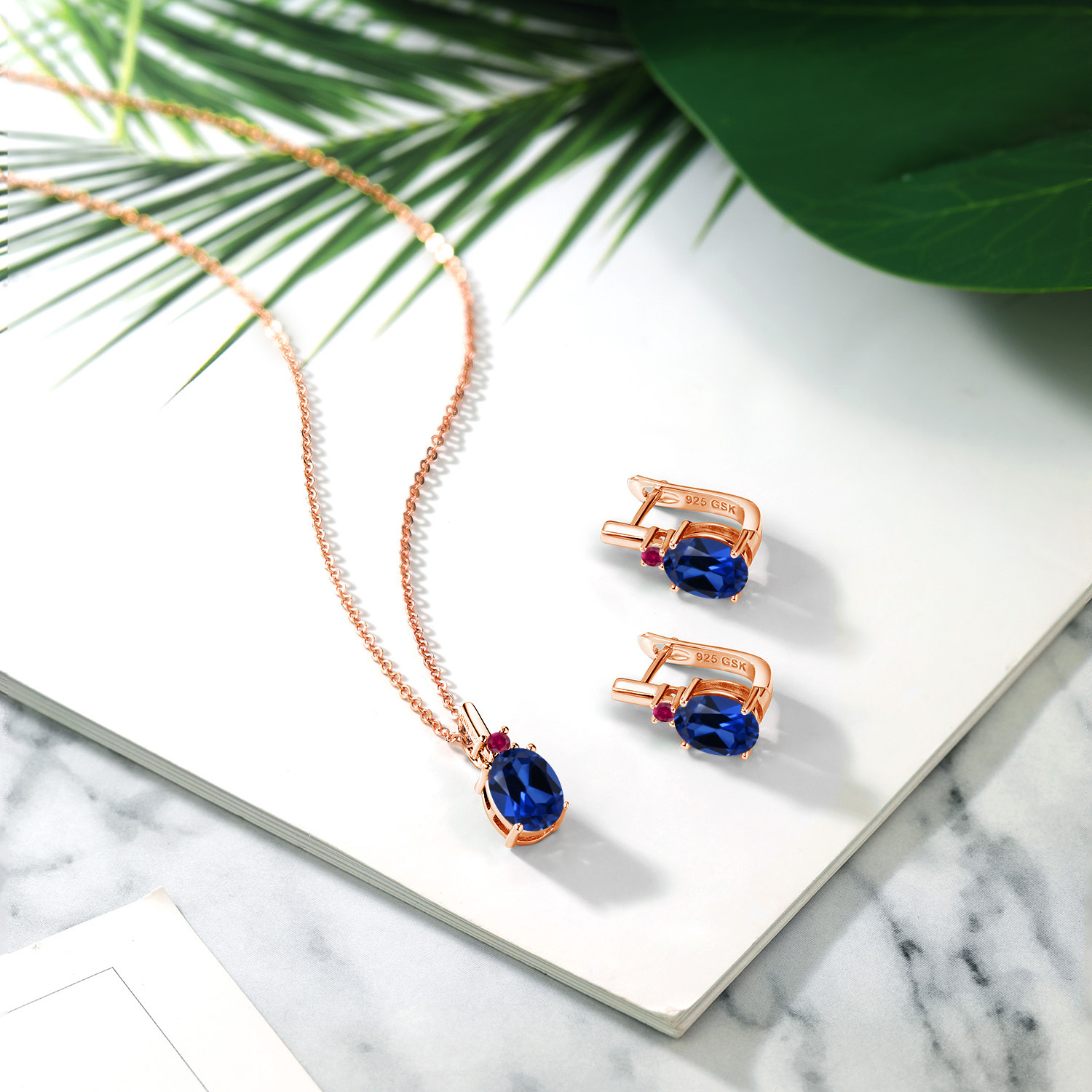 Gemstone Birthstone and Created Ruby Pendant and Earrings Jewelry Set for Women in 18K Rose Gold Plated Silver | Oval 8X6MM and Round 2.5MM | With 18 Inch Chain