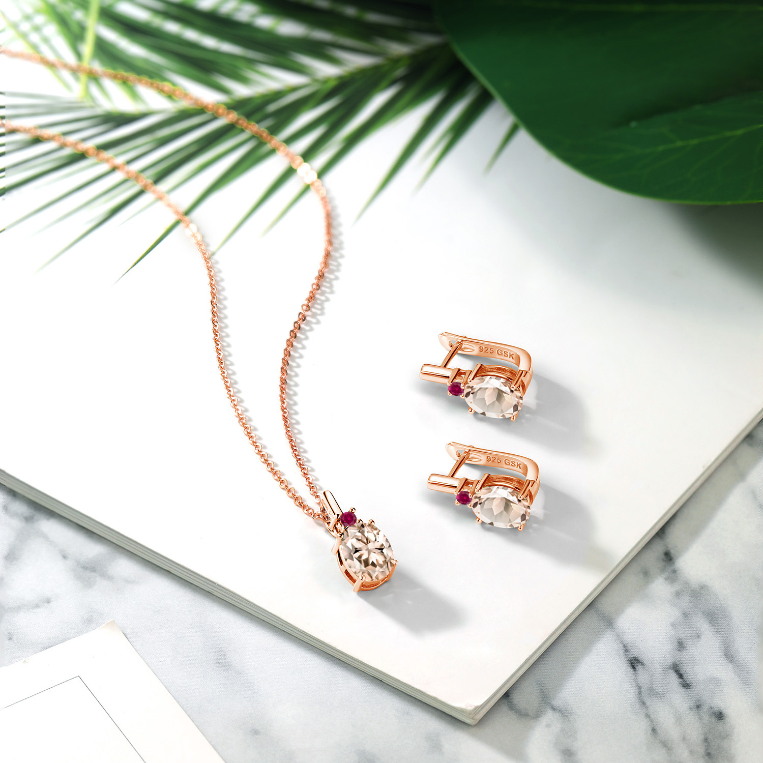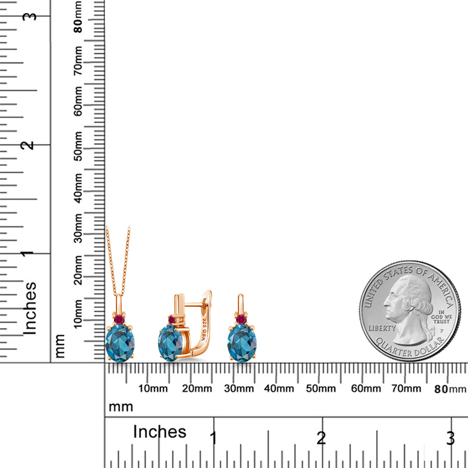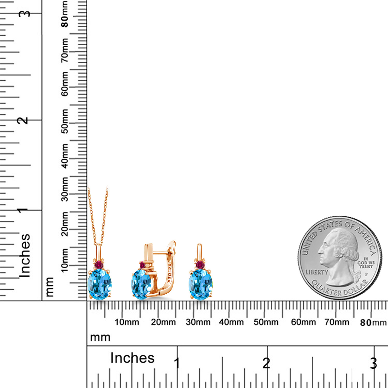 Gemstone Birthstone and Created Ruby Pendant and Earrings Jewelry Set for Women in 18K Rose Gold Plated Silver | Oval 8X6MM and Round 2.5MM | With 18 Inch Chain