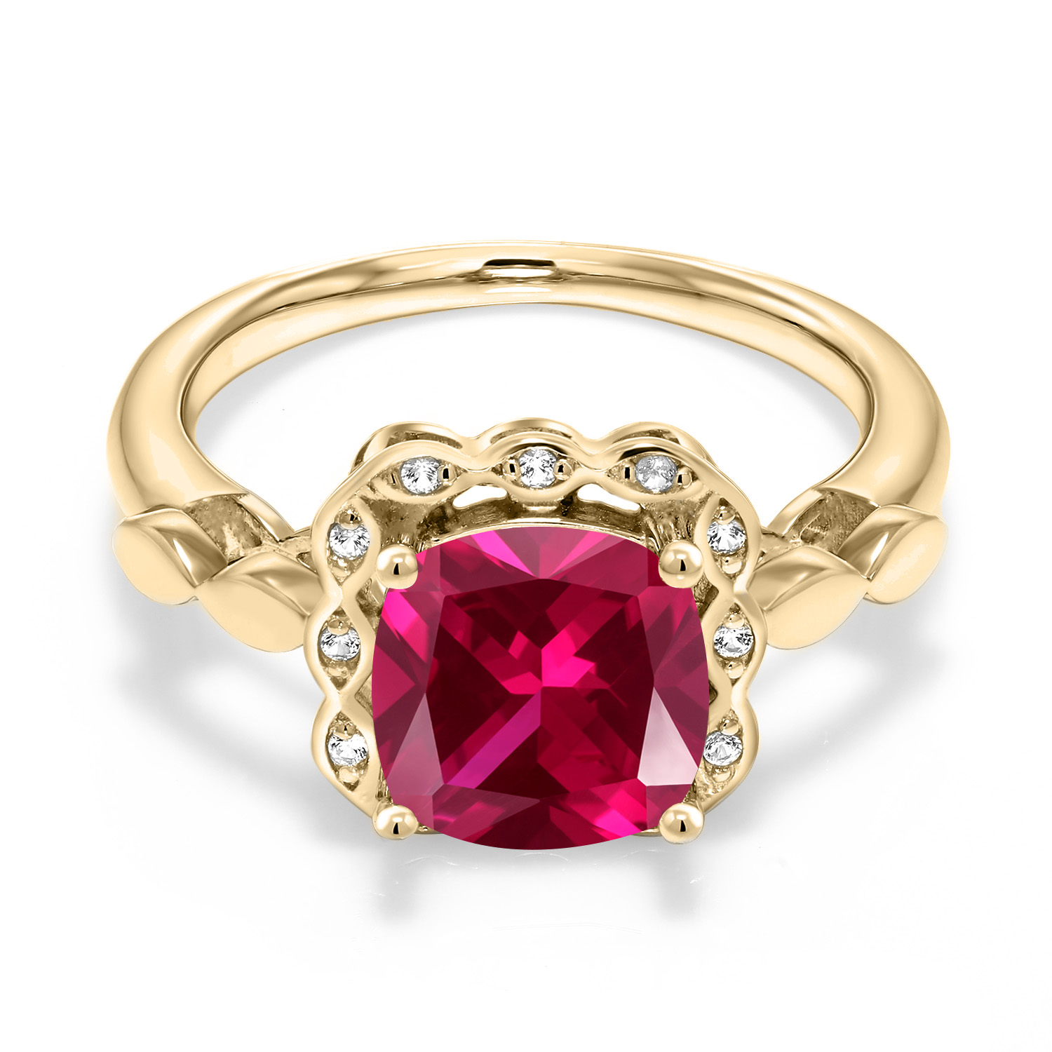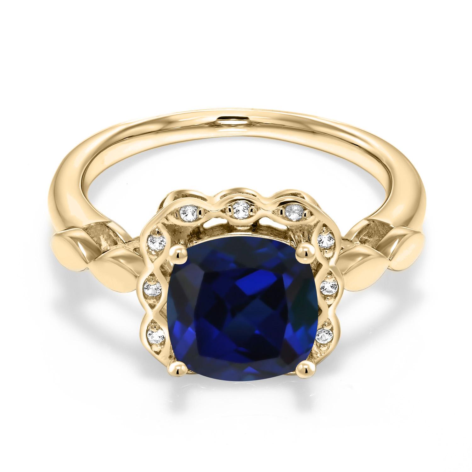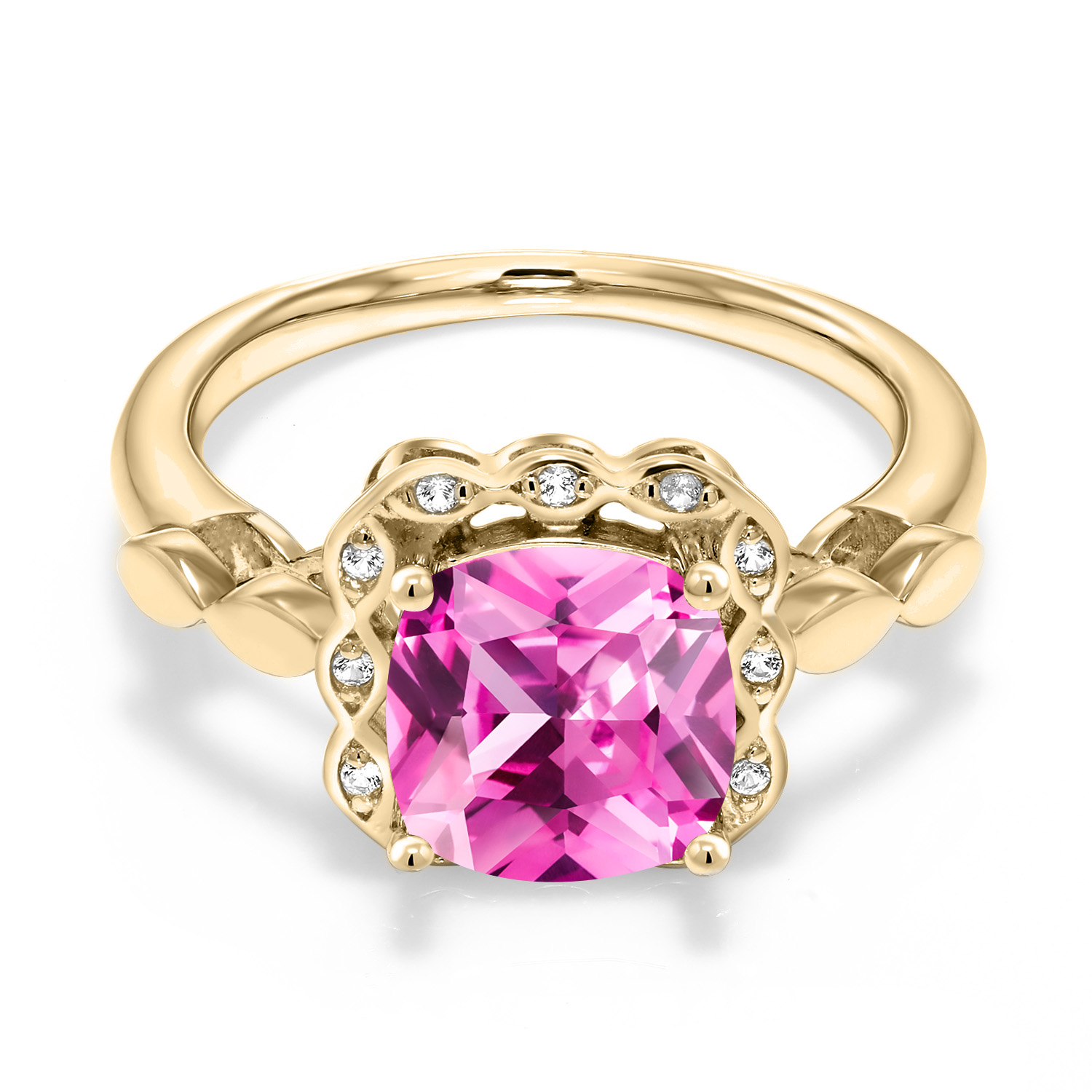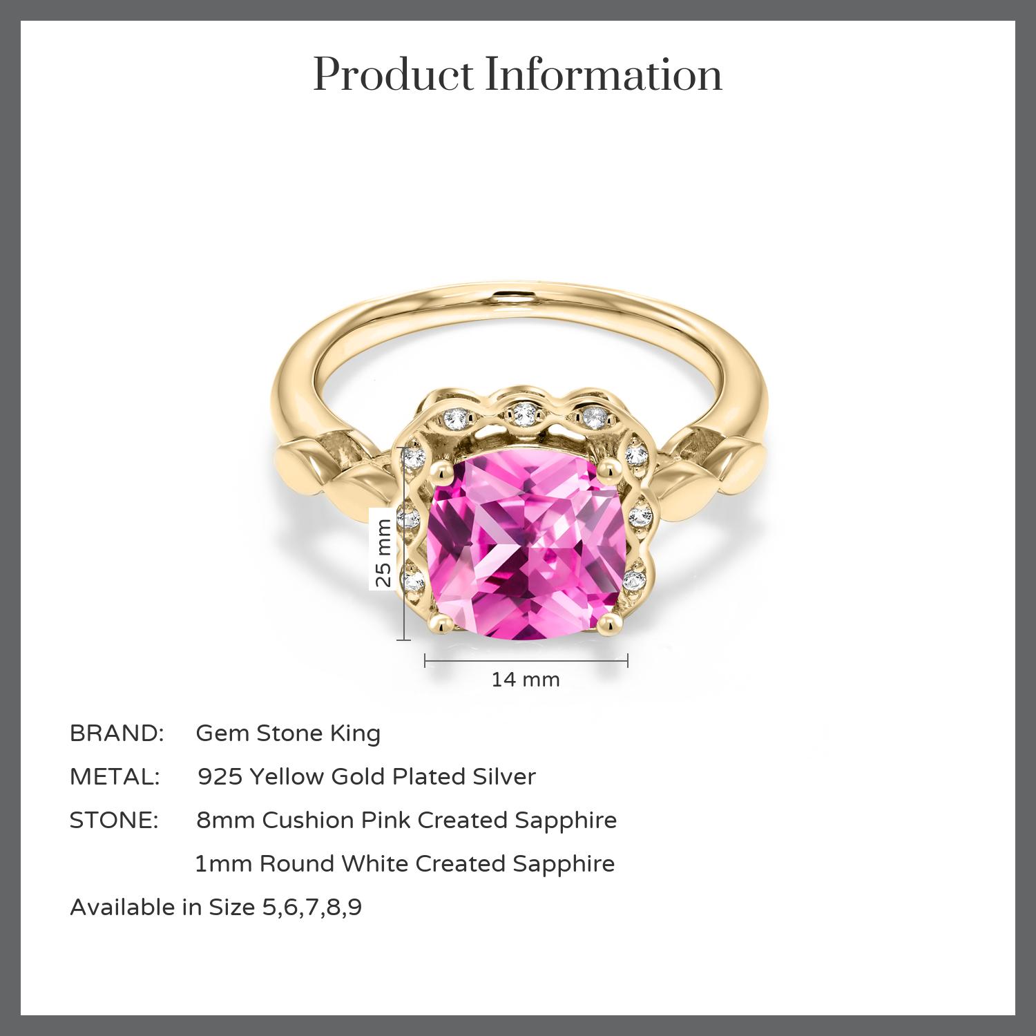 SPARKLING WHITE CREATED SAPPHIRE ACCENTS: Encircling the main gemstone are brilliant white created sapphires that mimic the clarity and sparkle of diamonds. These accents enhance the central stone's beauty and add a touch of elegance and luxury to the overall design.