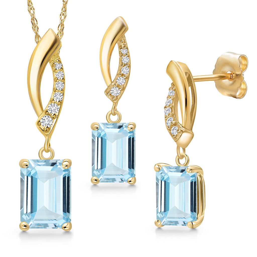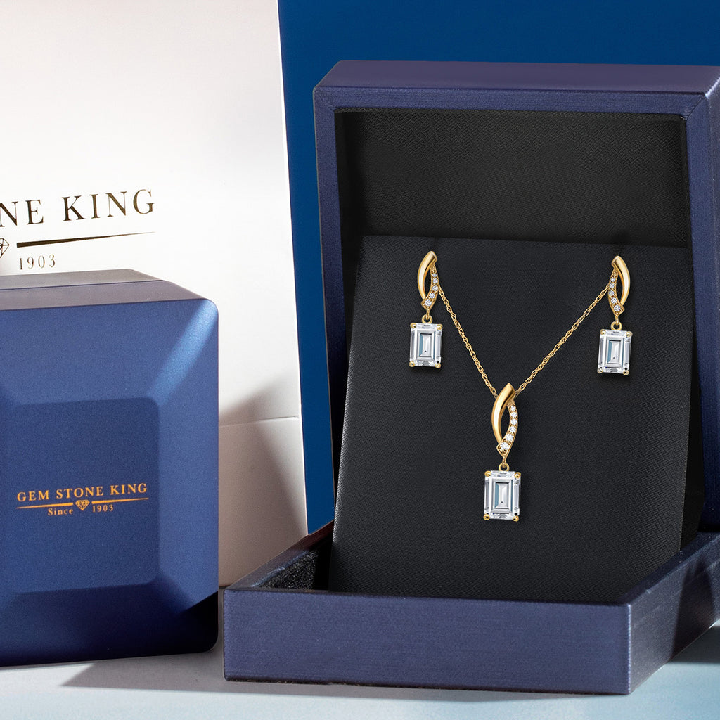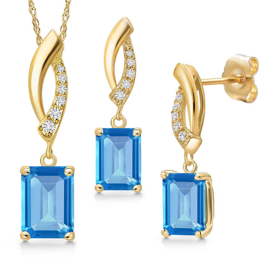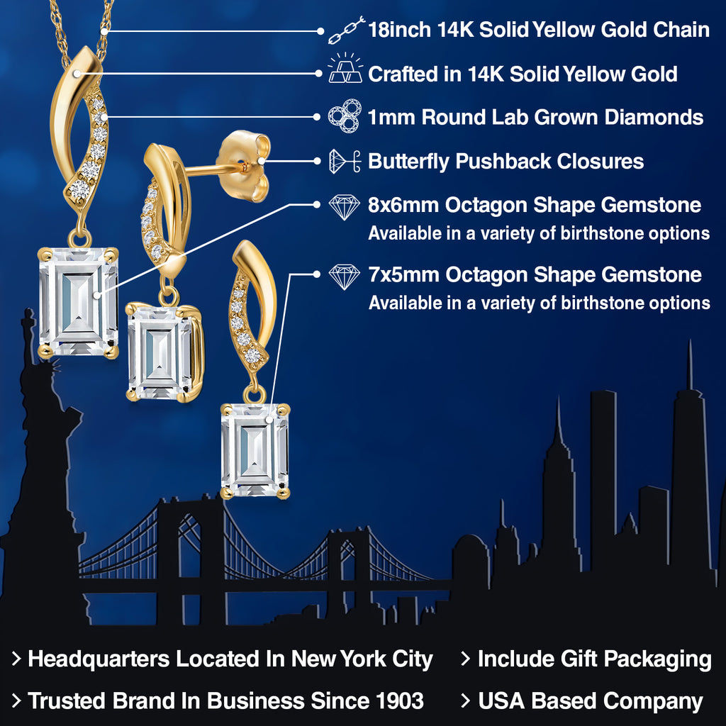 14K Yellow Gold Gemstone Birthstone and Lab Grown Diamond Pendant and Earrings Jewelry Set for Women | Emerald Cut 8X6MM and 7X5MM | Includes 18 Inch Chain