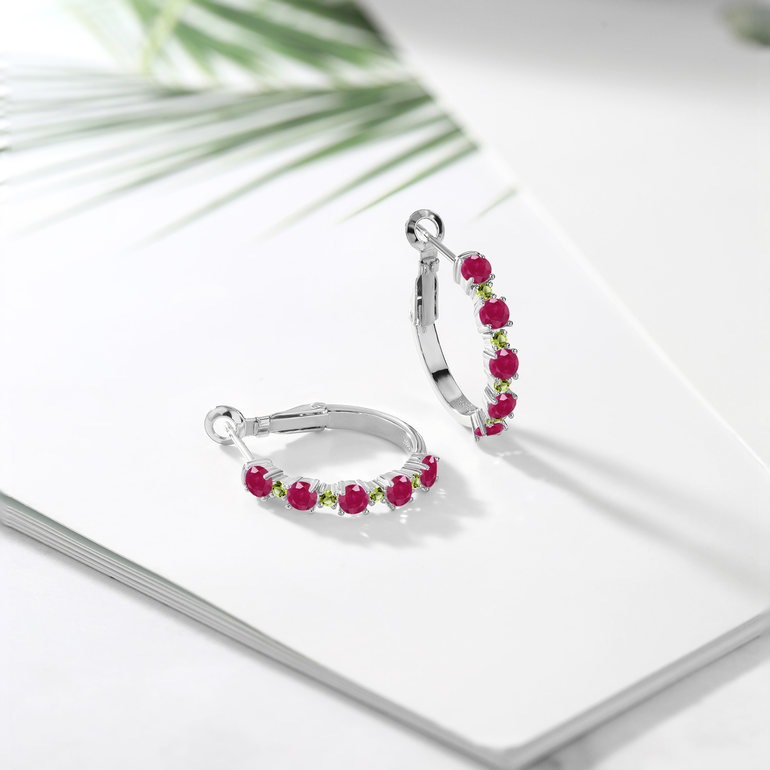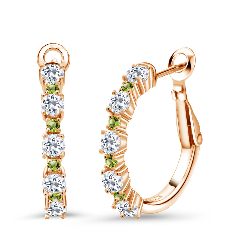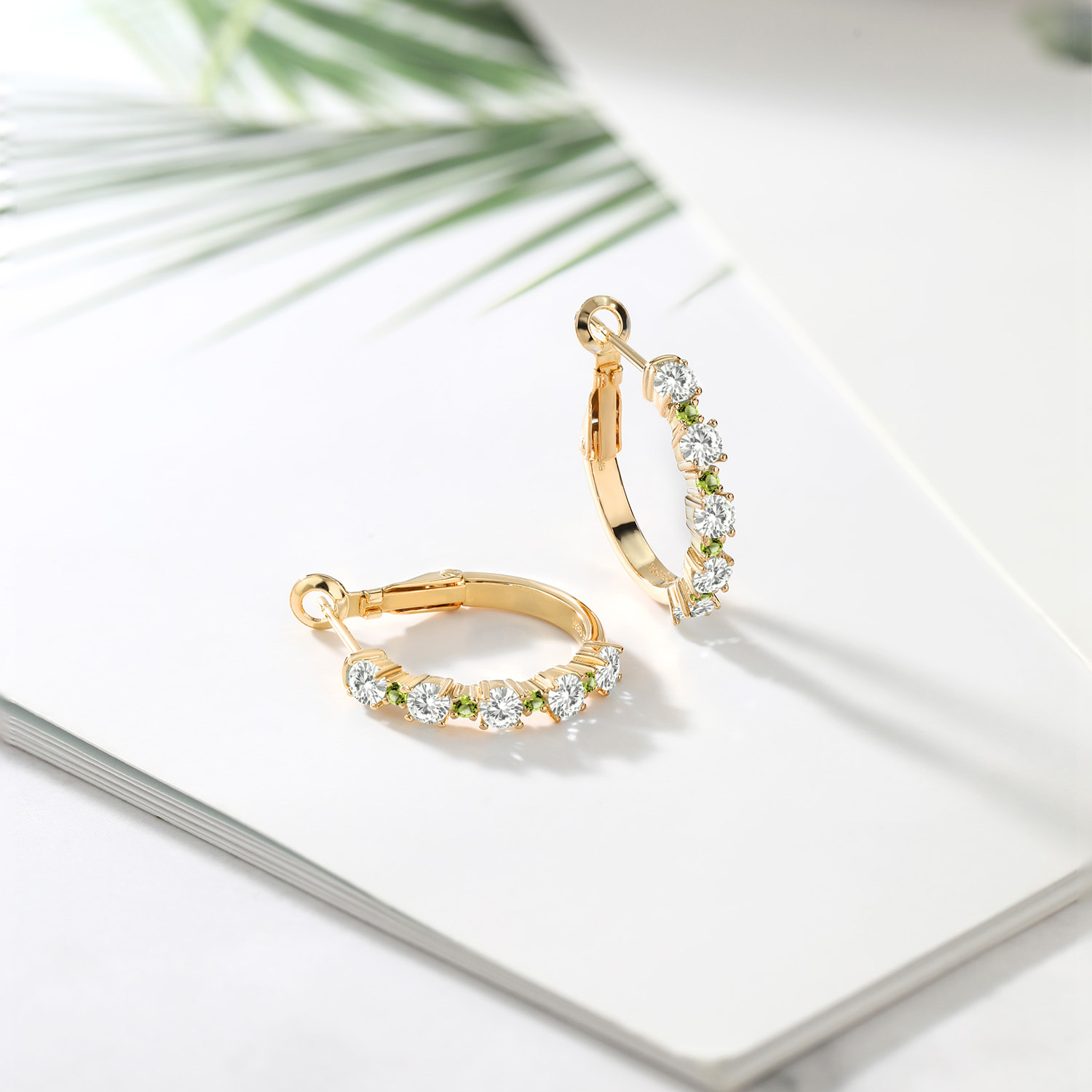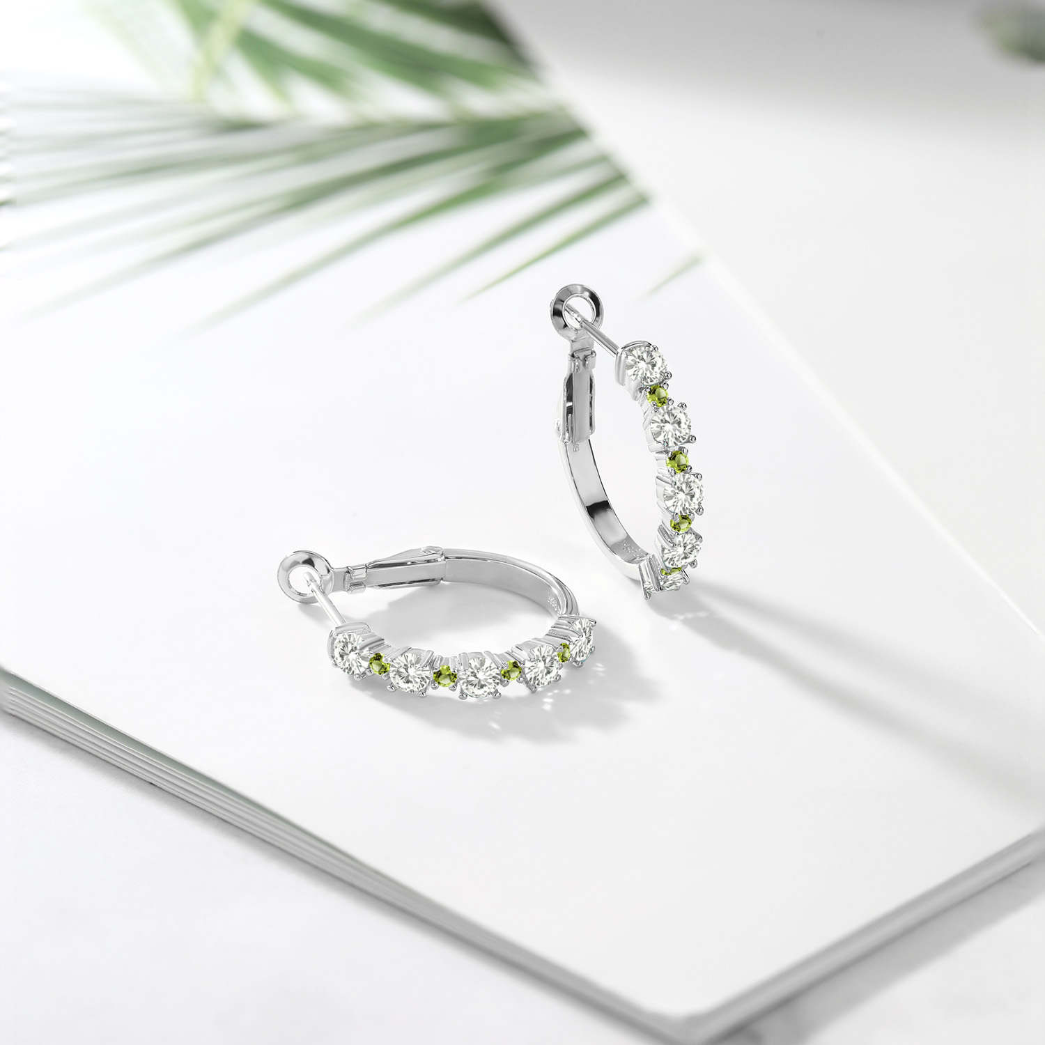 Green Peridot Accents: Alternating 1.8MM green peridot accent stones breathe fresh life into these hoop earrings with their bright, green hue. The prong-set gems dance with movement and light, enhancing their vivid green tones. Measuring 3/7 inch across, the hoops nestle close to the ear for subtle glamour. Designed for comfort and sparkle, these earrings offer a joyful twist to traditional hoop styles with every luminous detail.