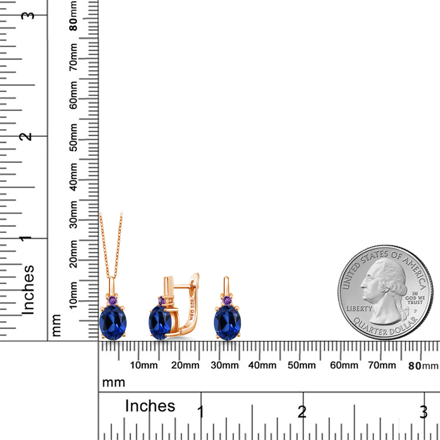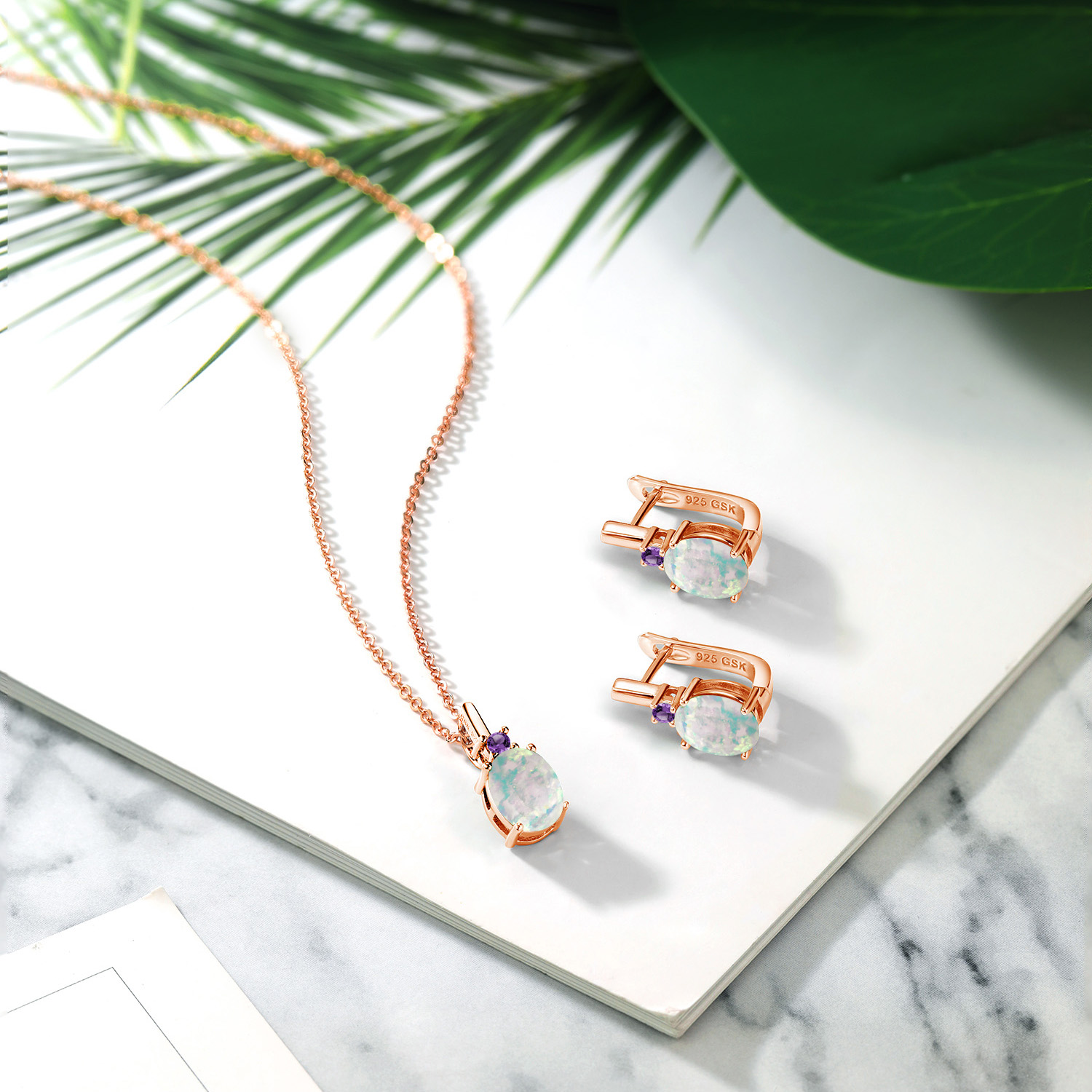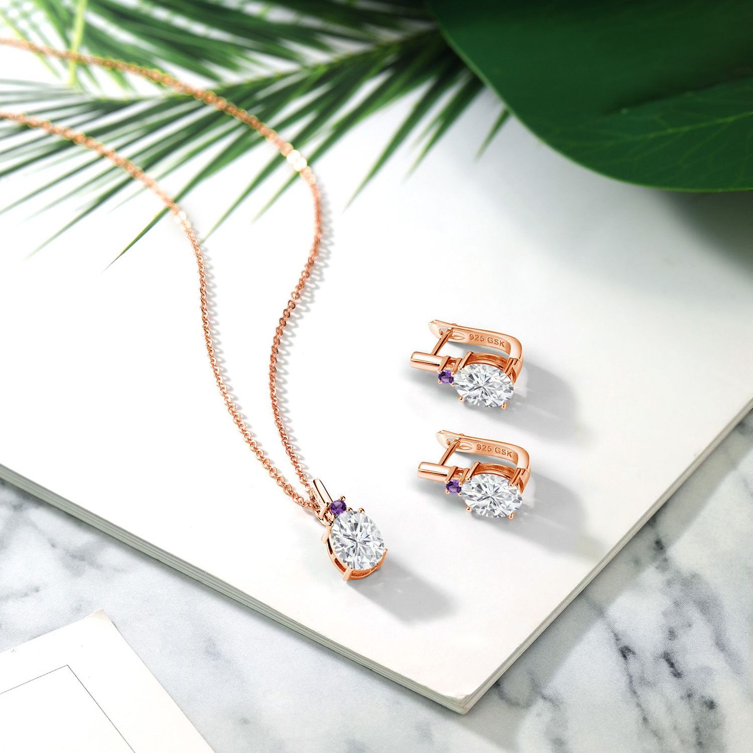 Gemstone Birthstone and Purple Amethyst Pendant and Earrings Jewelry Set for Women in 18K Rose Gold Plated Silver | Oval 8X6MM and Round 2.5MM | With 18 Inch Chain
