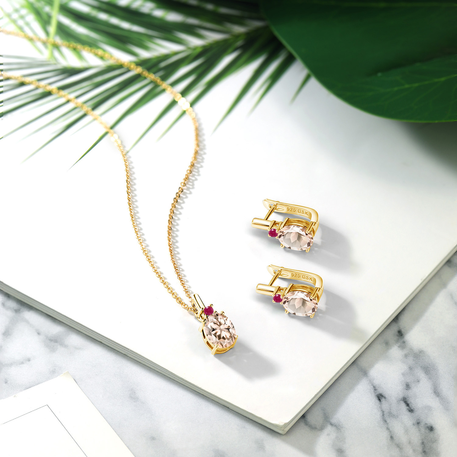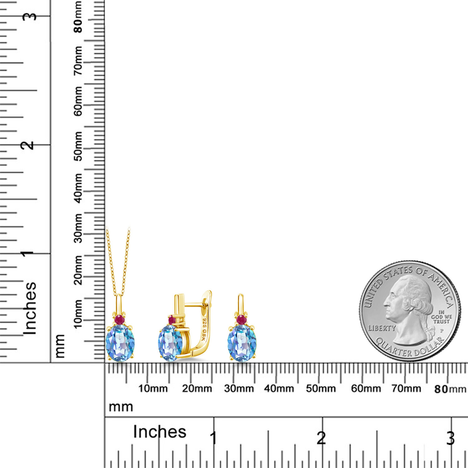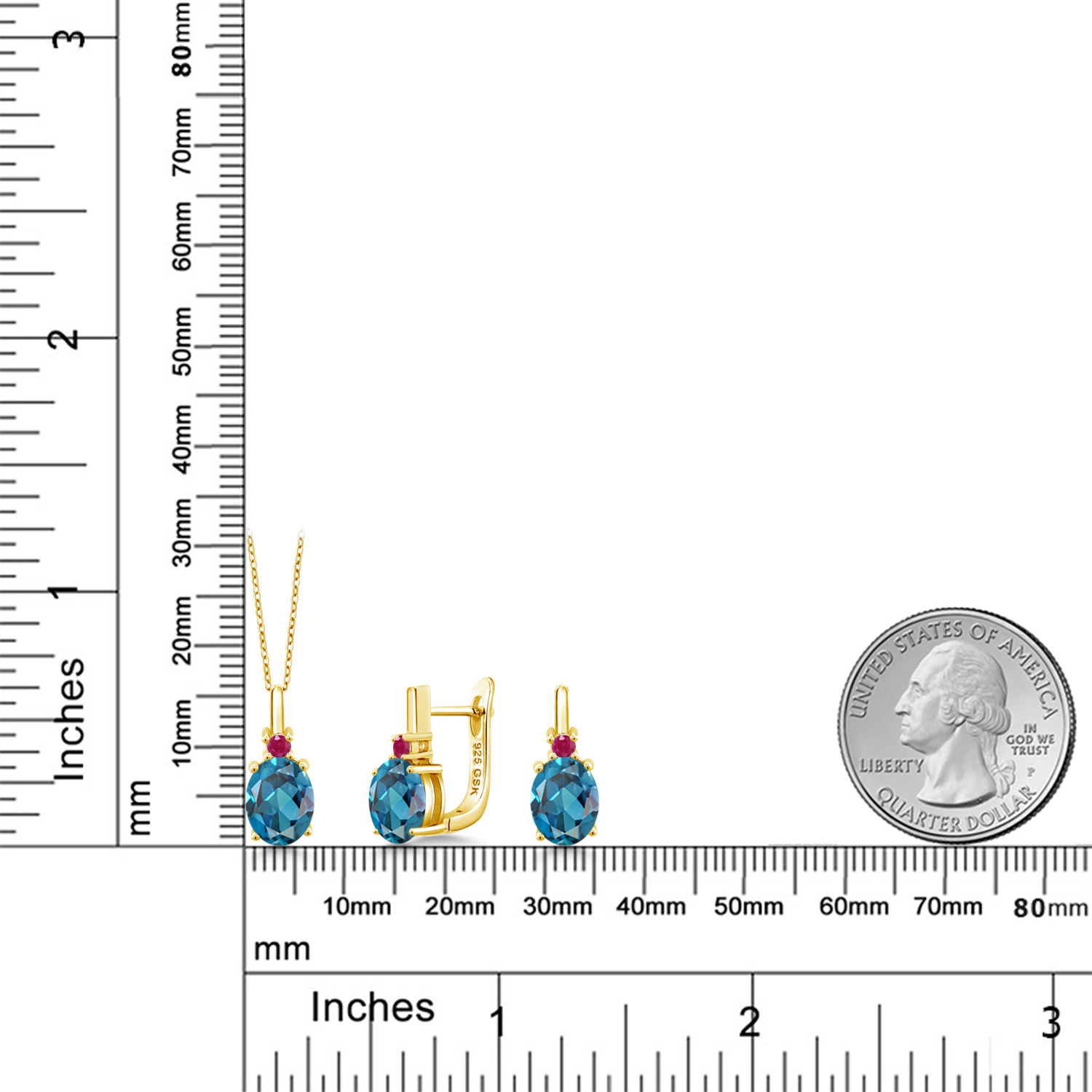Gemstone Birthstone and Ruby Pendant and Earrings Jewelry Set for Women in 18K Yellow Gold Plated Silver | Oval 8X6MM and Round 2.5MM | With 18 Inch Chain