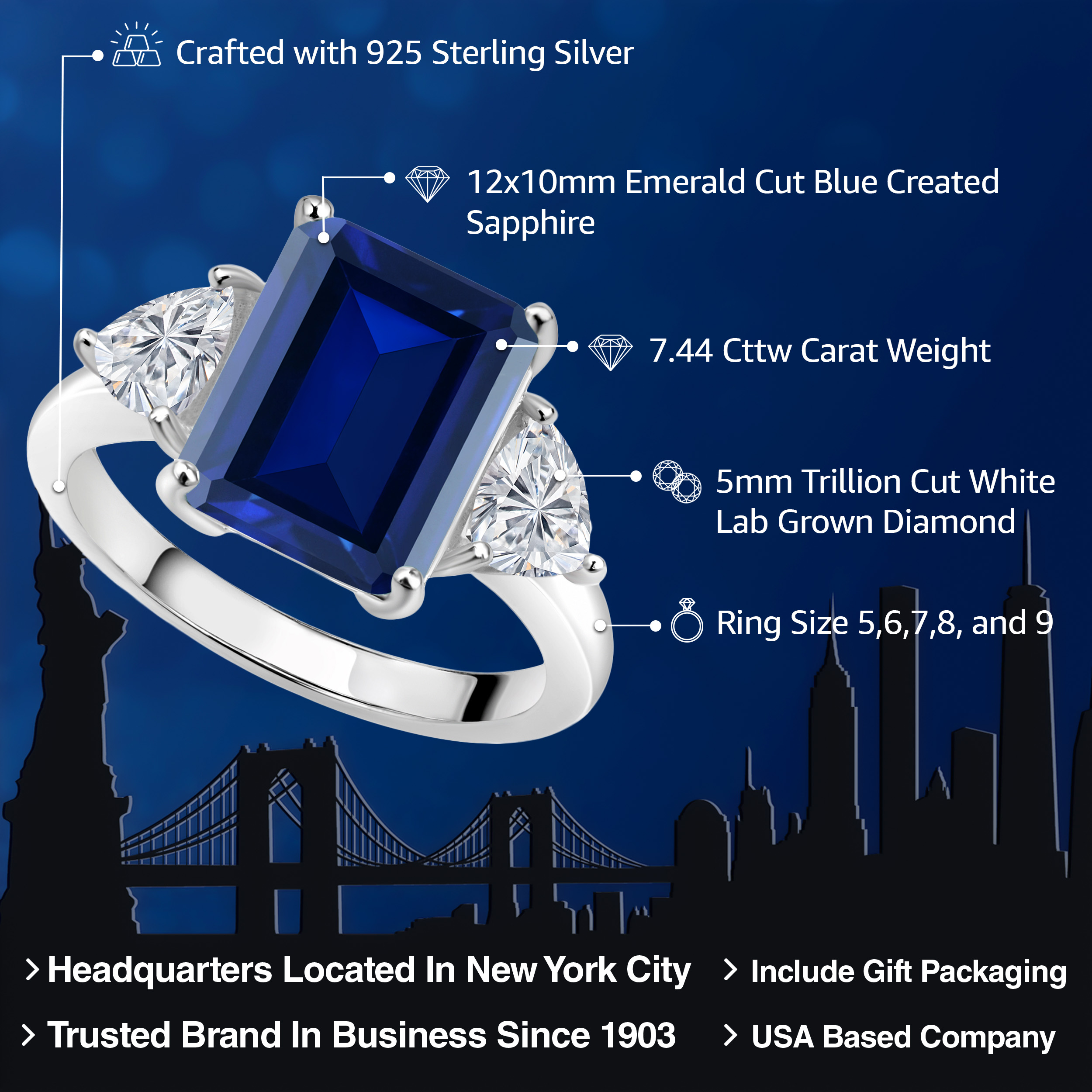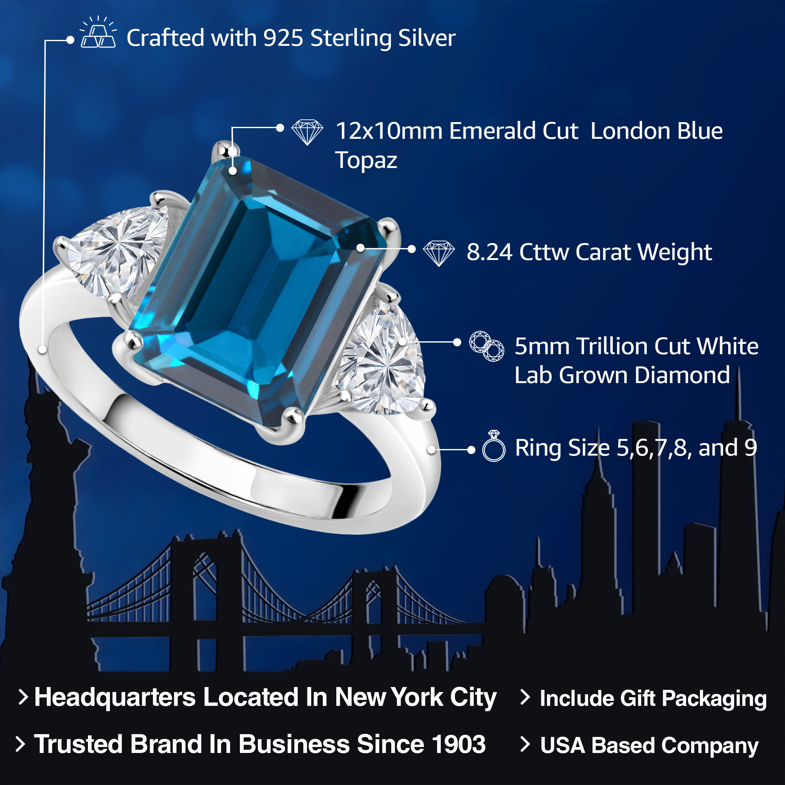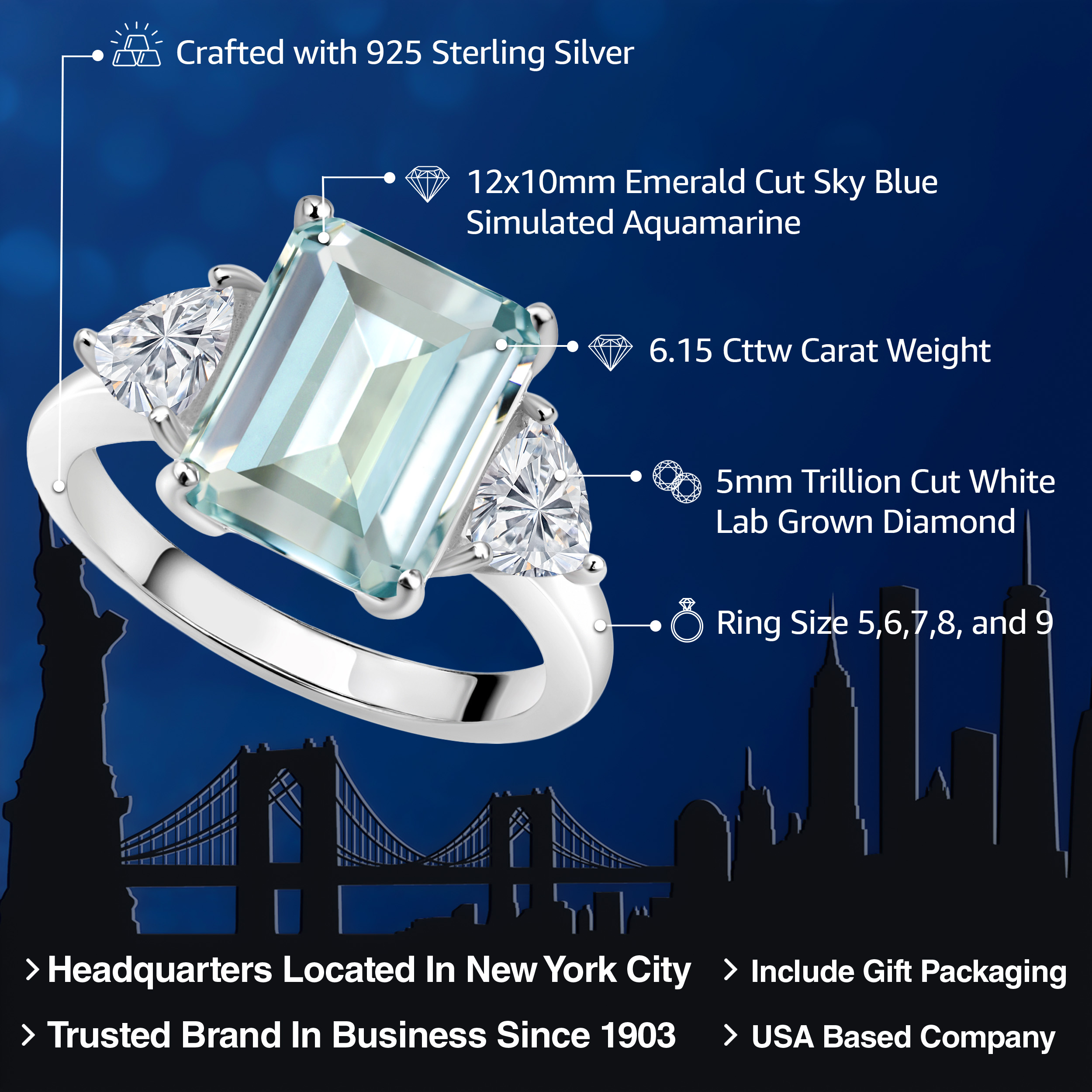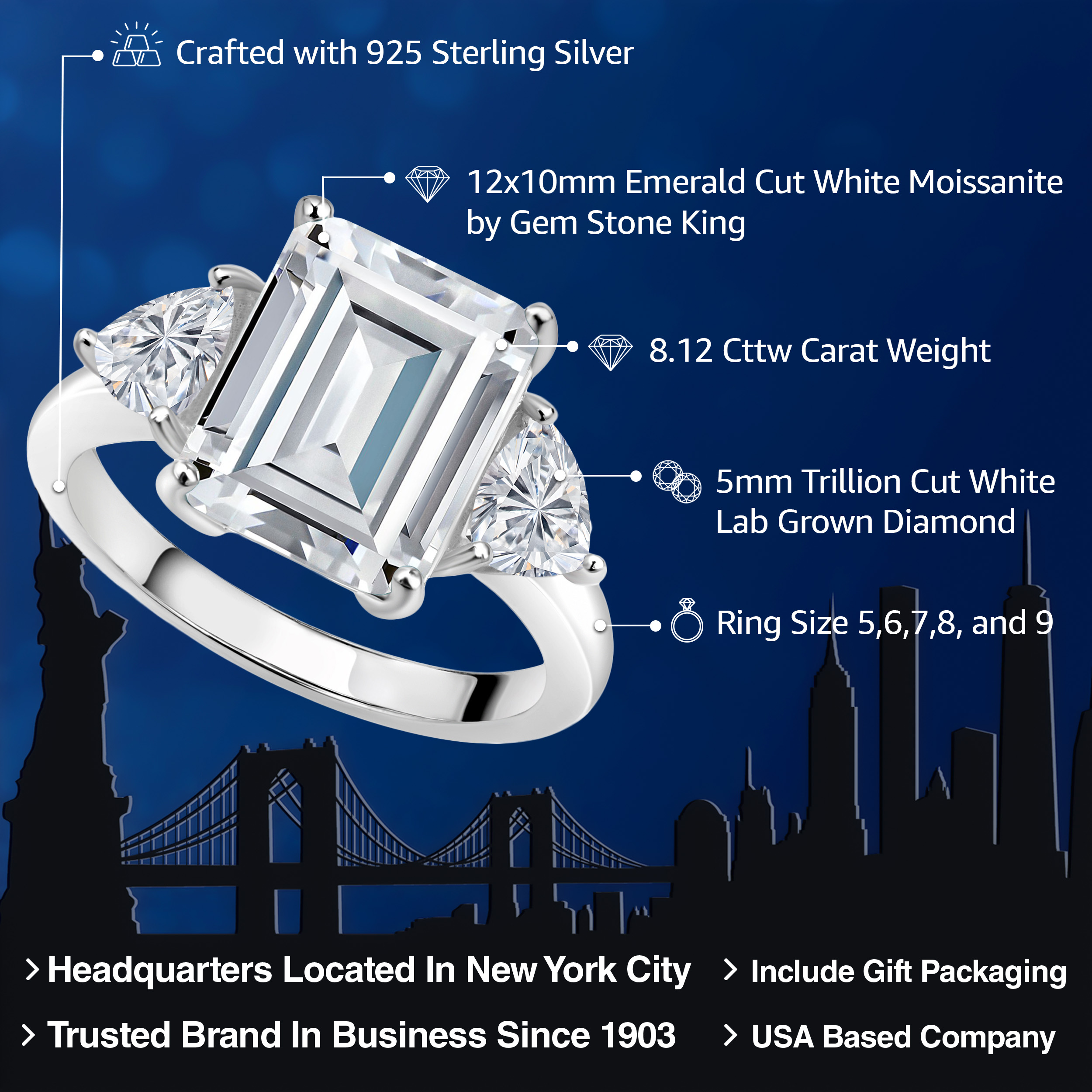 Gemstone Birthstone and White Lab Grown Diamond 3-Stone Ring For Women In 925 Sterling Silver | Emerald Cut 12X10MM | Trillion 5X5MM | Wedding Anniversary Promise Ring | Sizes 5, 6, 7, 8, 9