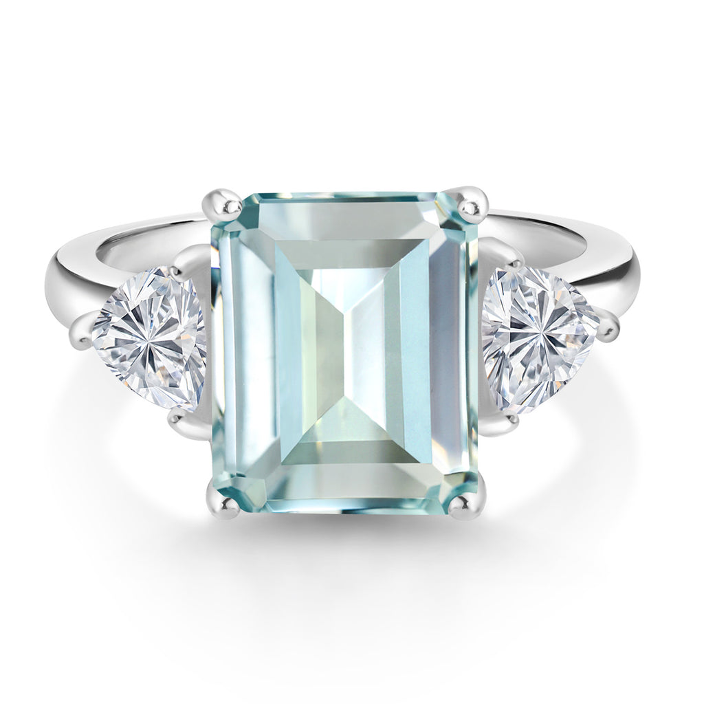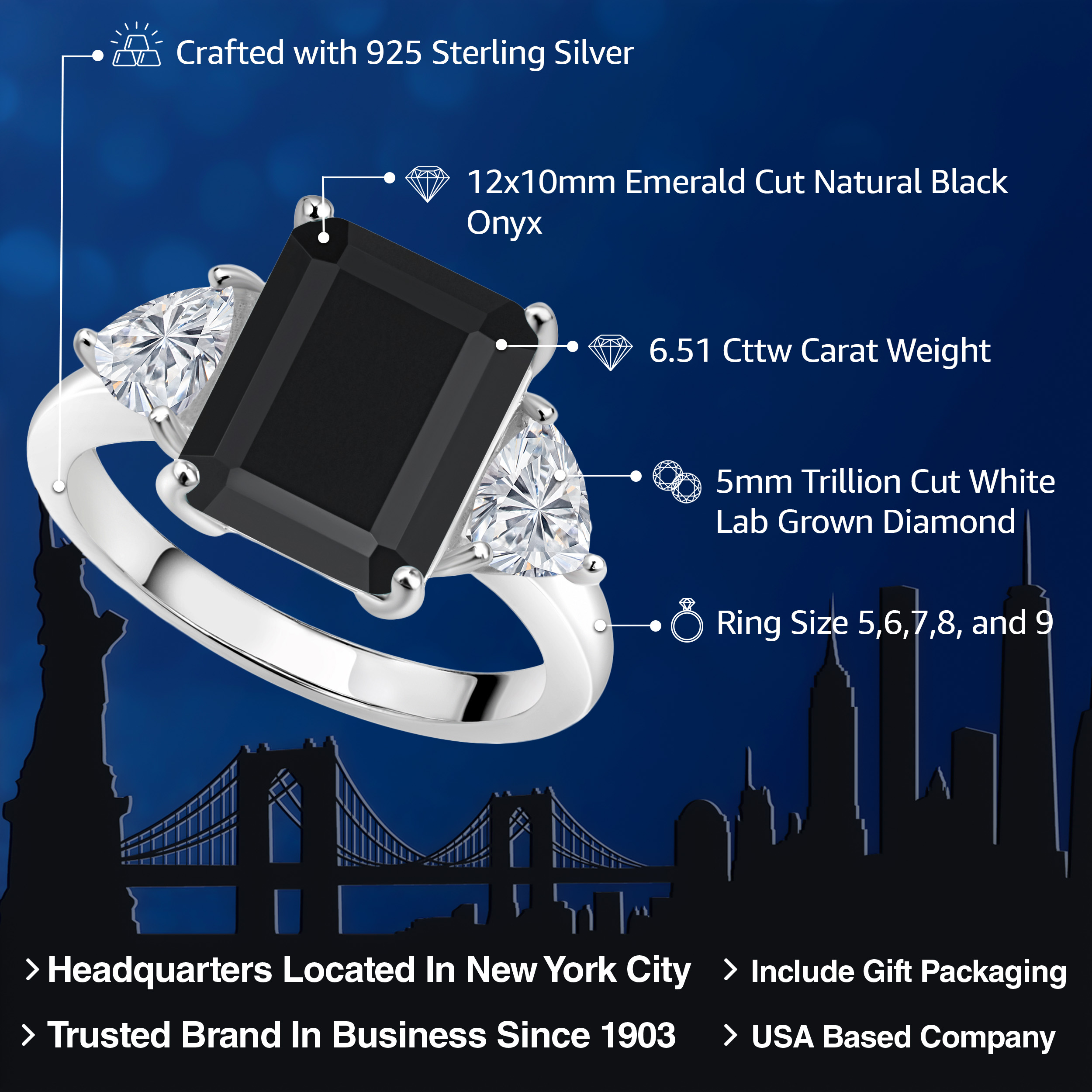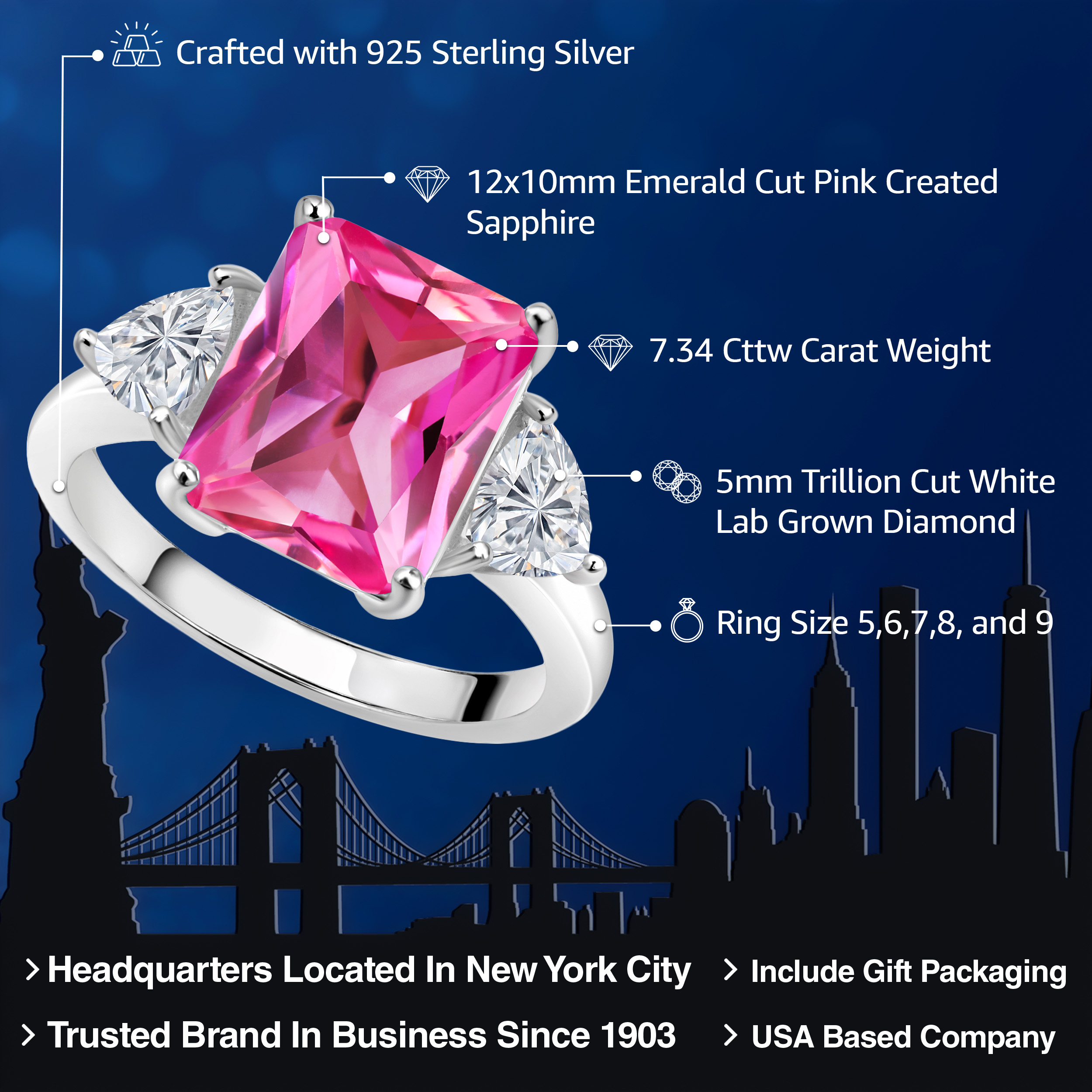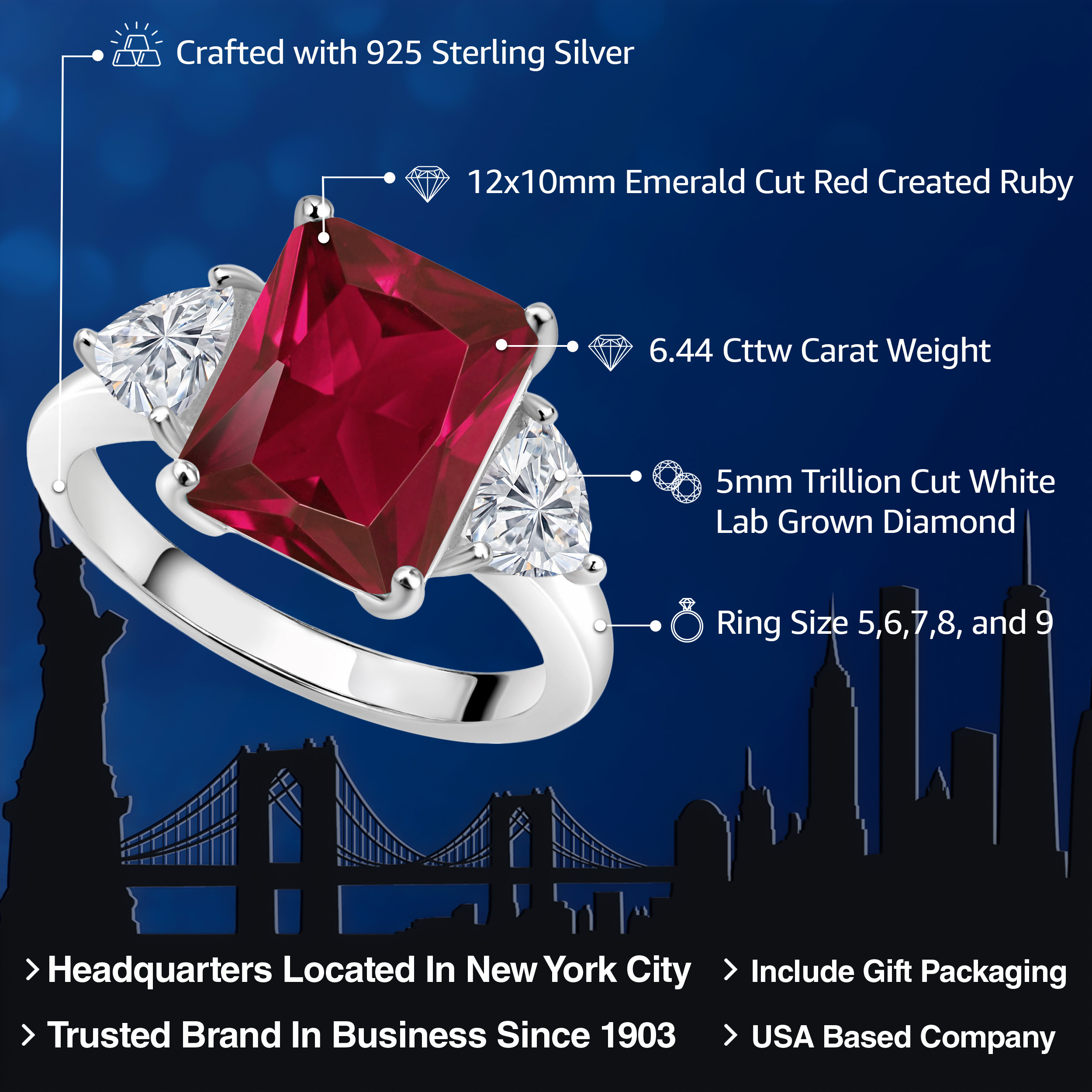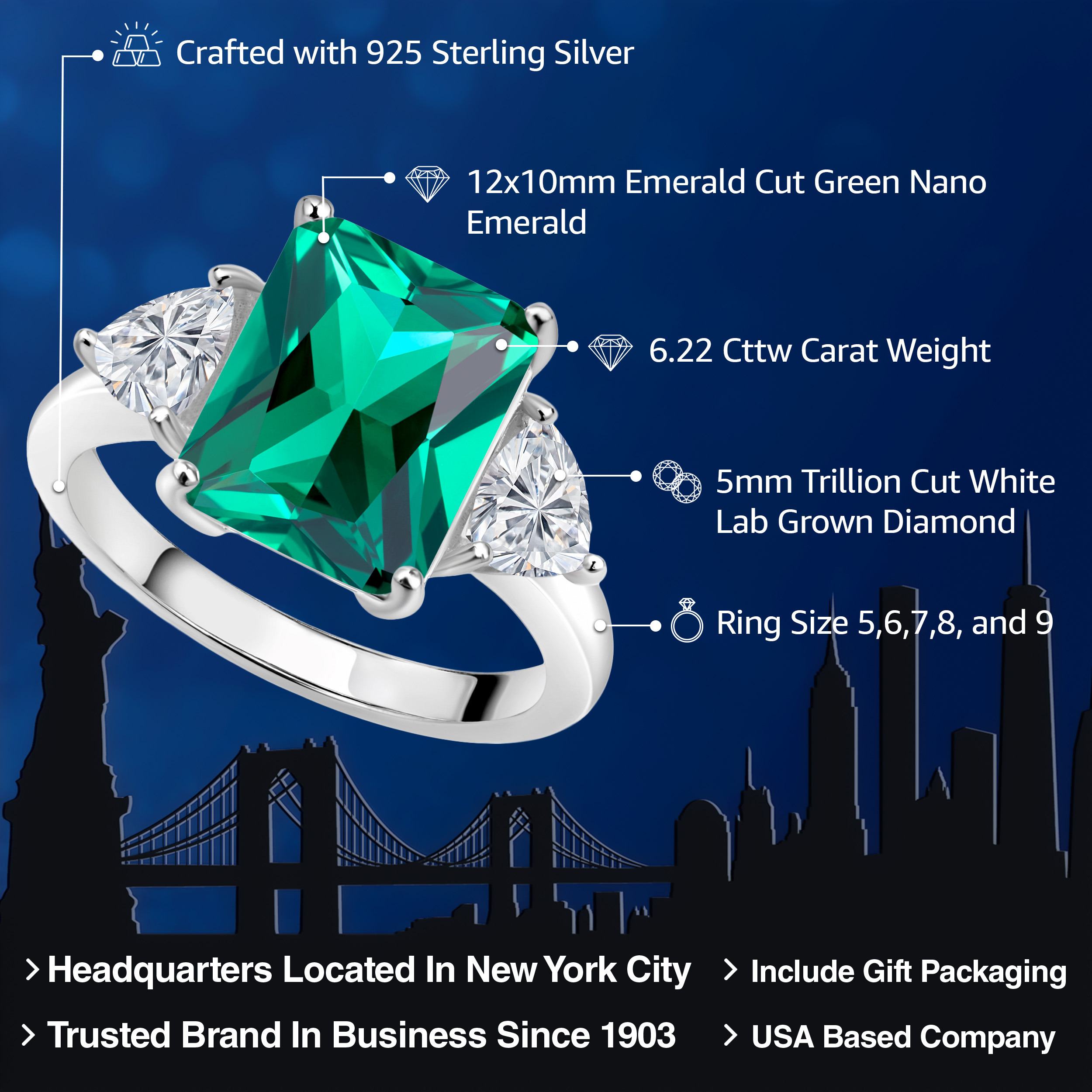 Gemstone Birthstone and White Lab Grown Diamond 3-Stone Ring For Women In 925 Sterling Silver | Emerald Cut 12X10MM | Trillion 5X5MM | Wedding Anniversary Promise Ring | Sizes 5, 6, 7, 8, 9