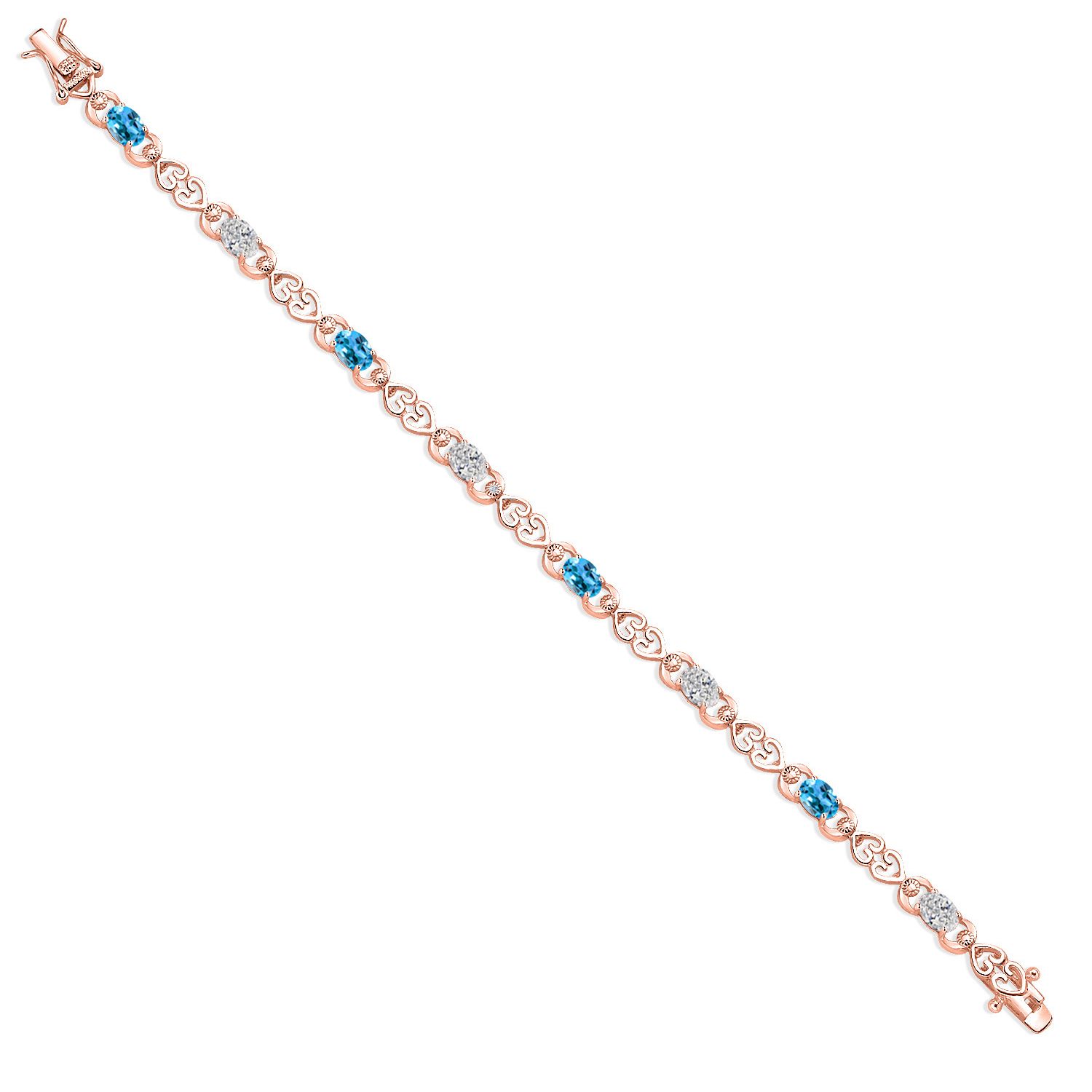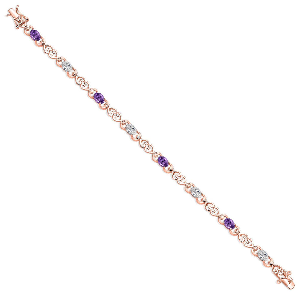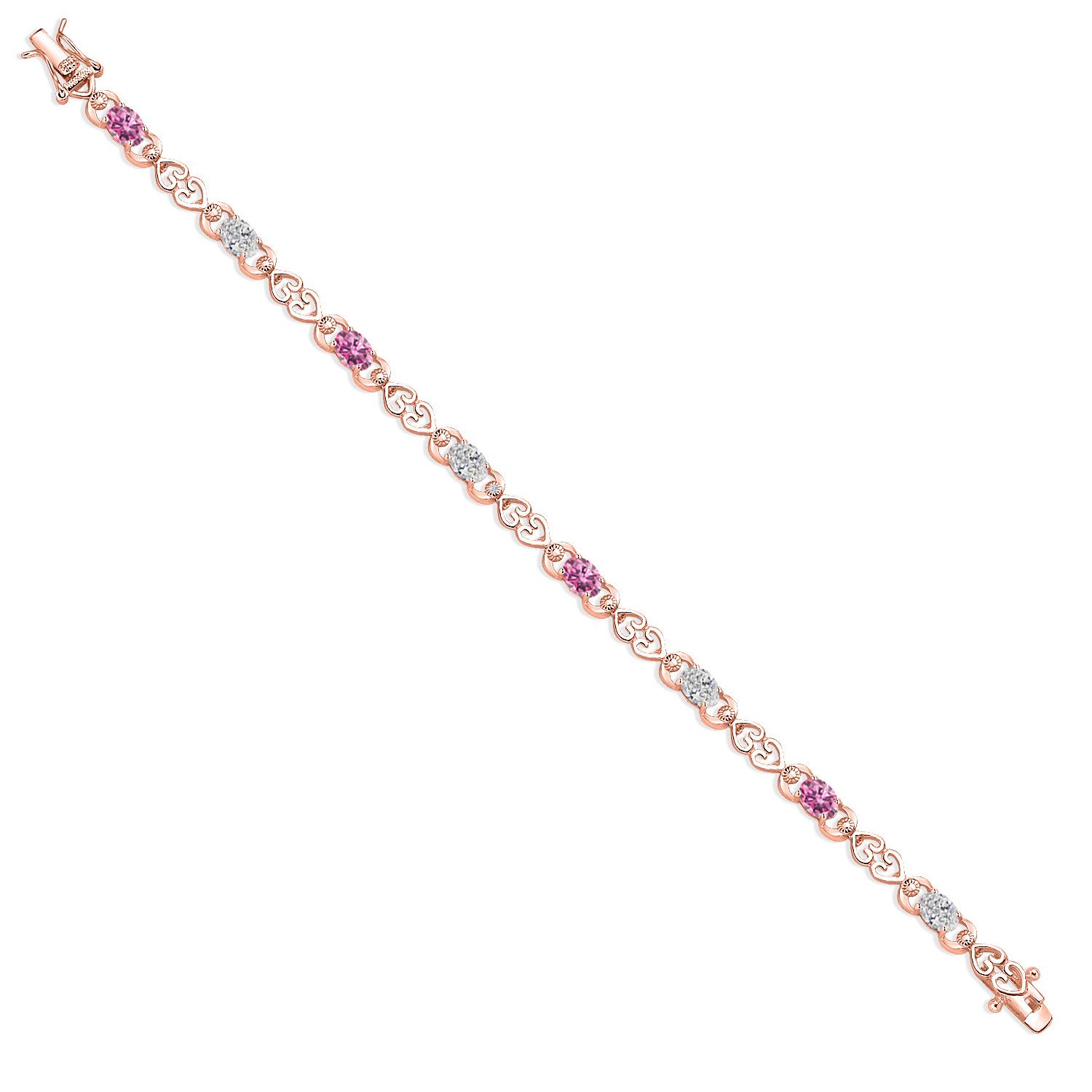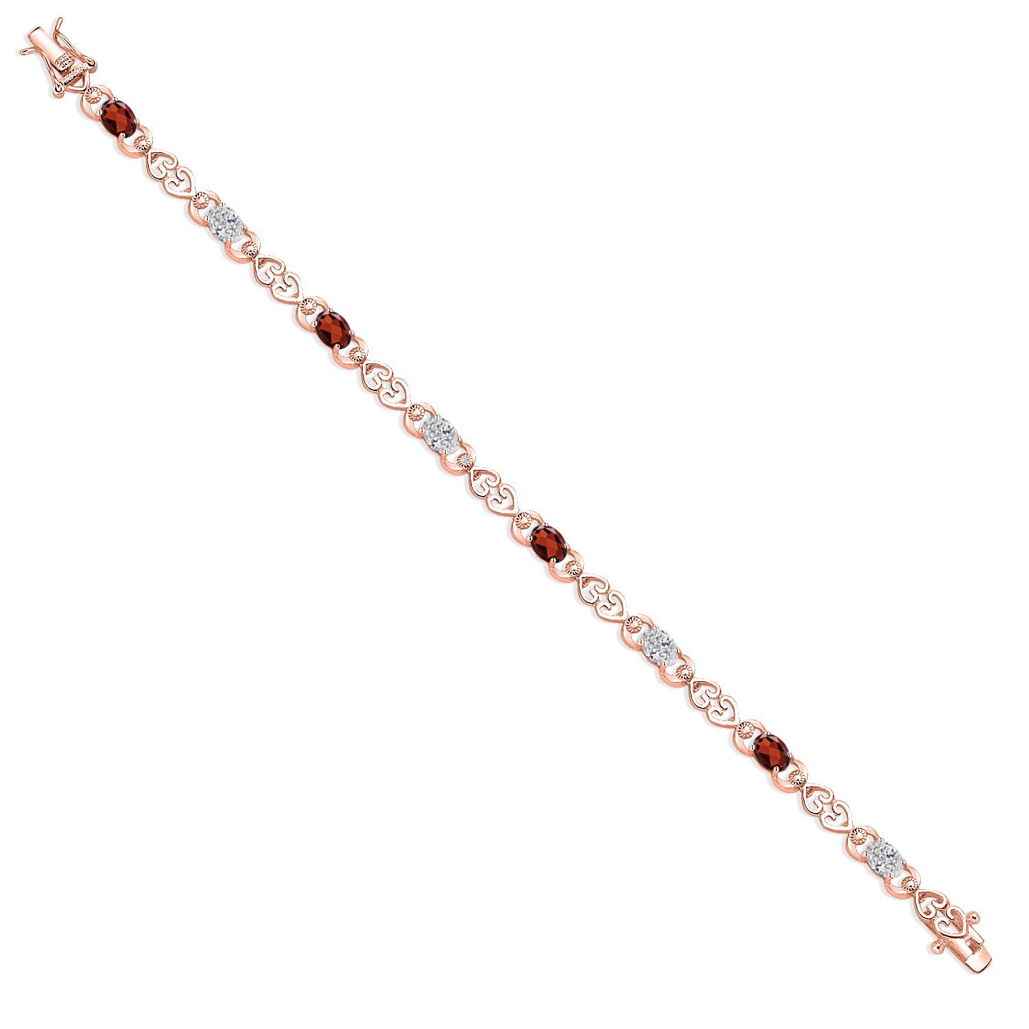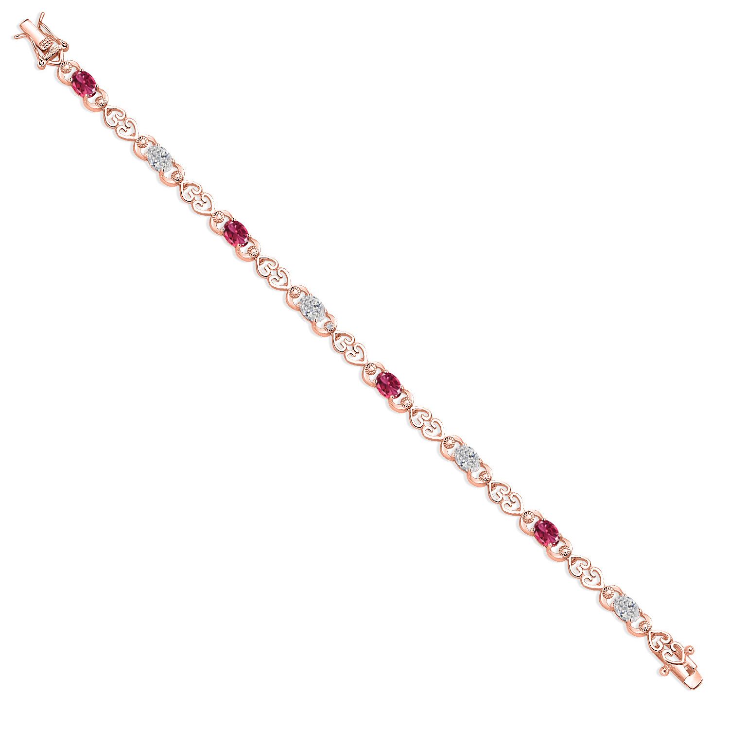 Gemstone Birthstone and White Lab Grown Diamond Heart Link Tennis Bracelet for Women | 18K Rose Gold Plated Silver | Oval 6X4MM | 7.25 Inch Length | Double Locking Fold Over Clasp