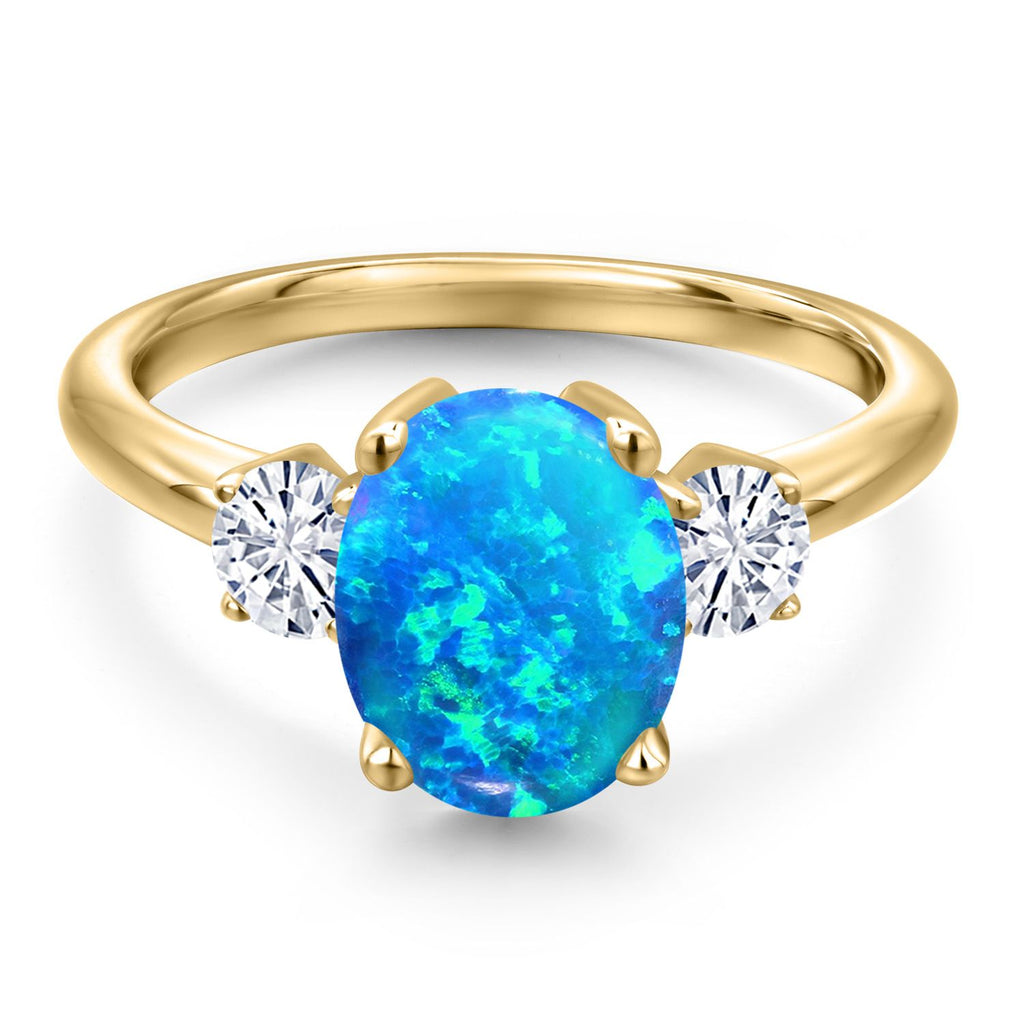 Gemstone Birthstone and White Moissanite 3-Stone Engagement Ring For Women | 18K Yellow Gold Plated Silver | Oval 10X8MM and Round 4MM | Wedding Anniversary Promise Ring | Sizes 5, 6, 7, 8, 9