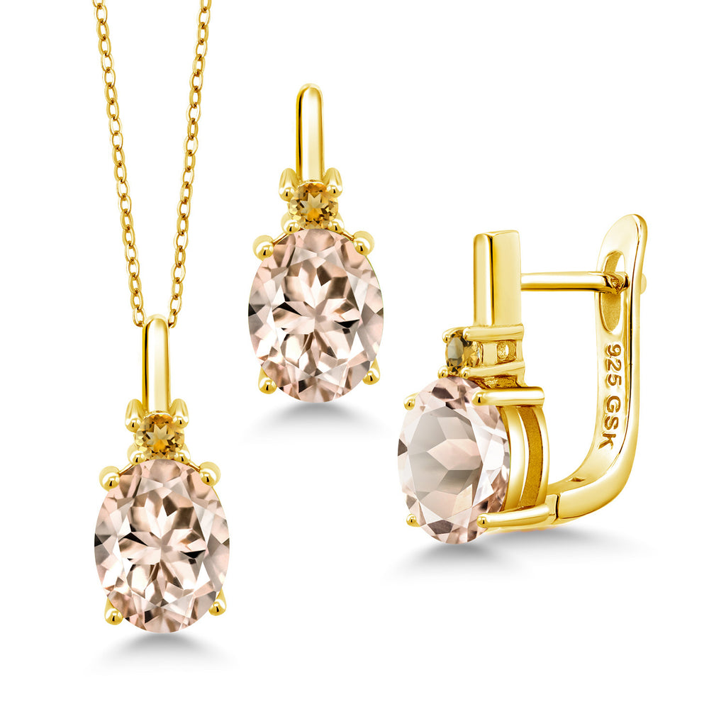 Gemstone Birthstone and Yellow Citrine Pendant and Earrings Jewelry Set for Women in 18K Yellow Gold Plated Silver | Oval 8X6MM and Round 2.5MM | With 18 Inch Chain