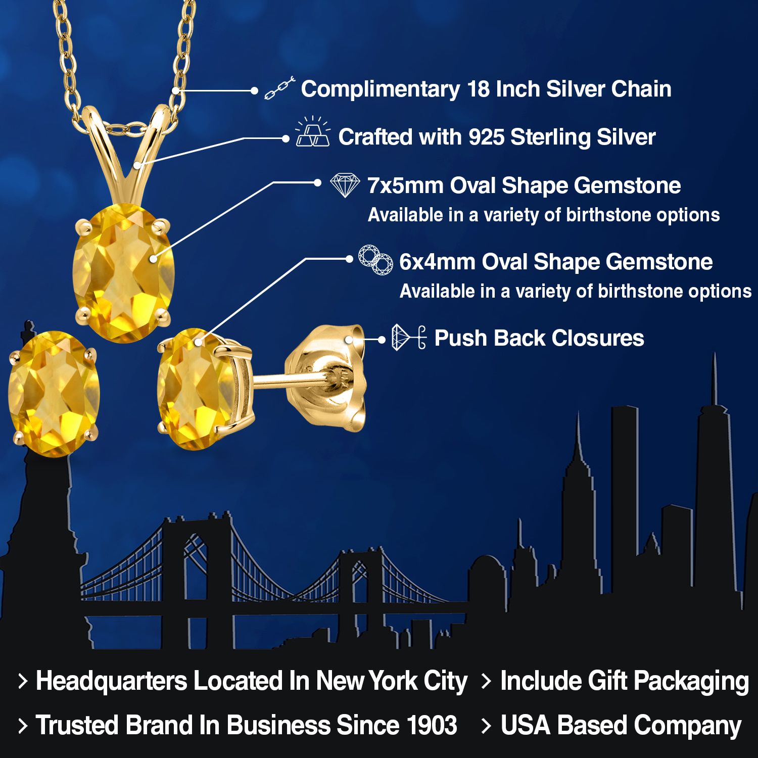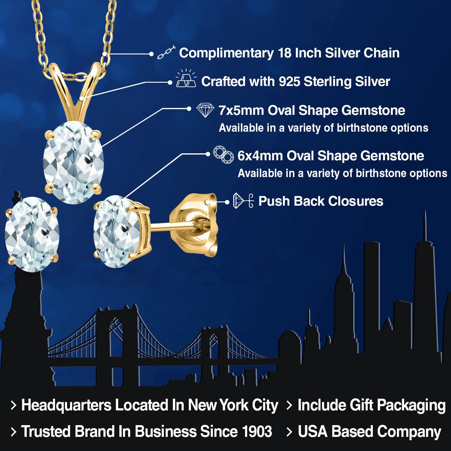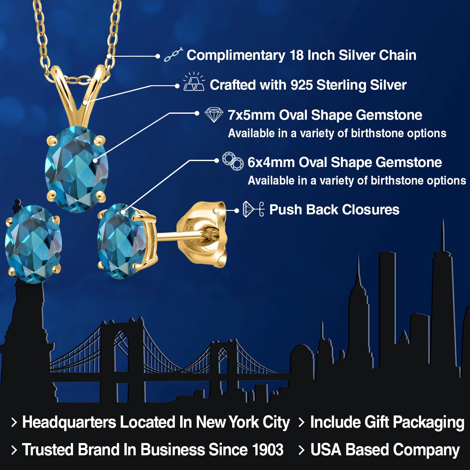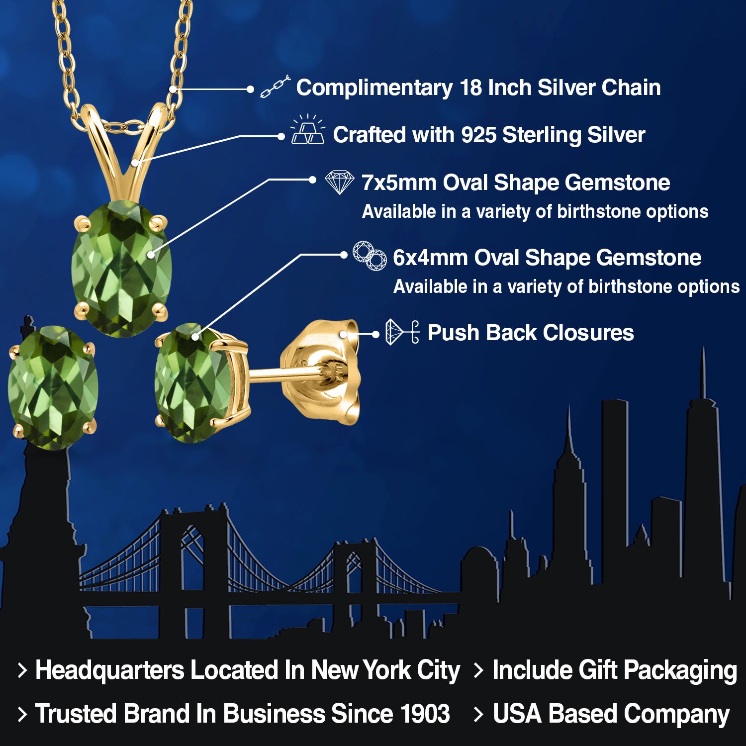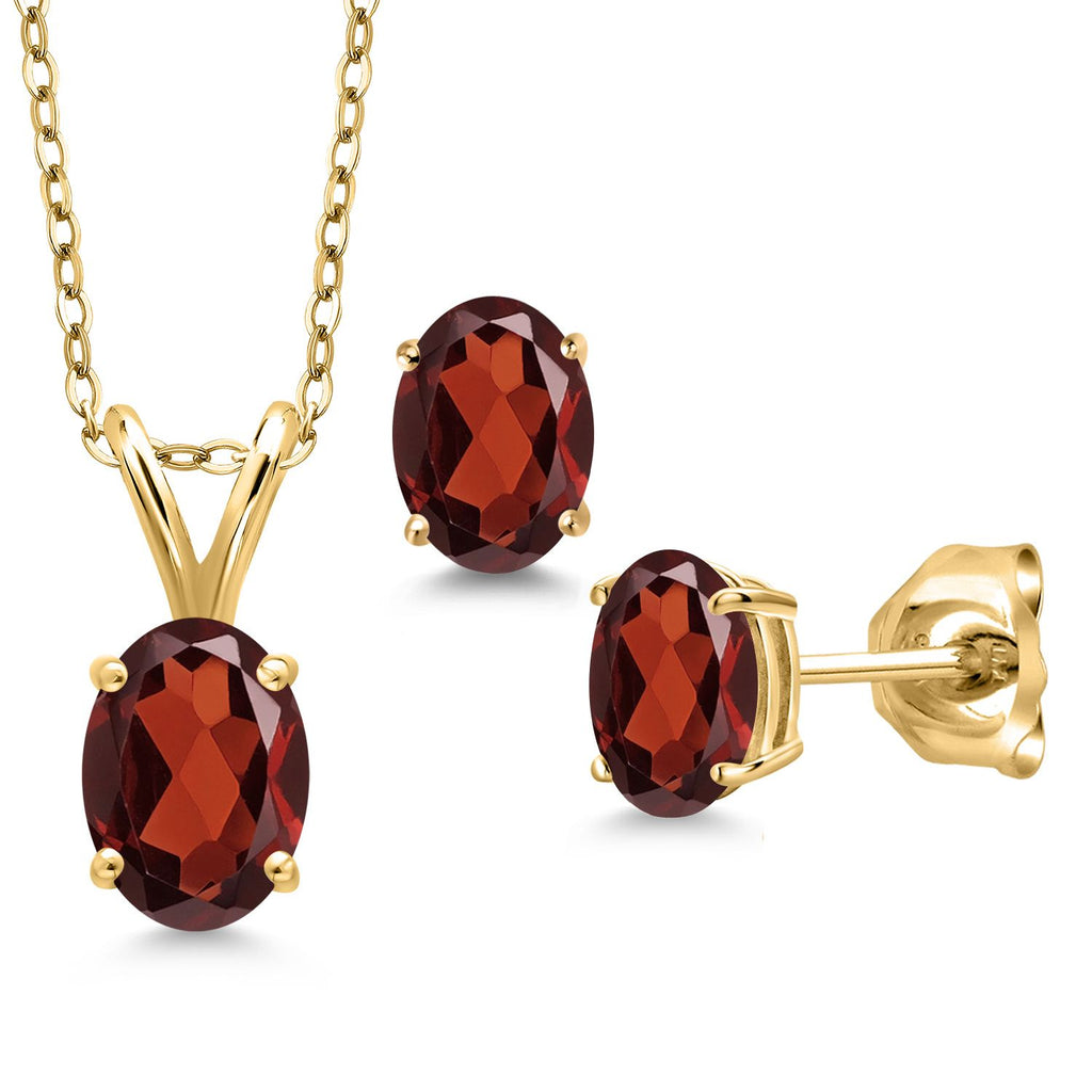 18K Yellow Gold Plated Silver Gemstone Birthstone Pendant Earrings Set for Women | Oval 7X5MM and 6X4MM | 18 Inch Chain | Jewelry Gift for Her Mom Wife