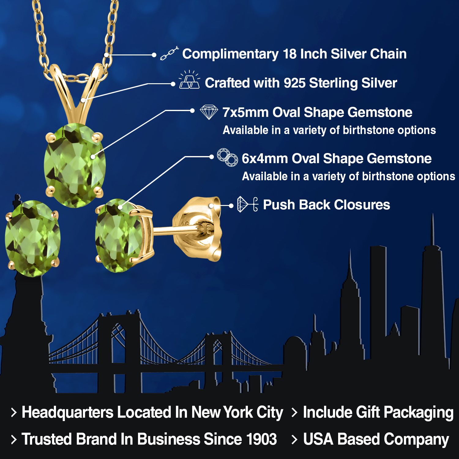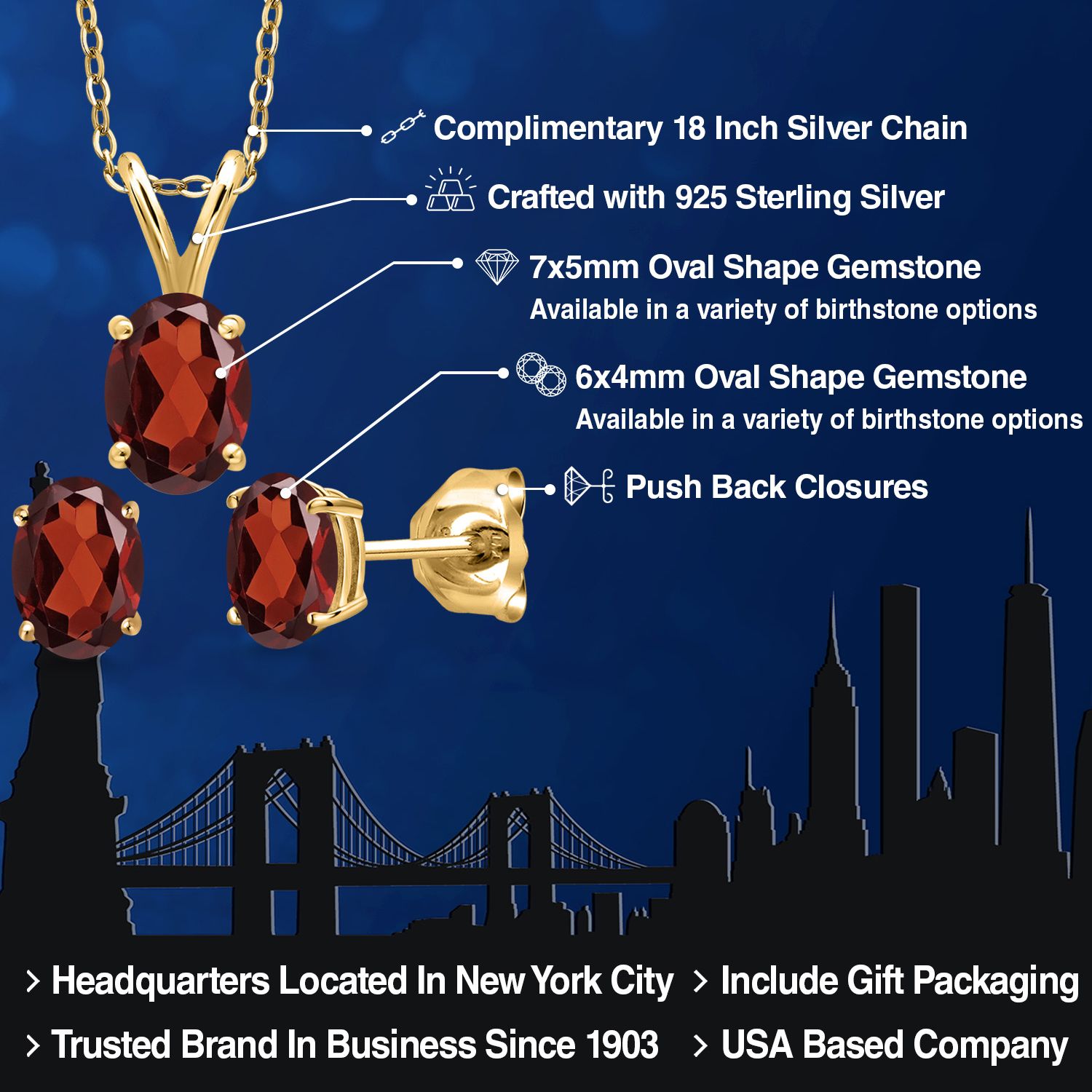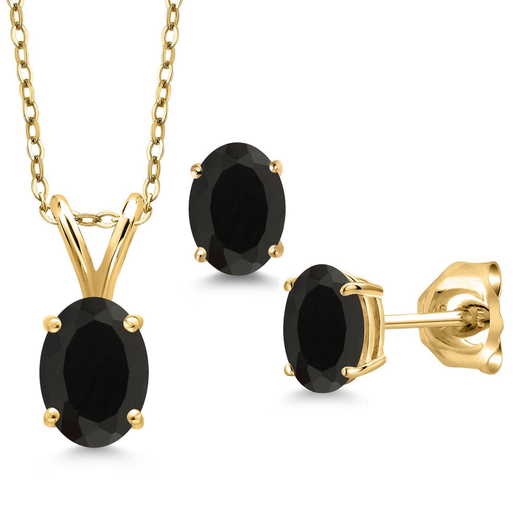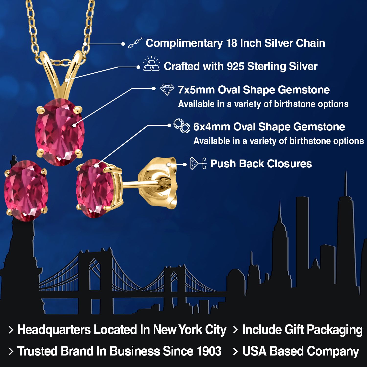 18K Yellow Gold Plated Silver Gemstone Birthstone Pendant Earrings Set for Women | Oval 7X5MM and 6X4MM | 18 Inch Chain | Jewelry Gift for Her Mom Wife