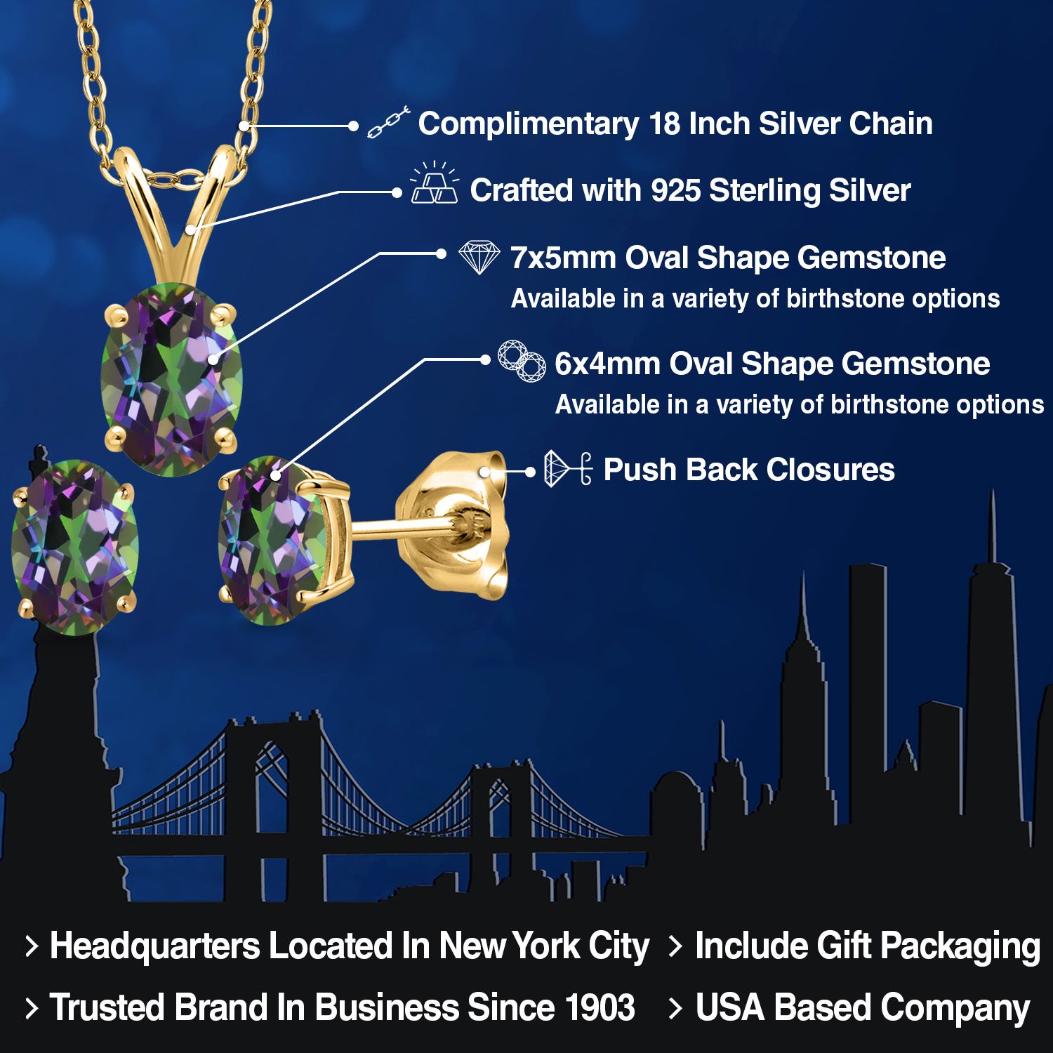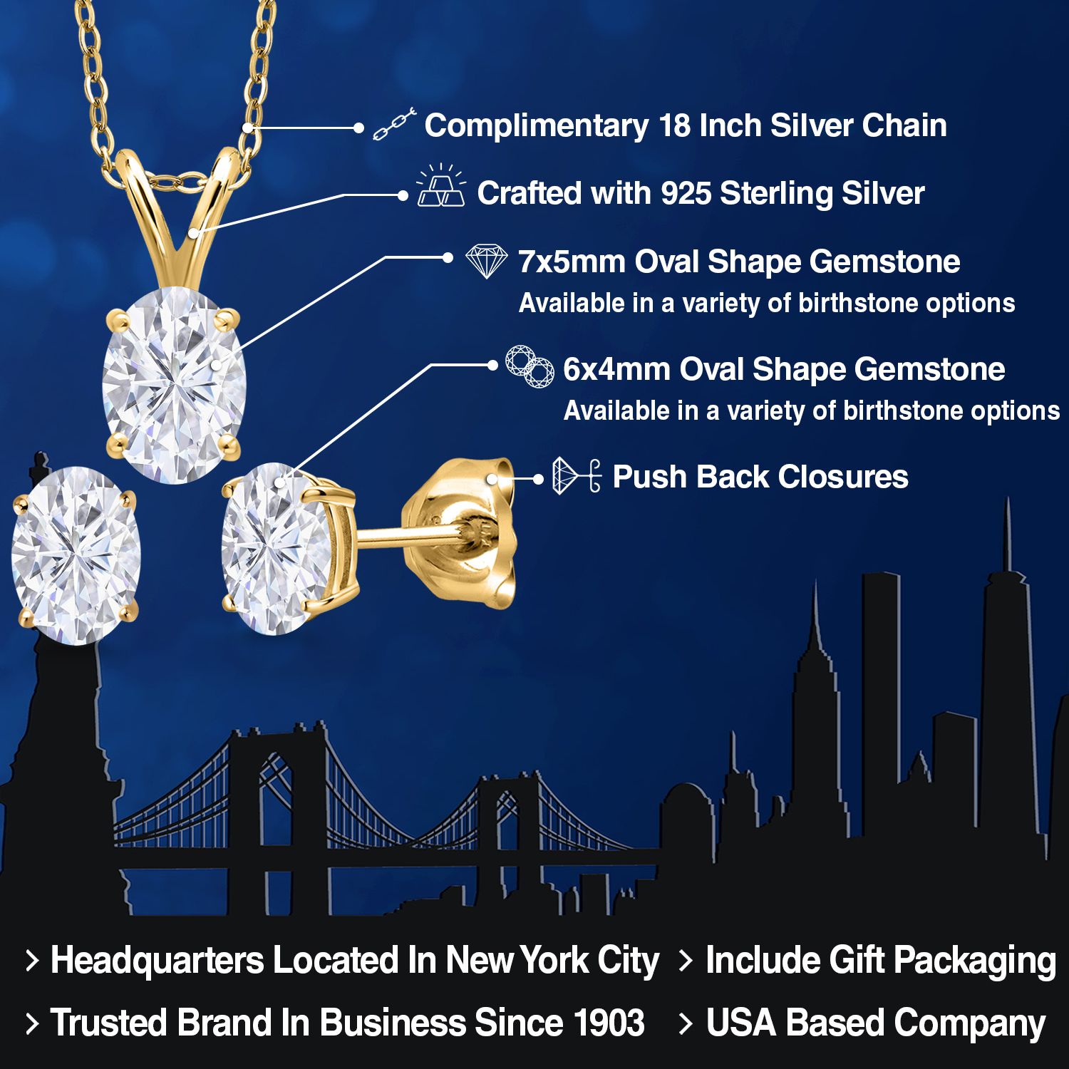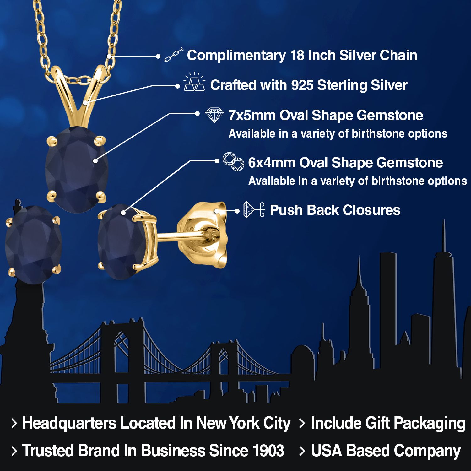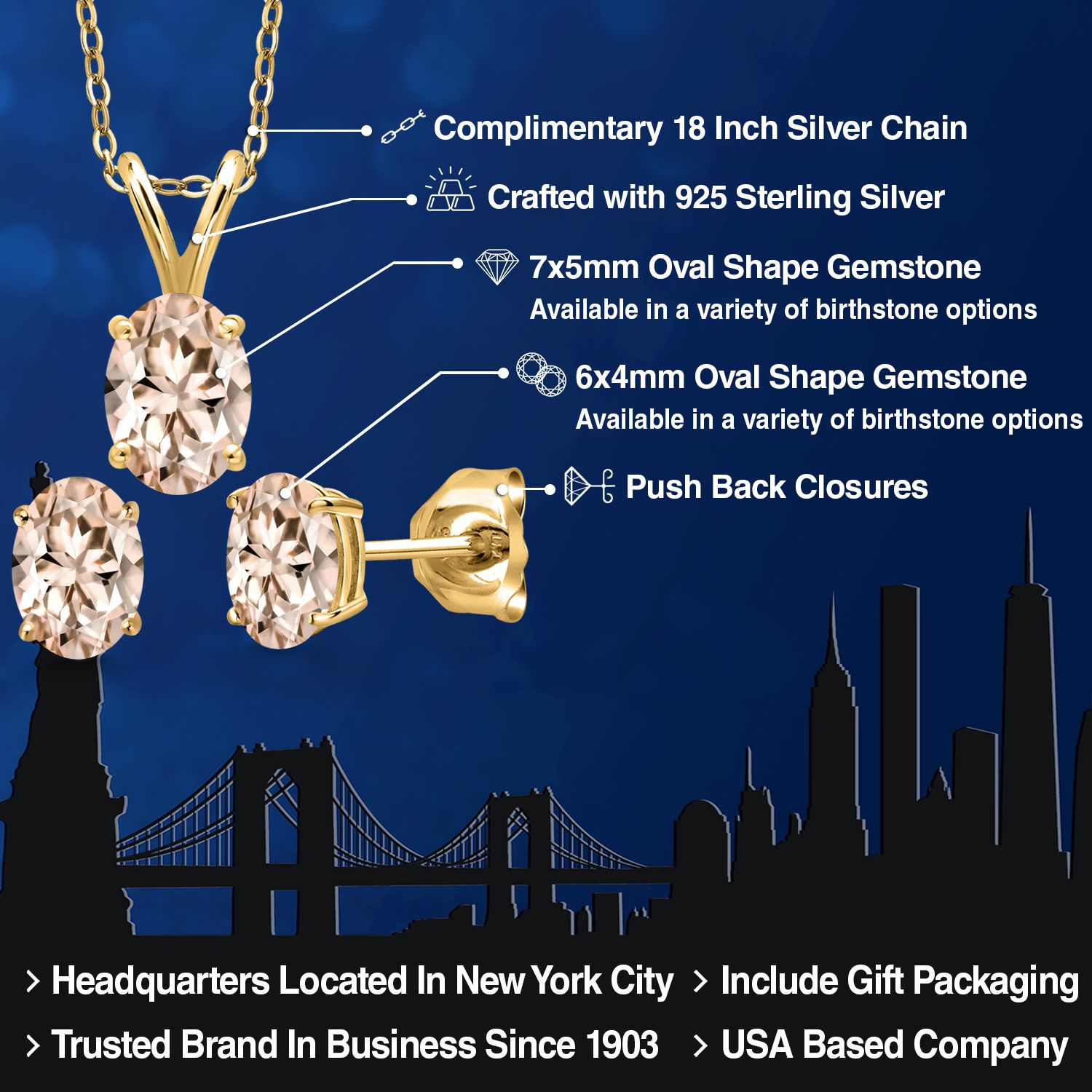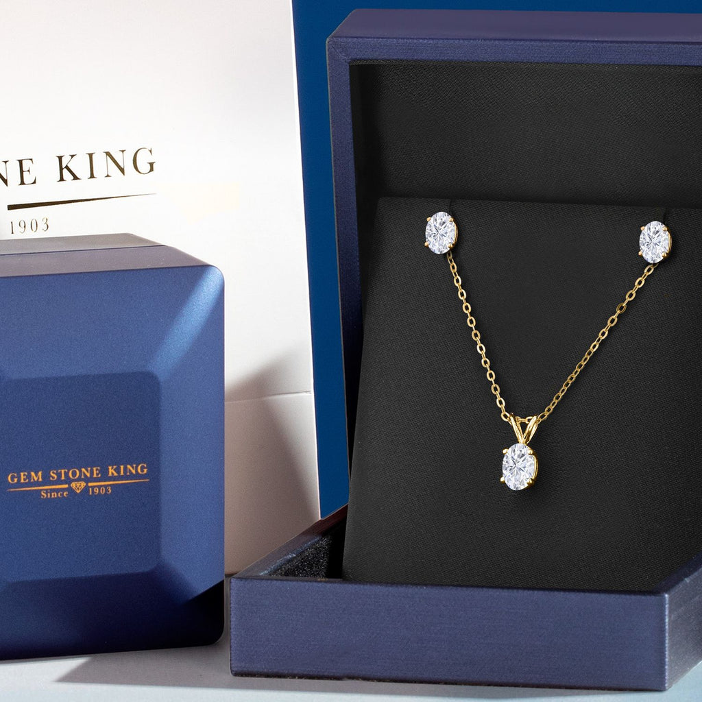 18K Yellow Gold Plated Silver Gemstone Birthstone Pendant Earrings Set for Women | Oval 7X5MM and 6X4MM | 18 Inch Chain | Jewelry Gift for Her Mom Wife