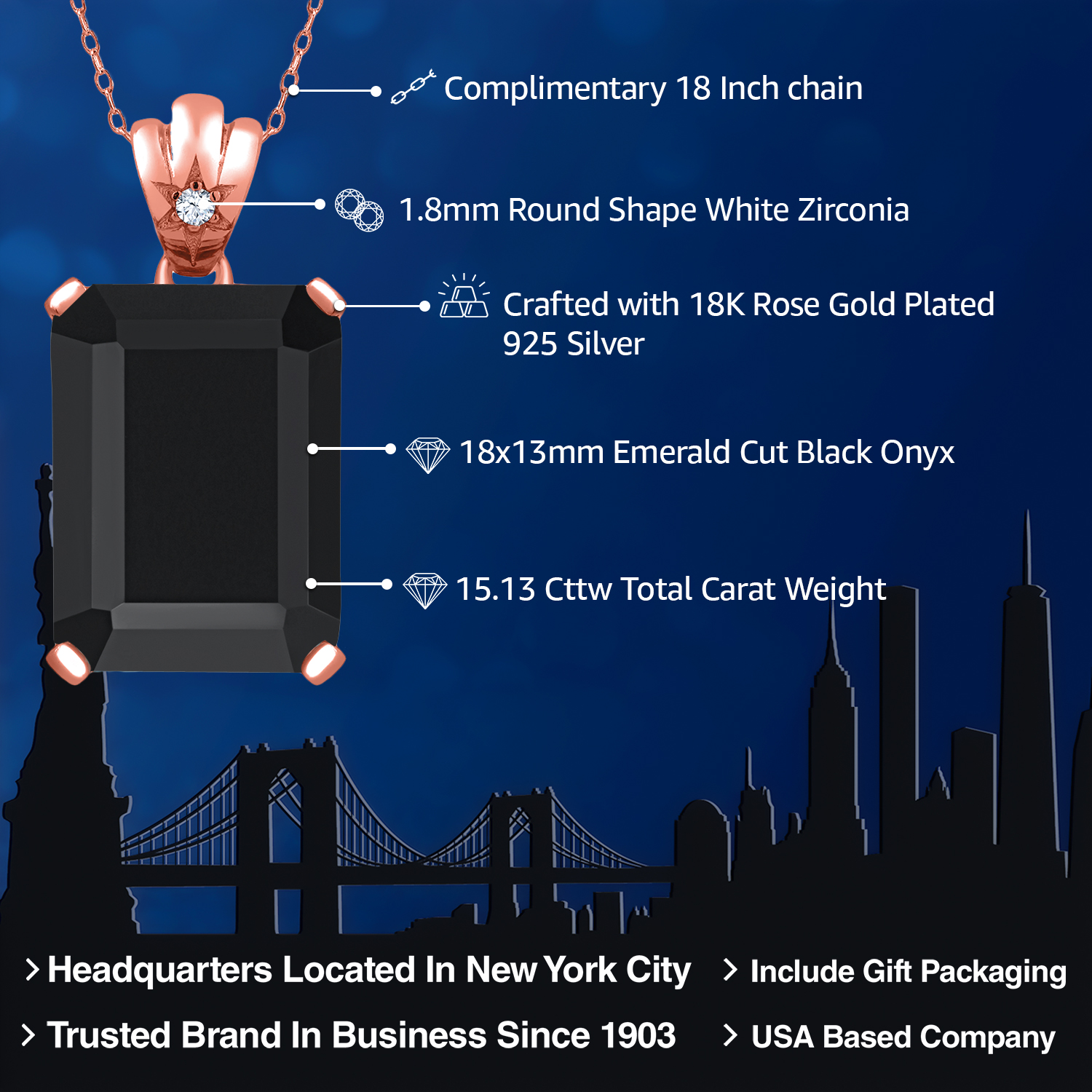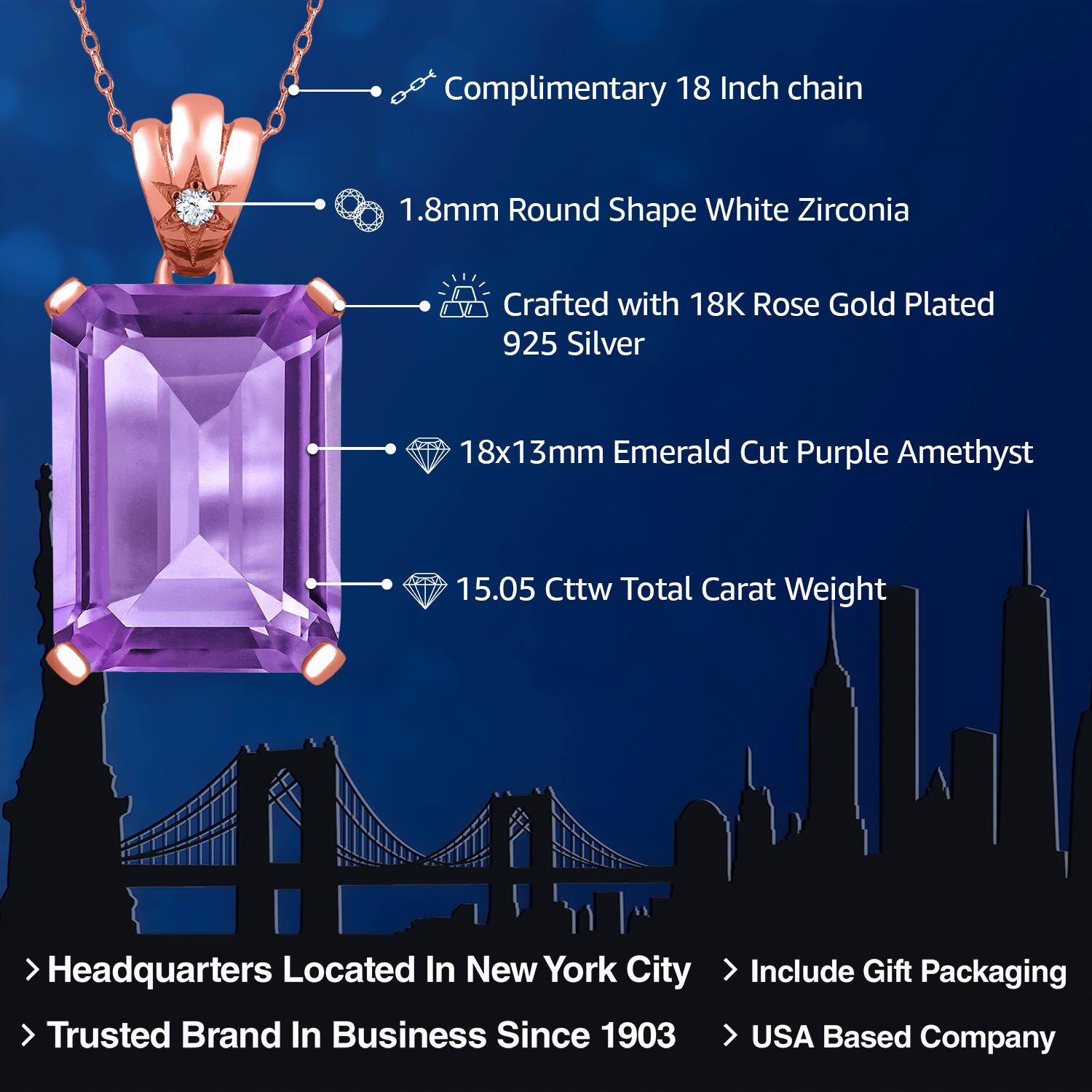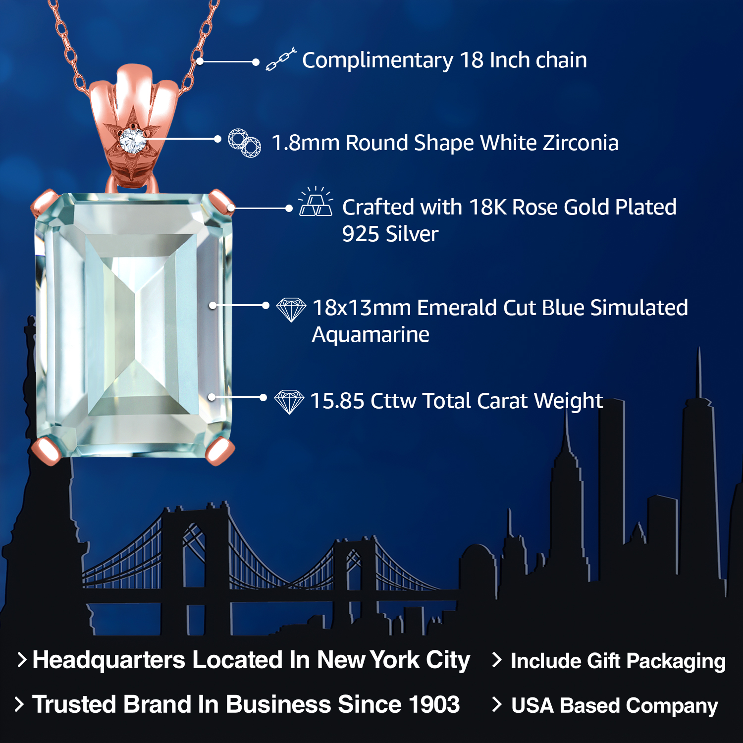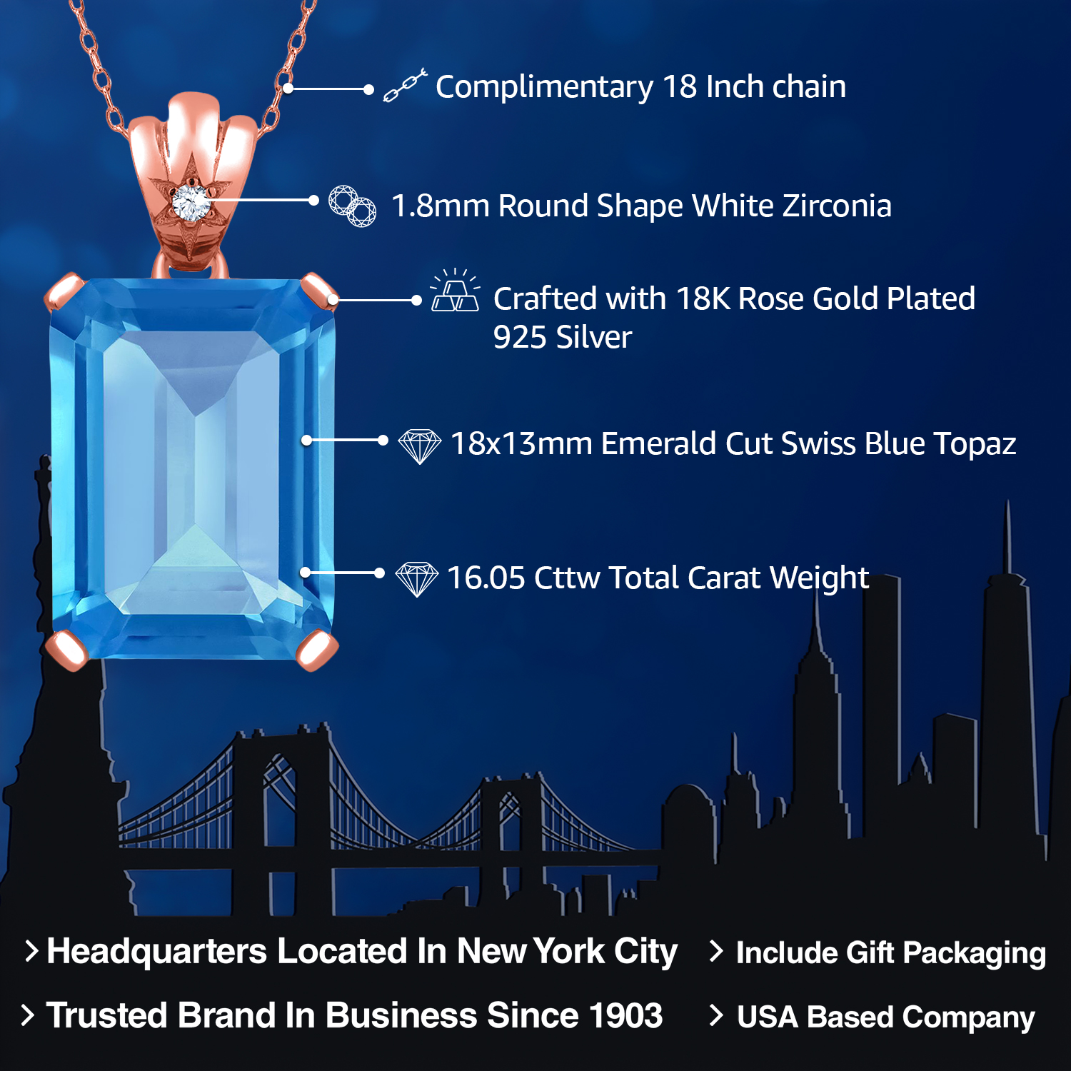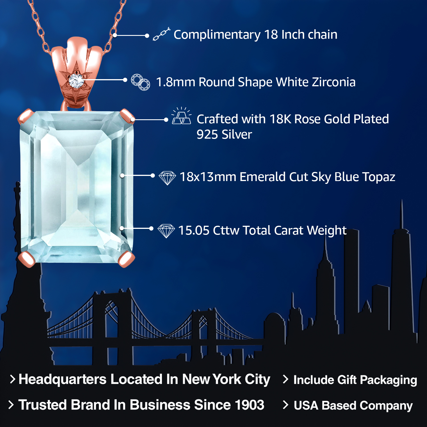 Gemstone Birthstone Pendant Necklace in 18K Rose Gold Plated Silver | Emerald Cut 18X13MM Center Stone & Round 1.8MM Accent | Fine Jewelry Gifts for Her Mom Women Wife | Includes 18 Inch Chain