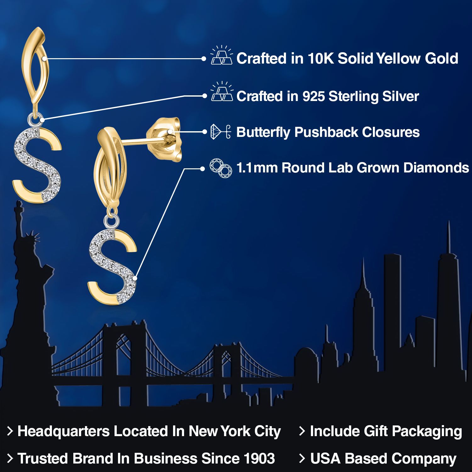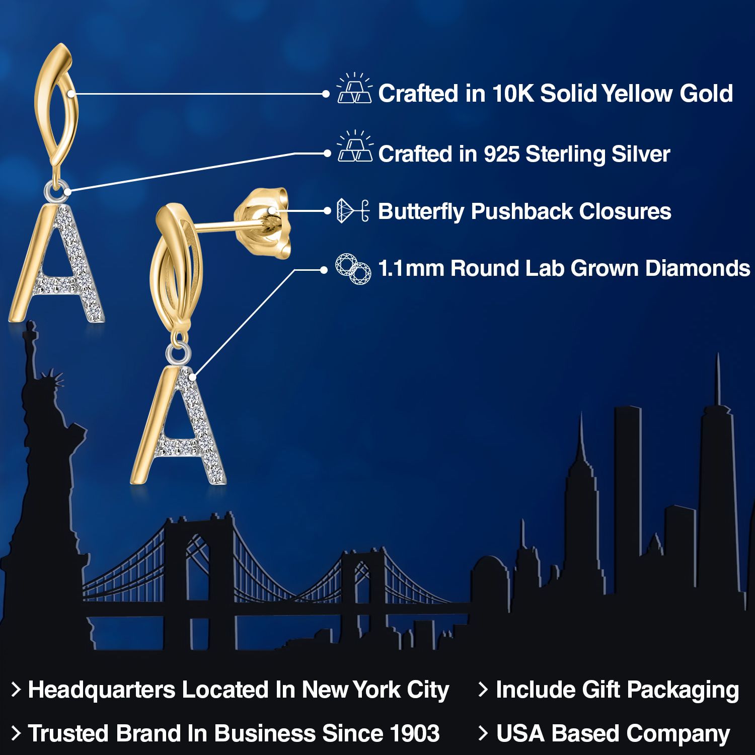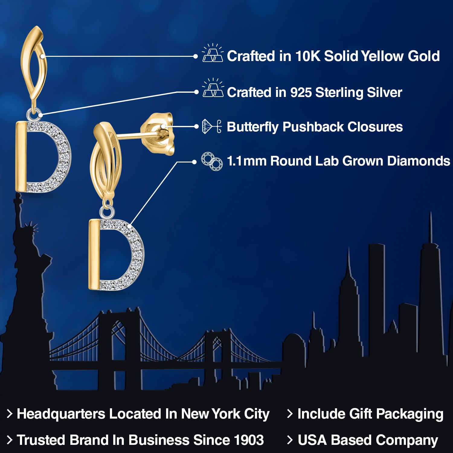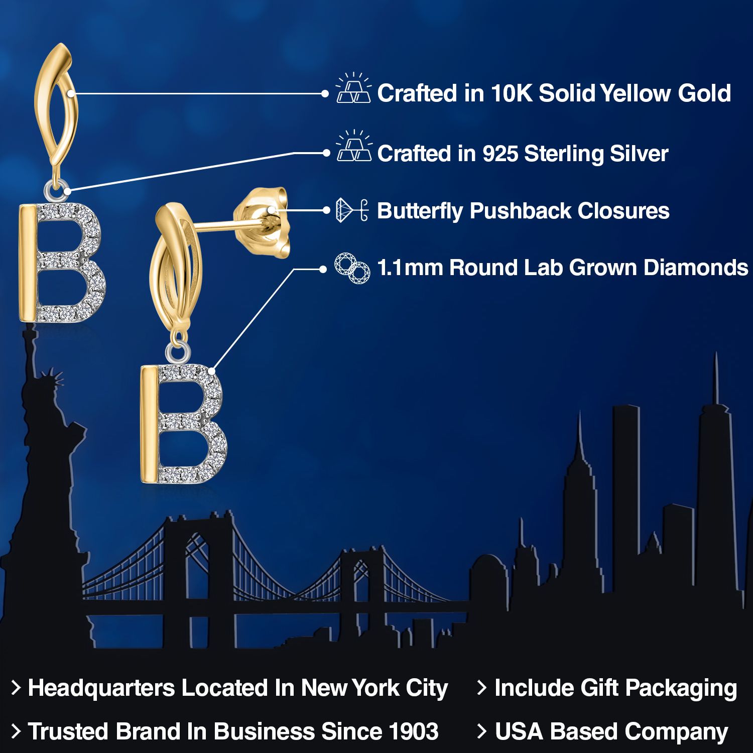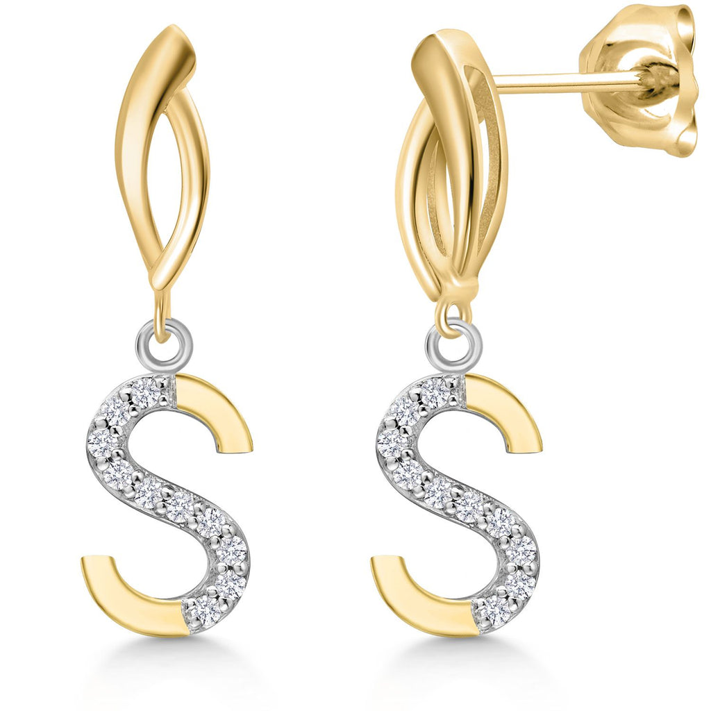 Initial Earrings Letter A to Z Alphabet | 10K Yellow Gold and 925 Sterling Silver | Lab Grown Diamond | Gift Women Mother's Day Wife Mom Girlfriend Anniversary Birthday | By Keren Hanan