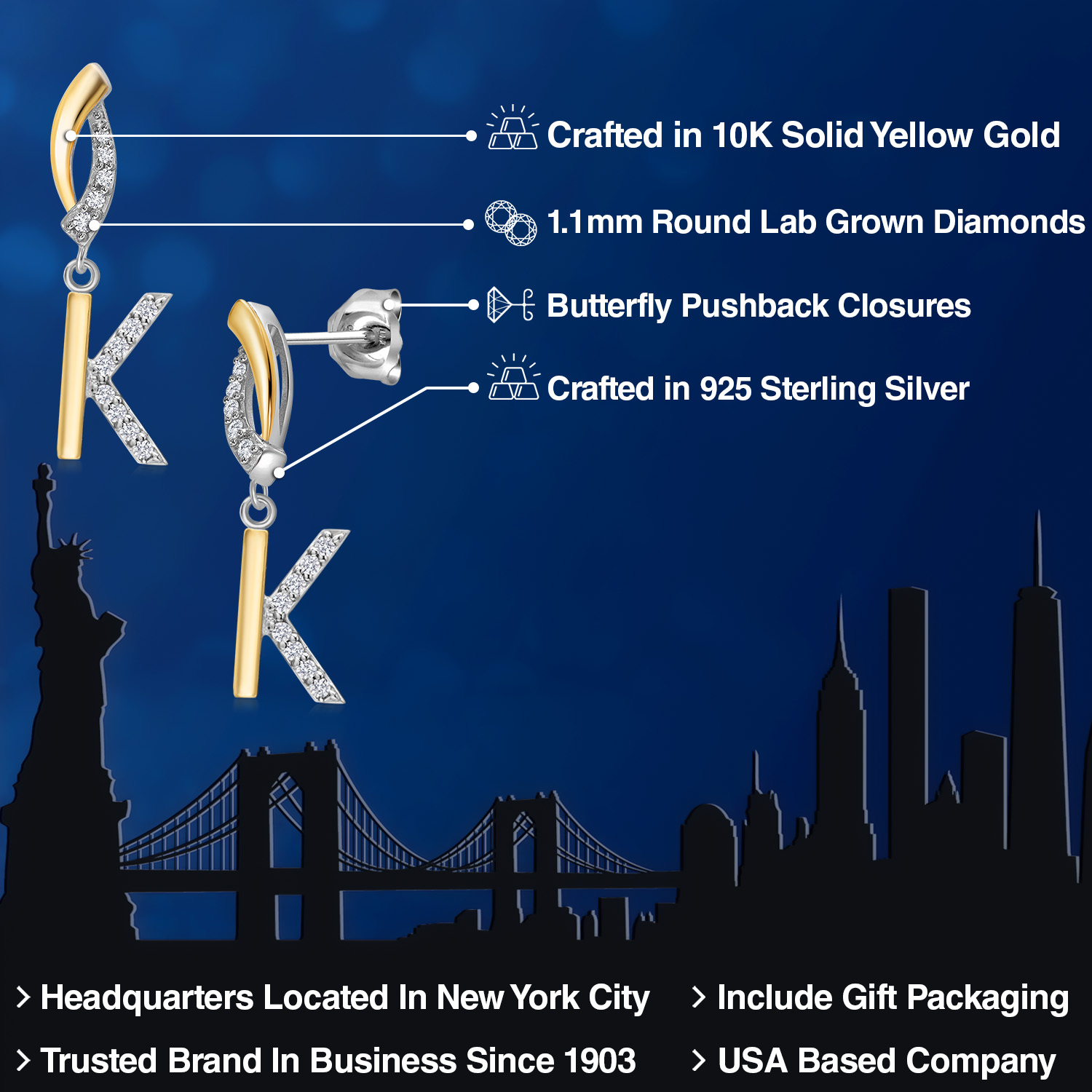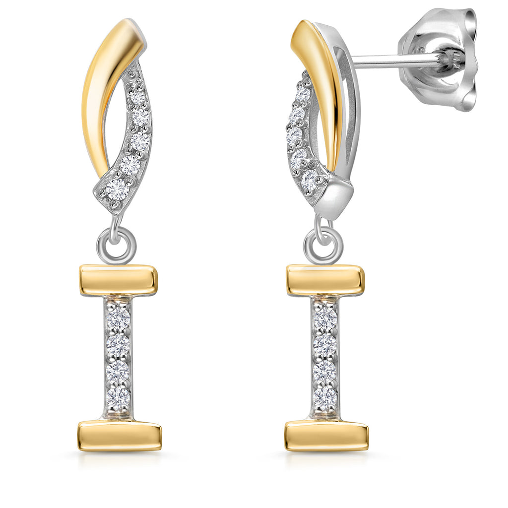 Initial Earrings Letter A to Z Alphabet | 10K Yellow Gold and 925 Sterling Silver | White Lab Grown Diamond | Gift Women Mother's Day Wife Mom Girlfriend Anniversary Birthday | By Keren Hanan