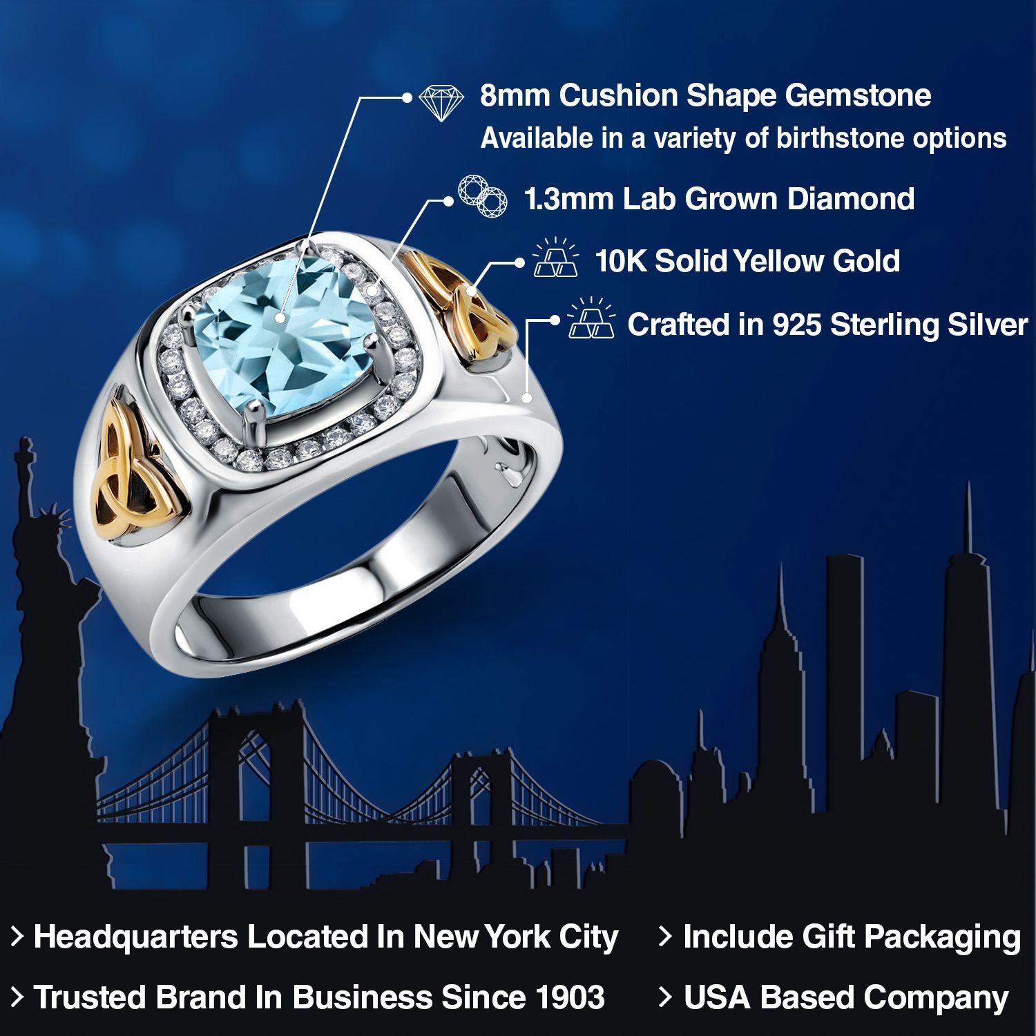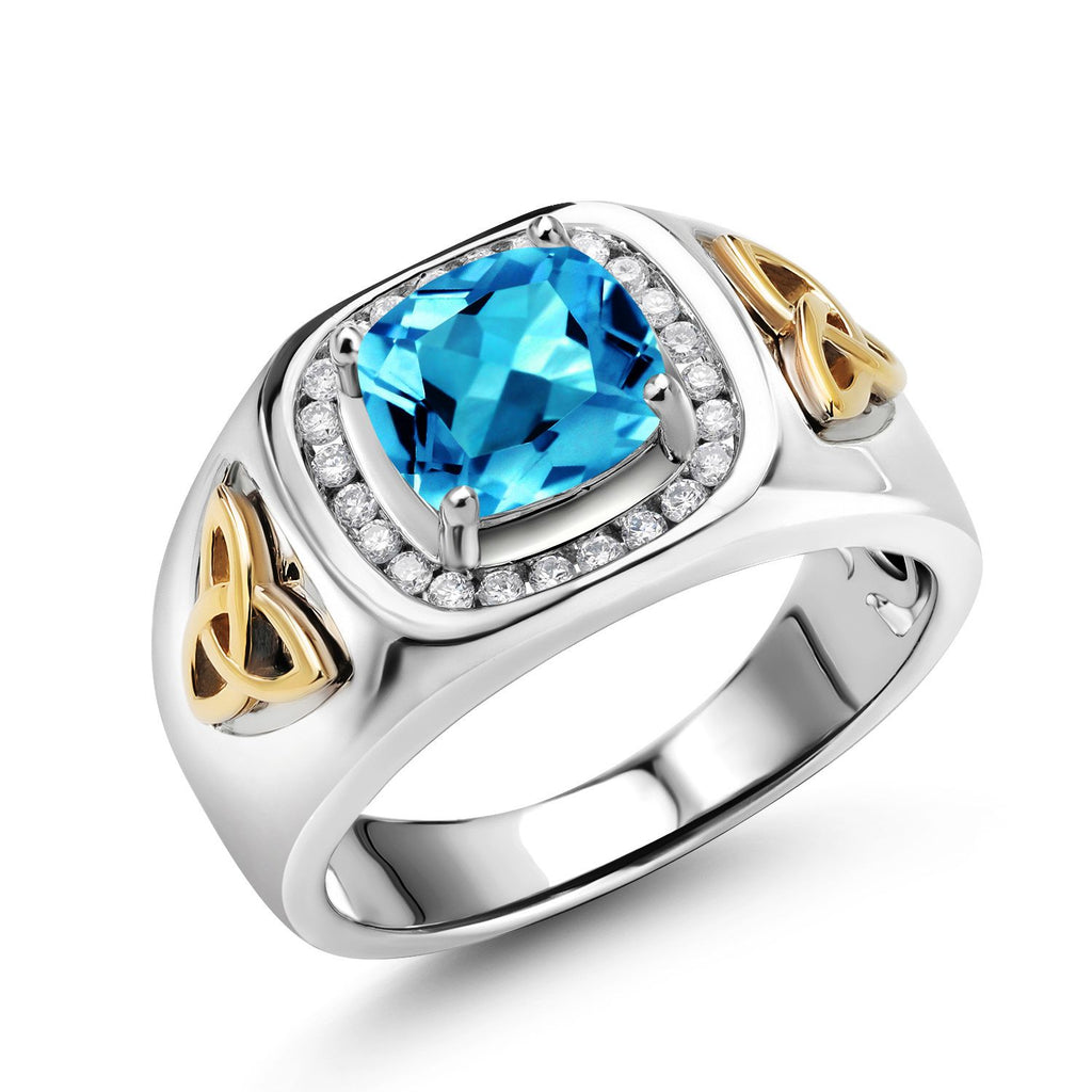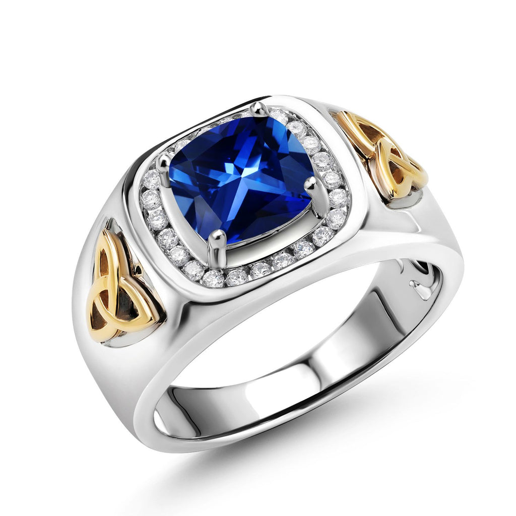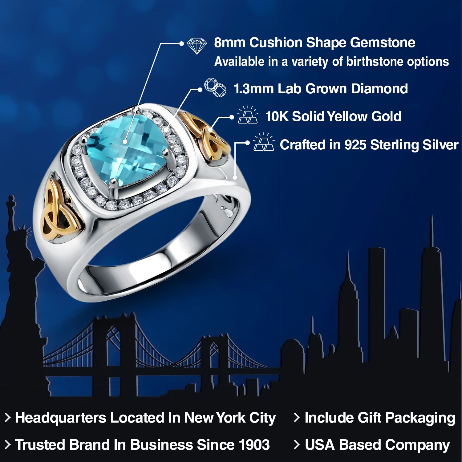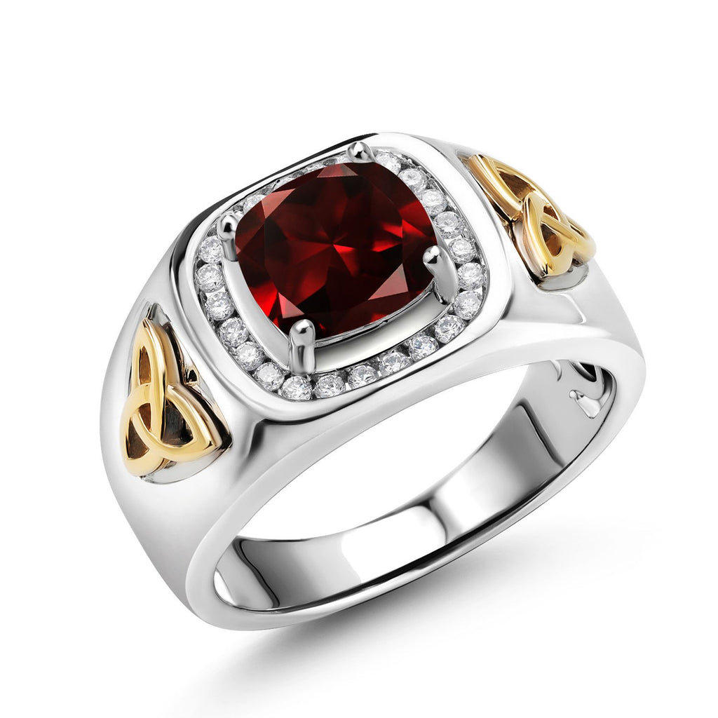 8MM Cushion Cut Ring for Men | Gemstone Birthstone and White Lab Grown Diamond | 925 Silver and 10K Yellow Gold | Available In Size 7, 8, 9, 10, 11, 12, 13