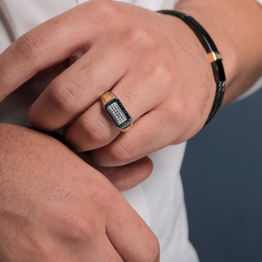 STRIKING CONTRAST: This men's ring showcases a captivating blend of 925 sterling silver and 10K yellow gold, adorned with a combination of black diamonds and white lab-grown diamonds, creating a visually stunning contrast.