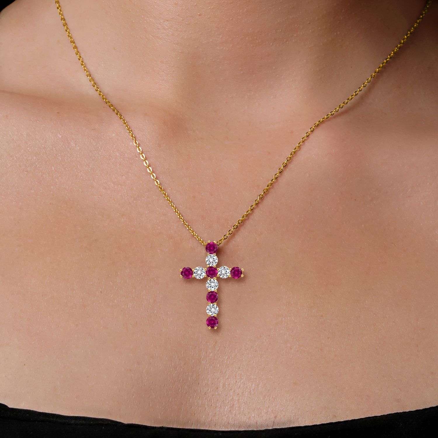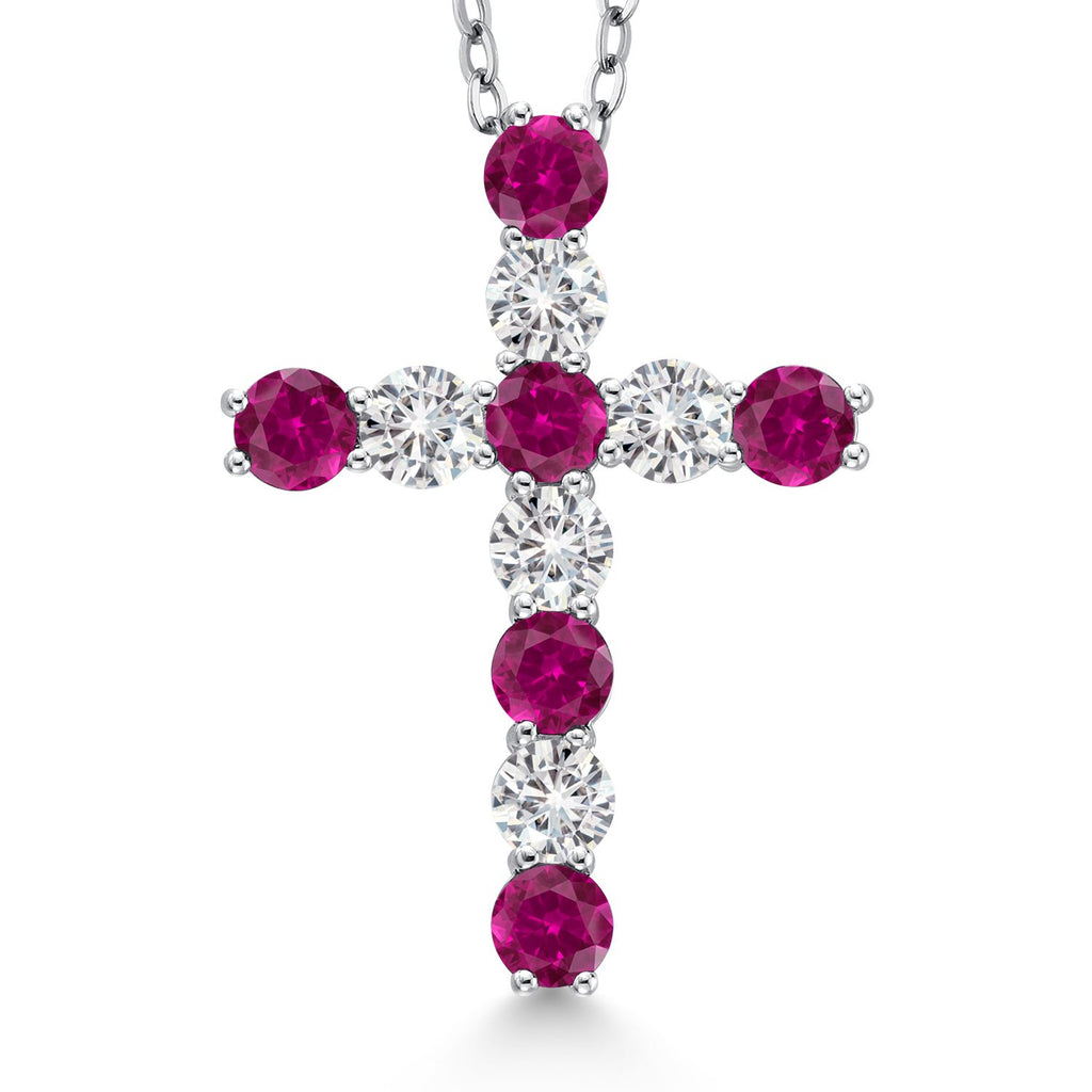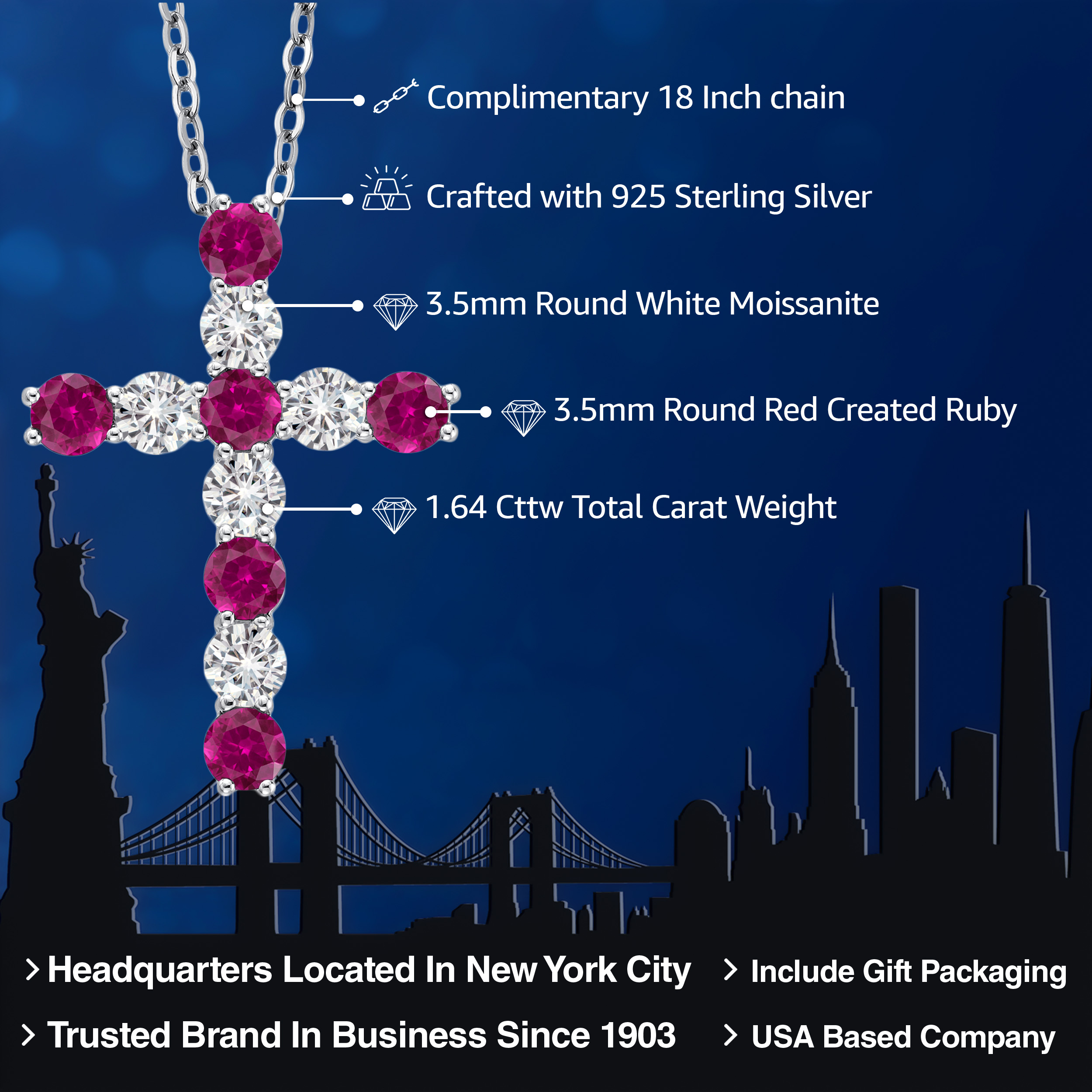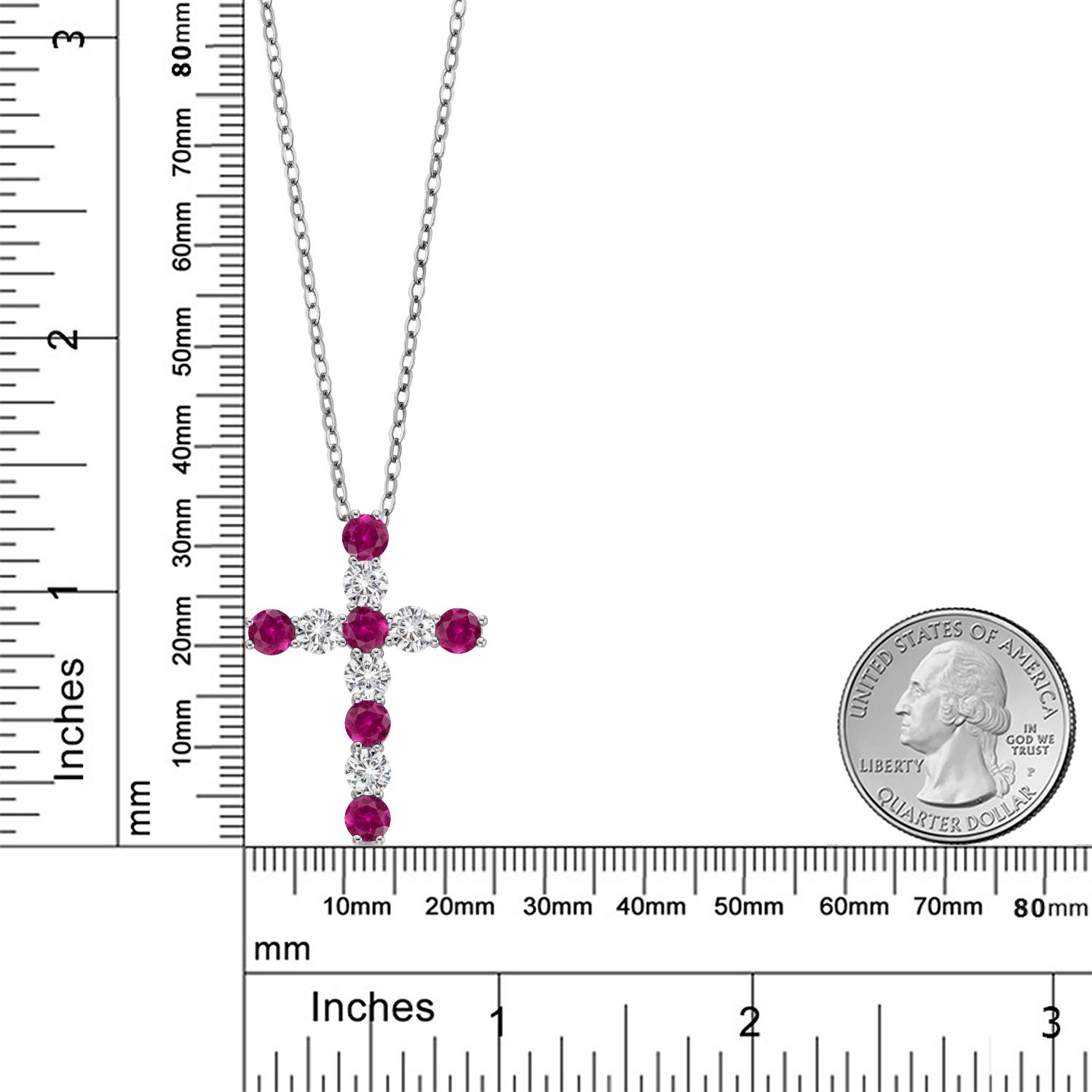 EXQUISITE DESIGN: This cross pendant necklace features a captivating design with the choice of Moissanite and red created ruby gemstones. The round-cut stones, each measuring 3.5mm, create a stunning contrast against the 925 sterling silver setting. The combination of Moissanite's brilliance and the rich color of the created gemstones results in a striking and eye-catching piece of jewelry.