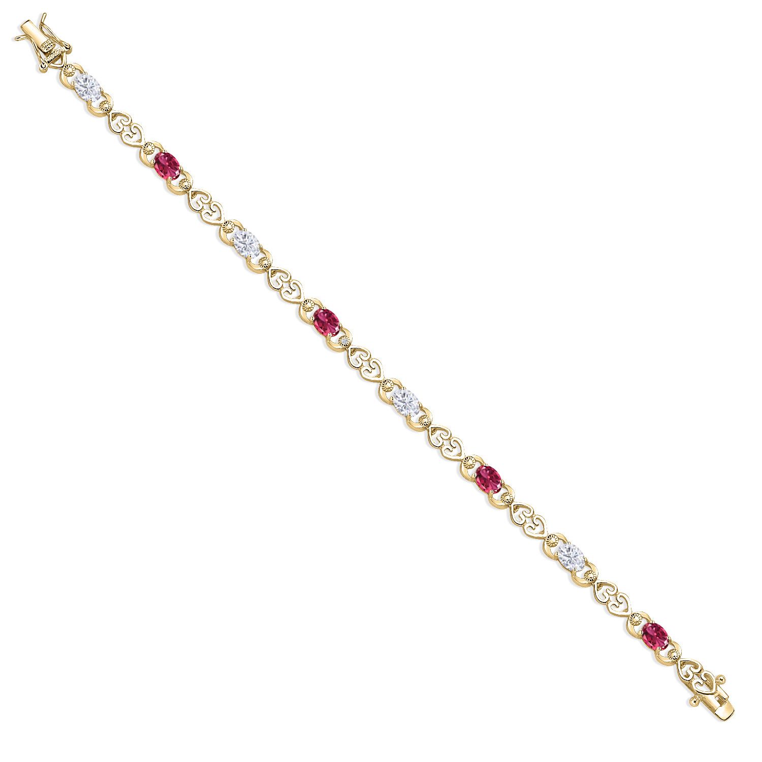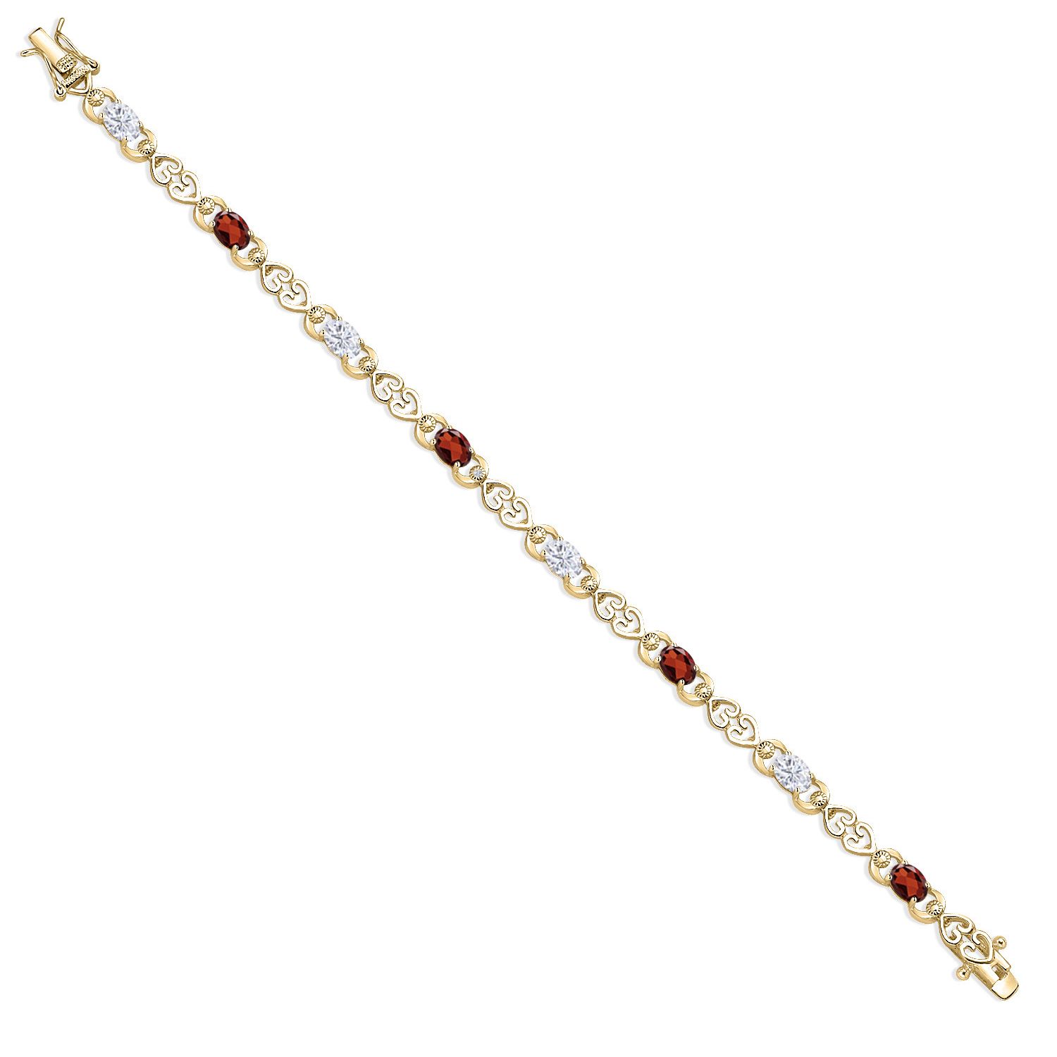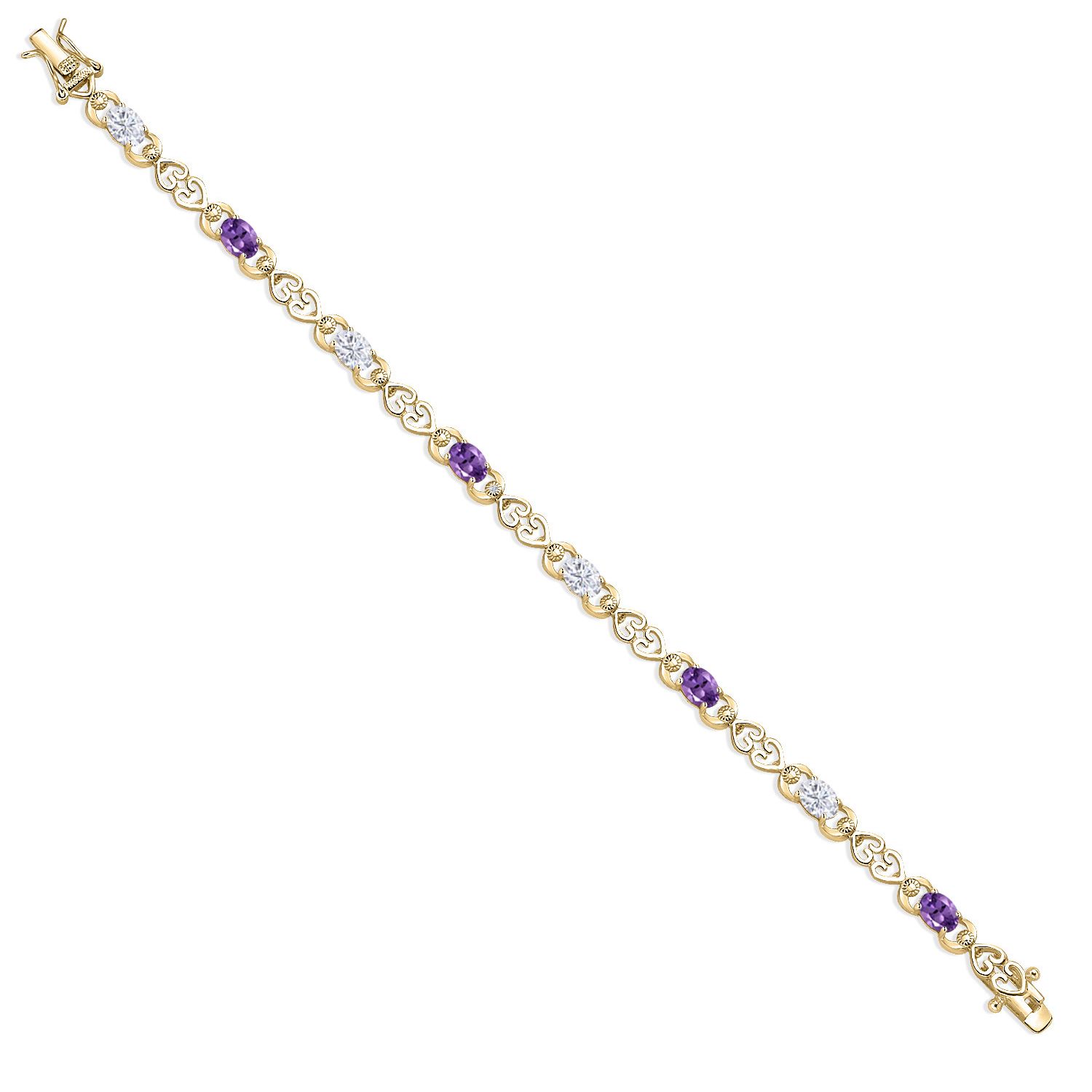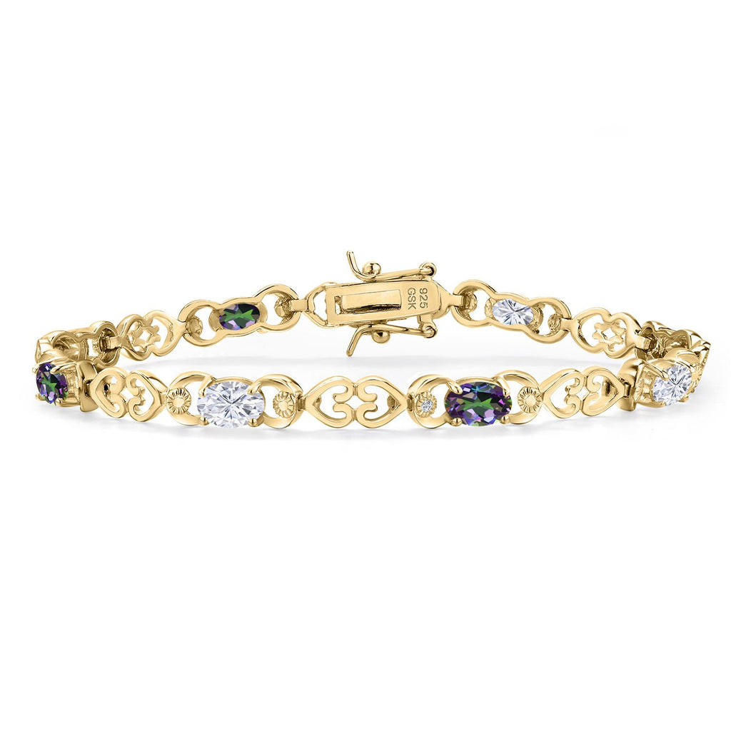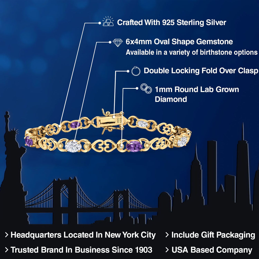 Moissanite and Gemstone Birthstone Heart Link Tennis Bracelet for Women | 18K Yellow Gold Plated Silver | Oval 6X4MM | 7.25 Inch Length | Double Locking Fold Over Clasp | Jewelry for Her Mom Wife