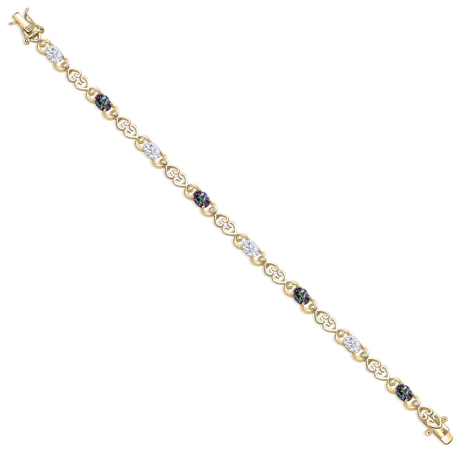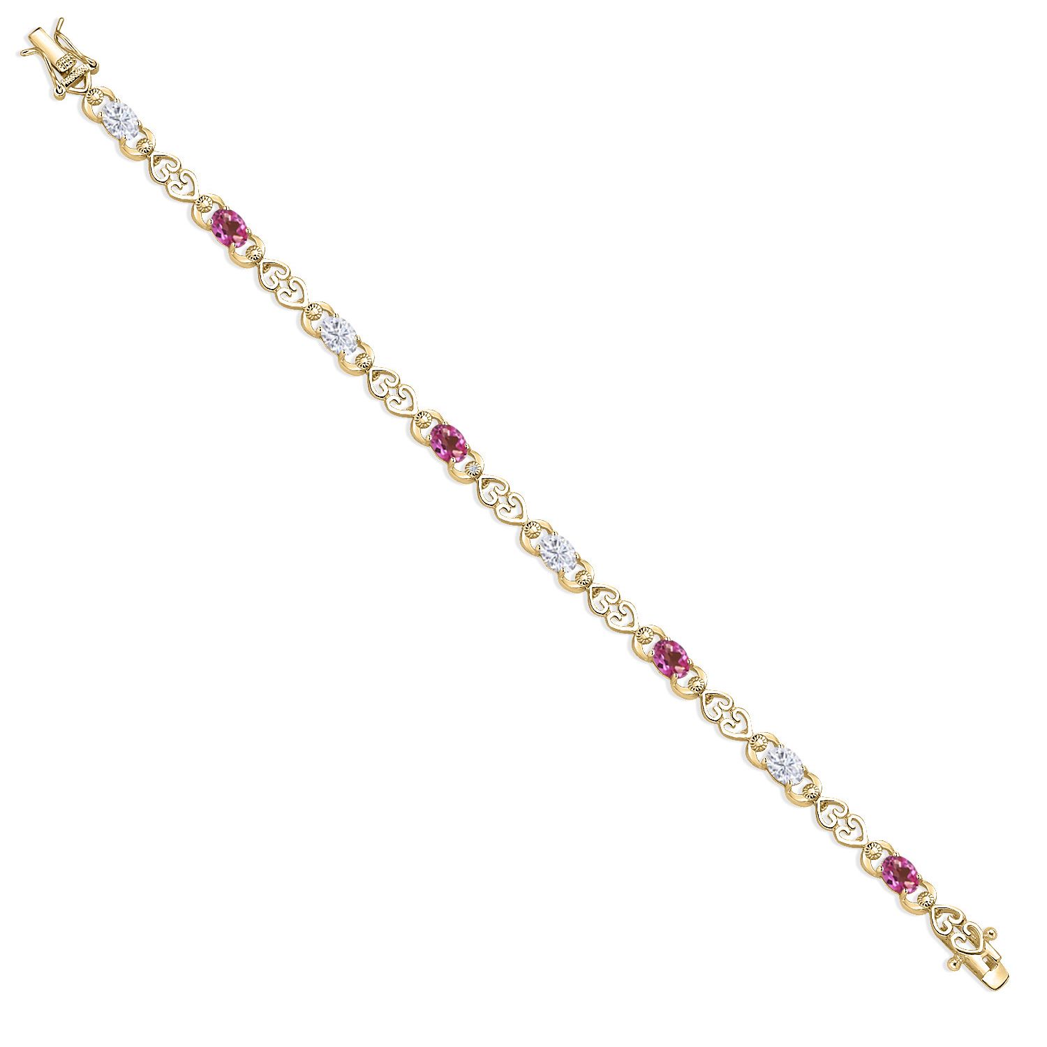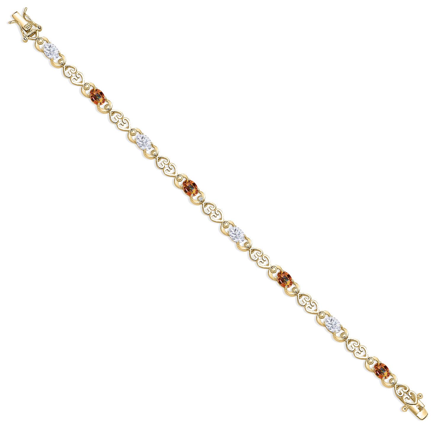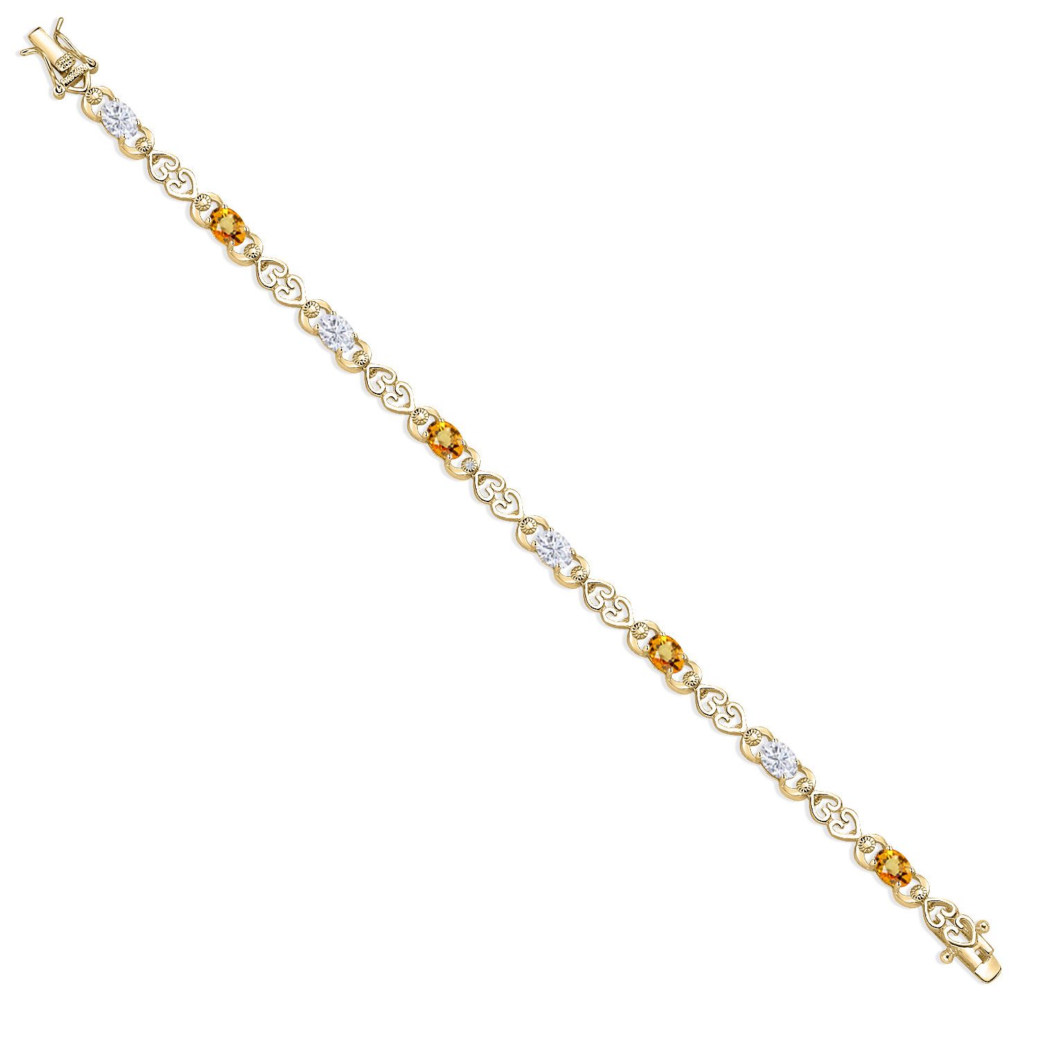 Moissanite and Gemstone Birthstone Heart Link Tennis Bracelet for Women | 18K Yellow Gold Plated Silver | Oval 6X4MM | 7.25 Inch Length | Double Locking Fold Over Clasp | Jewelry for Her Mom Wife